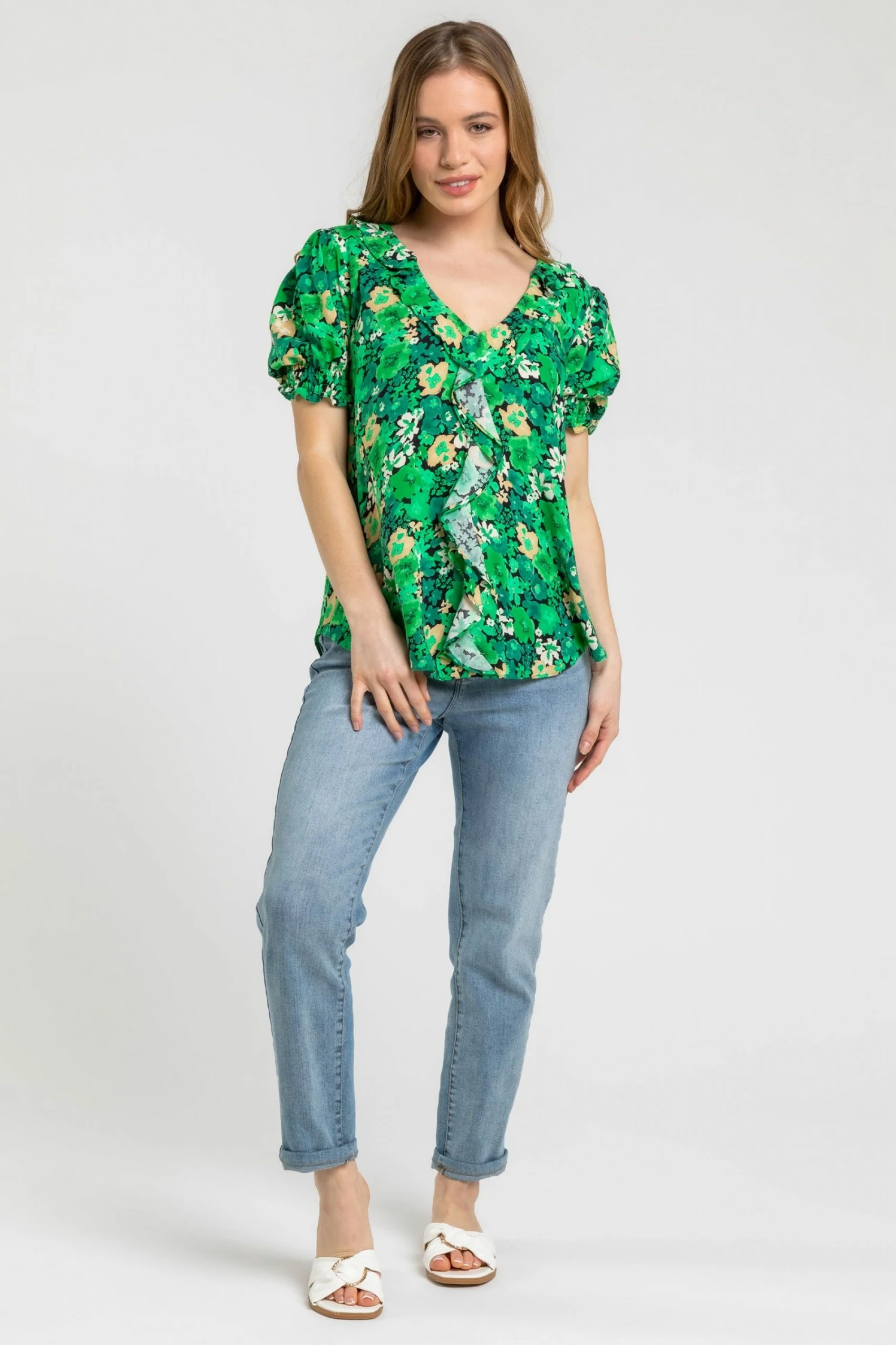 The Petite update of our bestselling Roman piece, this frill detail top is the perfect Spring Summer staple for your wardrobe. Finished with a feminine floral print, this light and breezy blouse will see you through the season in style. This v-neck top is cut from a floaty woven material with short puff sleeves and shirred cuffs for all day comfort. Complete the look with colourful crop stretch trousers and flats for a causal spring style, whether at home or abroad.
