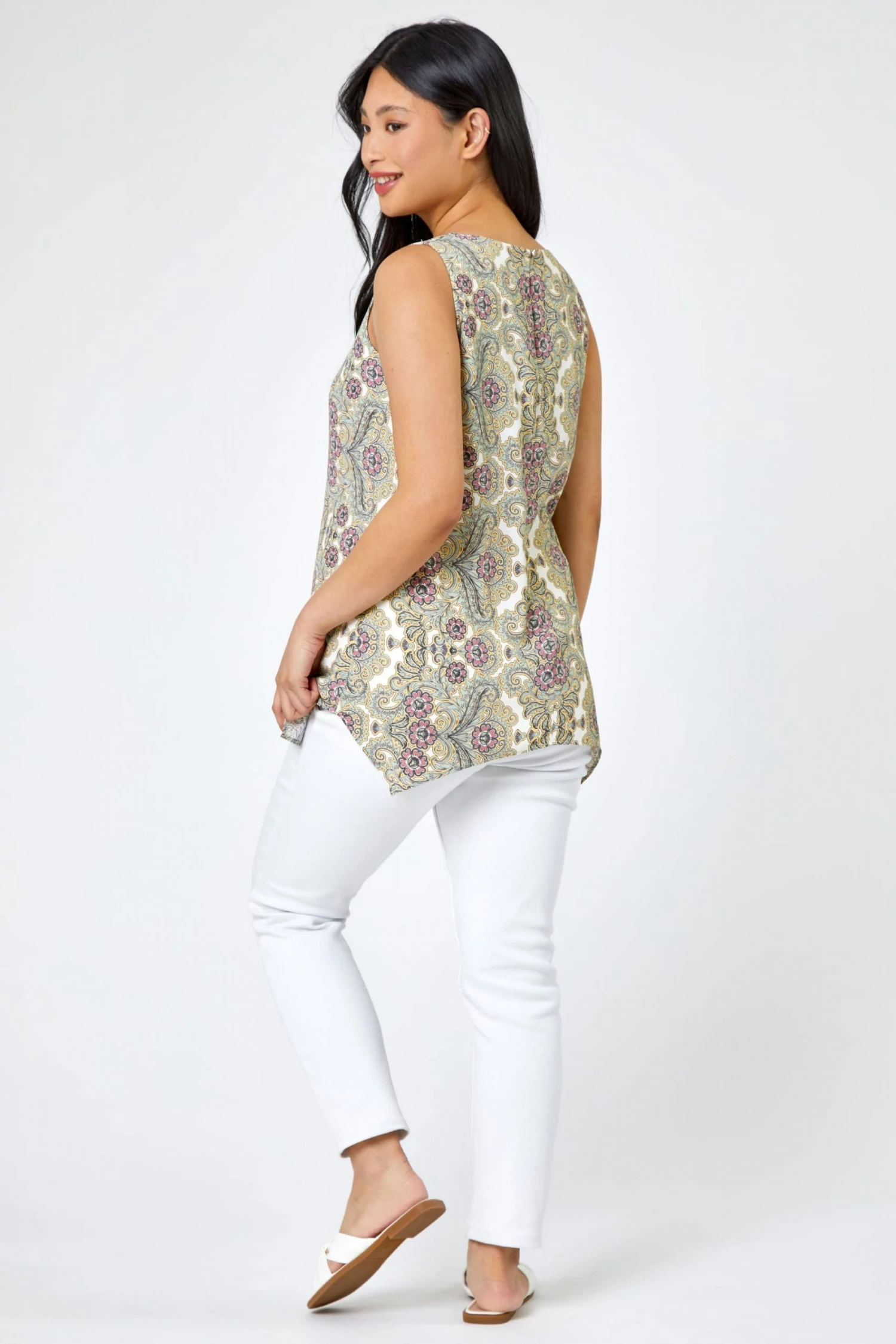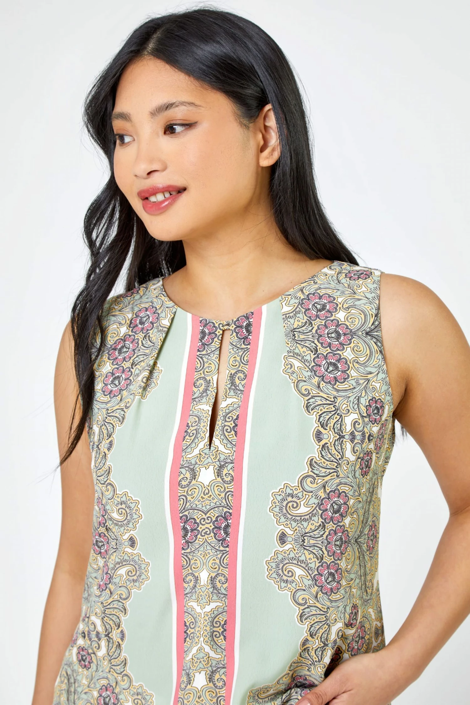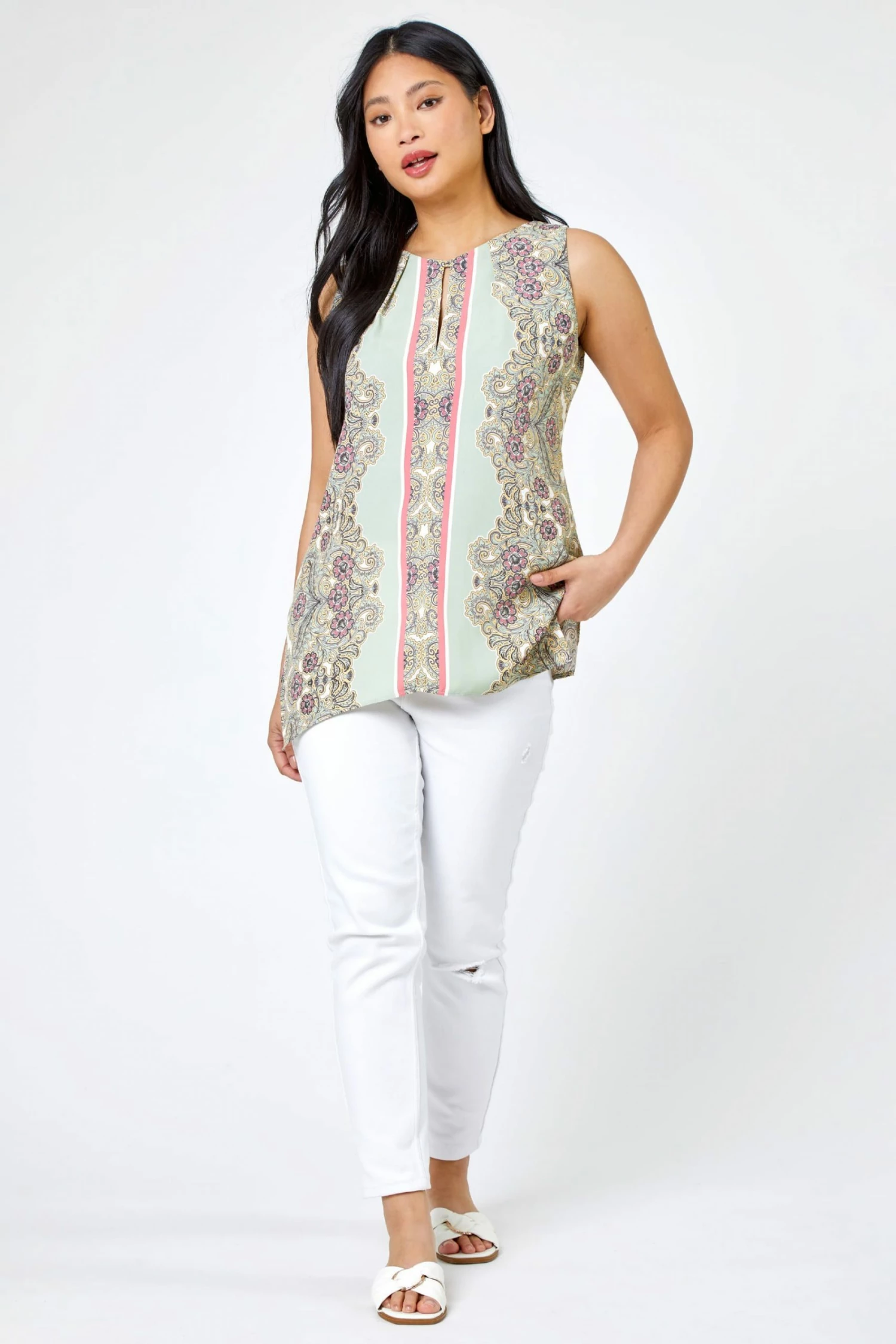 Give your wardrobe a refresh with this paisley border print vest top. This flowy and feminine sleeveless style is crafted from a lightweight material, created with a flattering round neckline and asymmetrical hemline finished with a keyhole and button fastening with an all over paisley print on the back. Whether you re taking a stroll through the countrysides, or going on a summer city escape abroad, this top will suit any occasion.