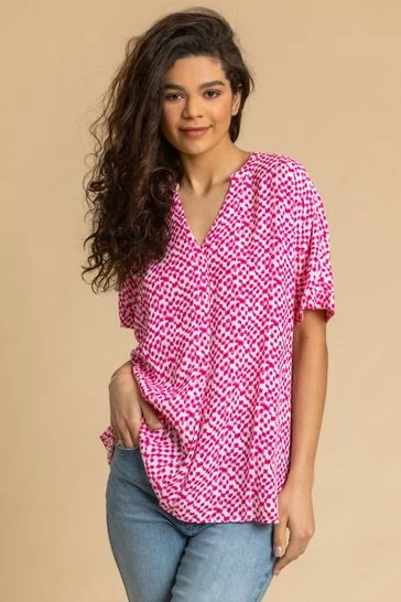 Get dotty for spots! Updating your spring wardrobe has never been easier with these abstract spot print woven tops. This tunic number is adorned in an all-over print and has been cut to a relaxed silhouette, featuring a classic v-neckline and short floaty sleeves. Team this summer staple with cropped trousers and pumps to complete your holiday look.