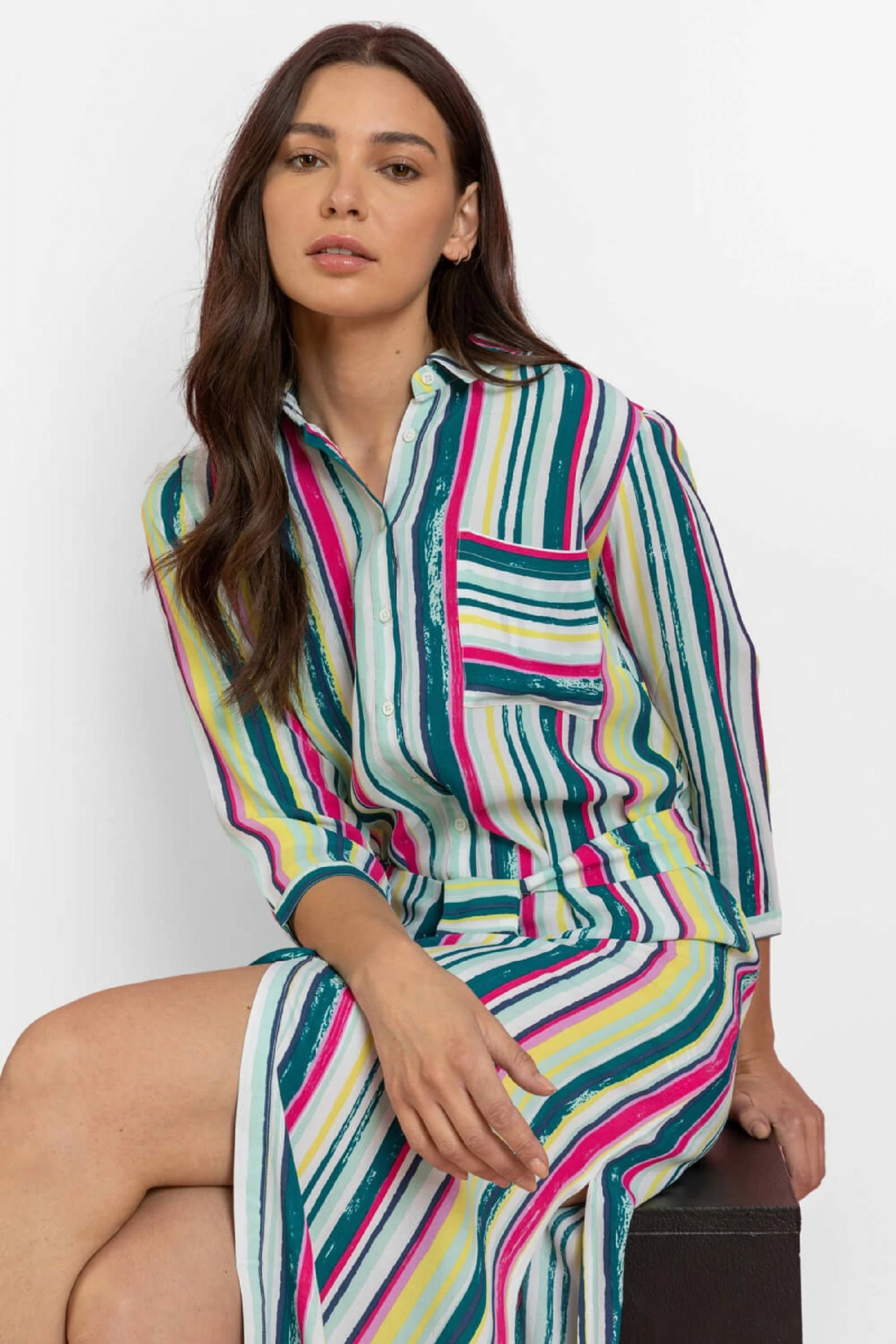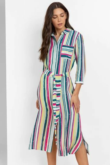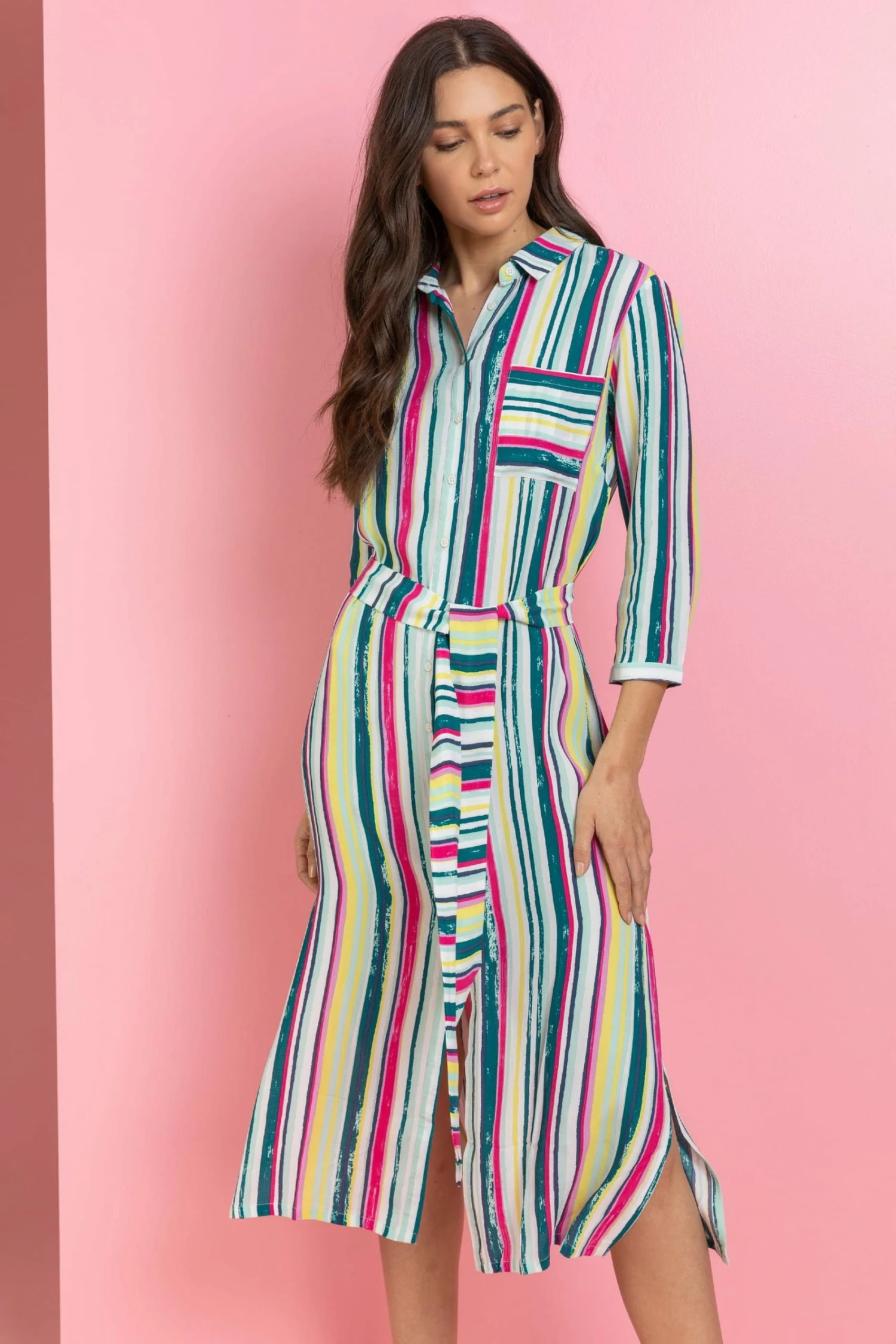 Be bold and brave this season with this vibrant stripe print button through shirt dress. Featuring two splits on the side and a smart shirt collar, this dress is great to wear throughout the day or as a cover up on the beach. Finishing with a flattering tie waist and front pocket detail, this dress is just what you need to add a splash of colour into your summer wardrobe.