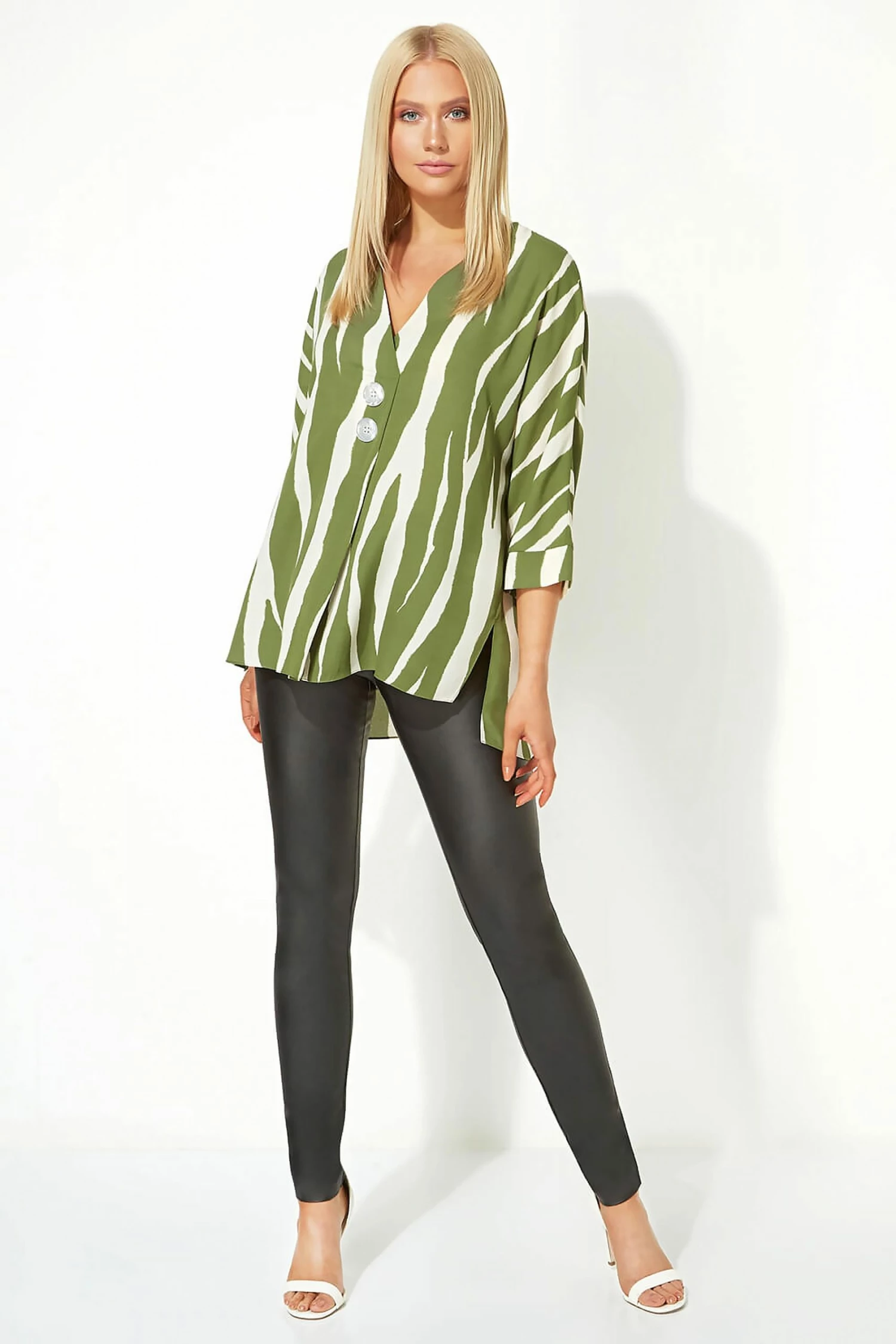 Be fierce and feminine this season with this chic overshirt. The bold animal print design follows a timeless trend that you will reach for year after year whilst the large button embellishment adds a modern twist to the floaty silhouette. This easy to wear top can be dressed up or down to suit your needs. Pair with your fave jeggings for a smart casual look that will become your new go-to!