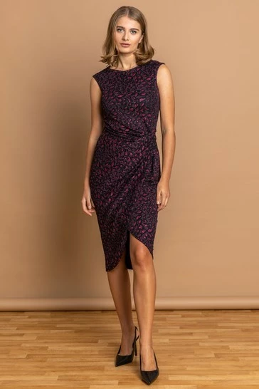 Our unique new design for the autumn months, this shimmer effect animal dress is a real winner. Complete with a stylish wrap silhouette, this twist detail dress has a ditsy leopard print that is scattered with glitter. Ruching at the waist cinches in the figure and creates a flattering form fitting shape whilst the sleeveless silhouette makes it perfect for layering with smart jackets and boleros.