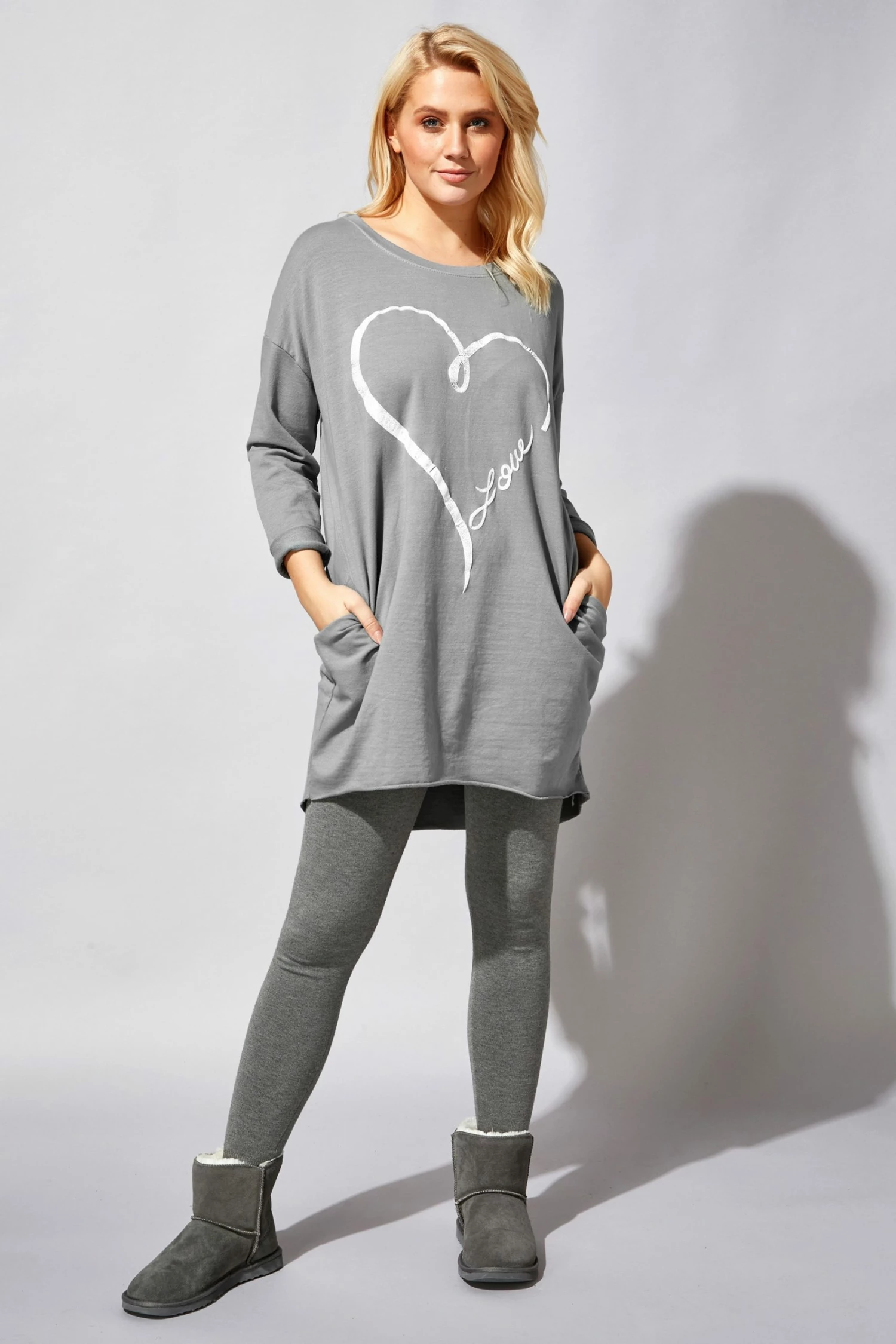 Lounge around in style with this heart print tunic. Cut to a flattering oversized fit, this longline sweatshirt style top features long sleeves and a round neckline with a statement heart print motif at the centre front. This comfy top is perfect for chilling out at home and layering over casual trousers. Mix or match with the rest of our loungewear range and create a stylish look that will take you from dawn till dusk.