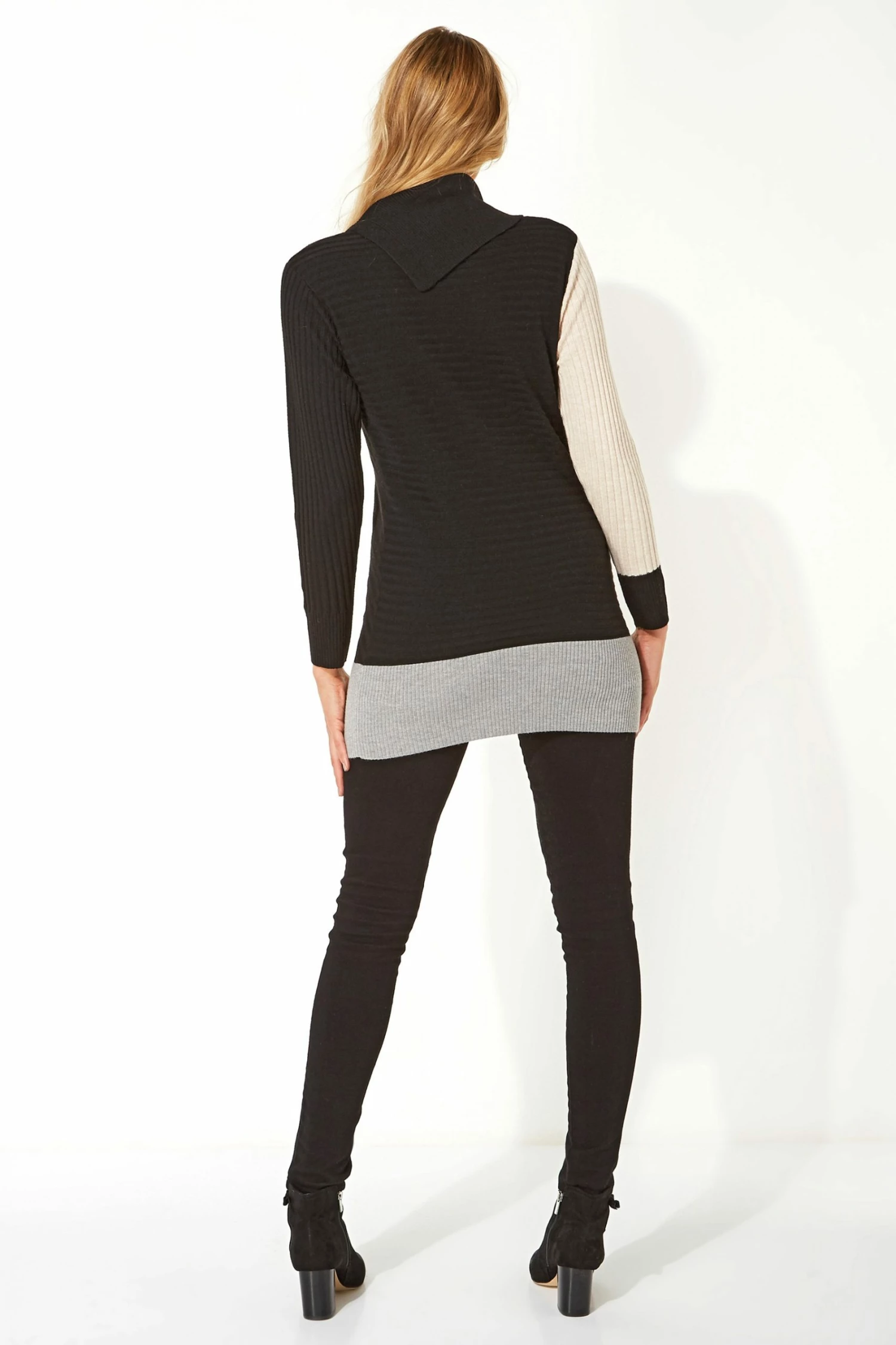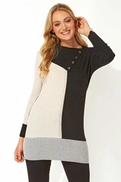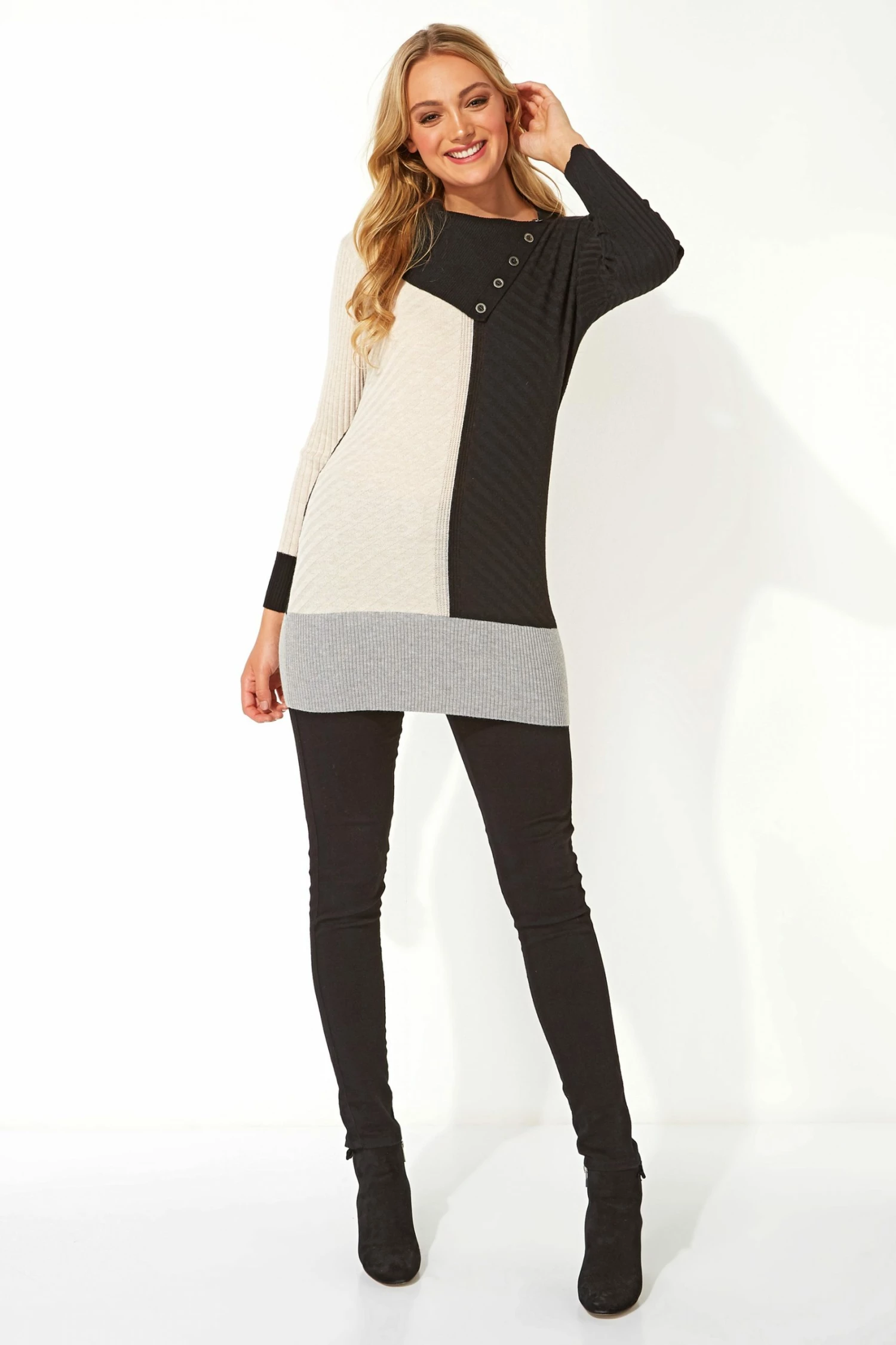 This tri coloured tunic is eye catching and flattering on all figures. It is finished with a split neckline, which is adorned with buttons. Team with skinny trousers and boots for a stylish chic outfit.