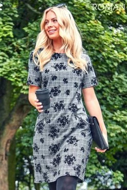 Put a new twist on your workwear selection with this floral check shift dress. Made using a blend of a lightweight and stretch material, this dress has a soft and easy to wear appeal. The trendy floral print is contrast with a subtle checked pattern and the dress is finished with zip pocket detailing on the front. Pair with black tights and court shoes for a demure and sophisticated finish.
