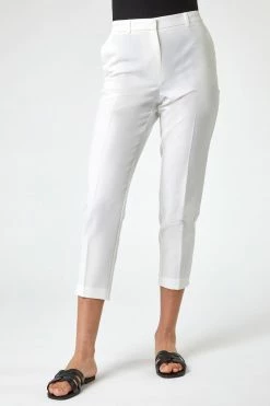 Always look the business in these smart tapered trousers. Featuring two angled side pockets and hook and zip fly fastening, these basic essentials are a wardrobe must have. These tailored trousers have a feminine side split detail at the hem and useful belt loops at the waist. Ideal for desk to dinner wear all year round, this soft pair of trousers will look great with an ivory blouse in the office.