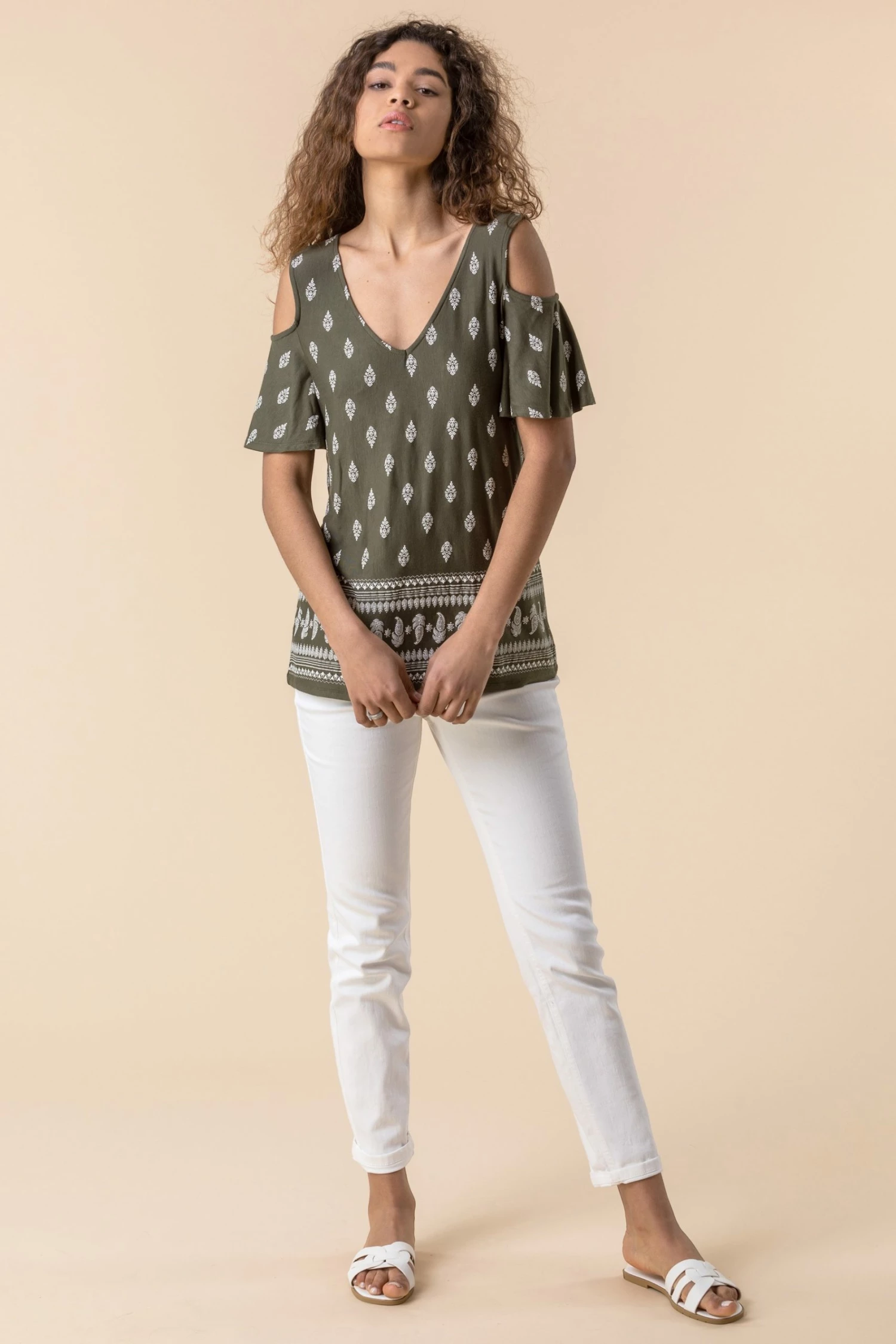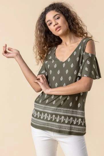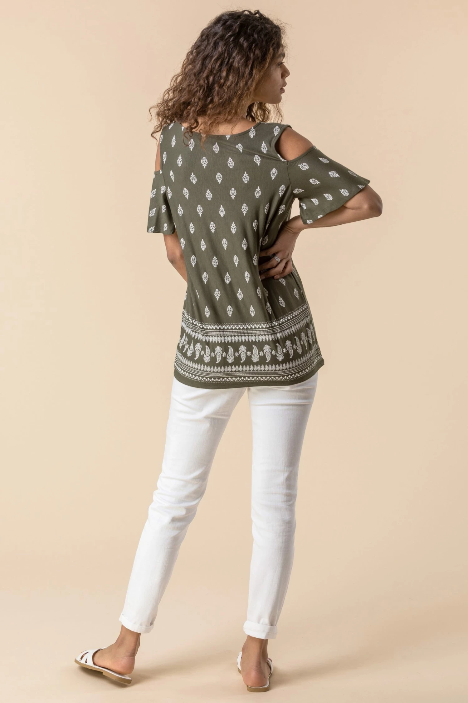 Paisley Print Will Forever Be A Print Close To Springs Heart. Opt For This Short Sleeve Printed Cold Shoulder Blouse Featuring Contrasting White Print. Pair With Light Wash Or White Jeans And Wedge Heel Sandals For A Casual Spring Summer Look Perfect For A Holiday.