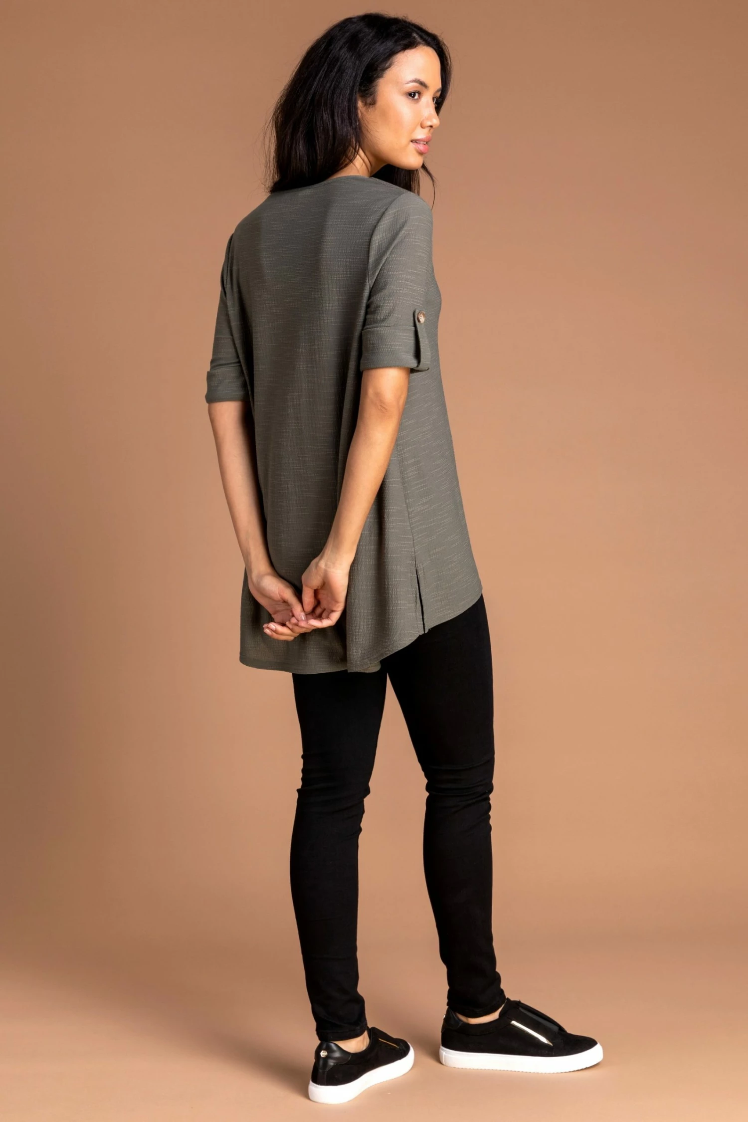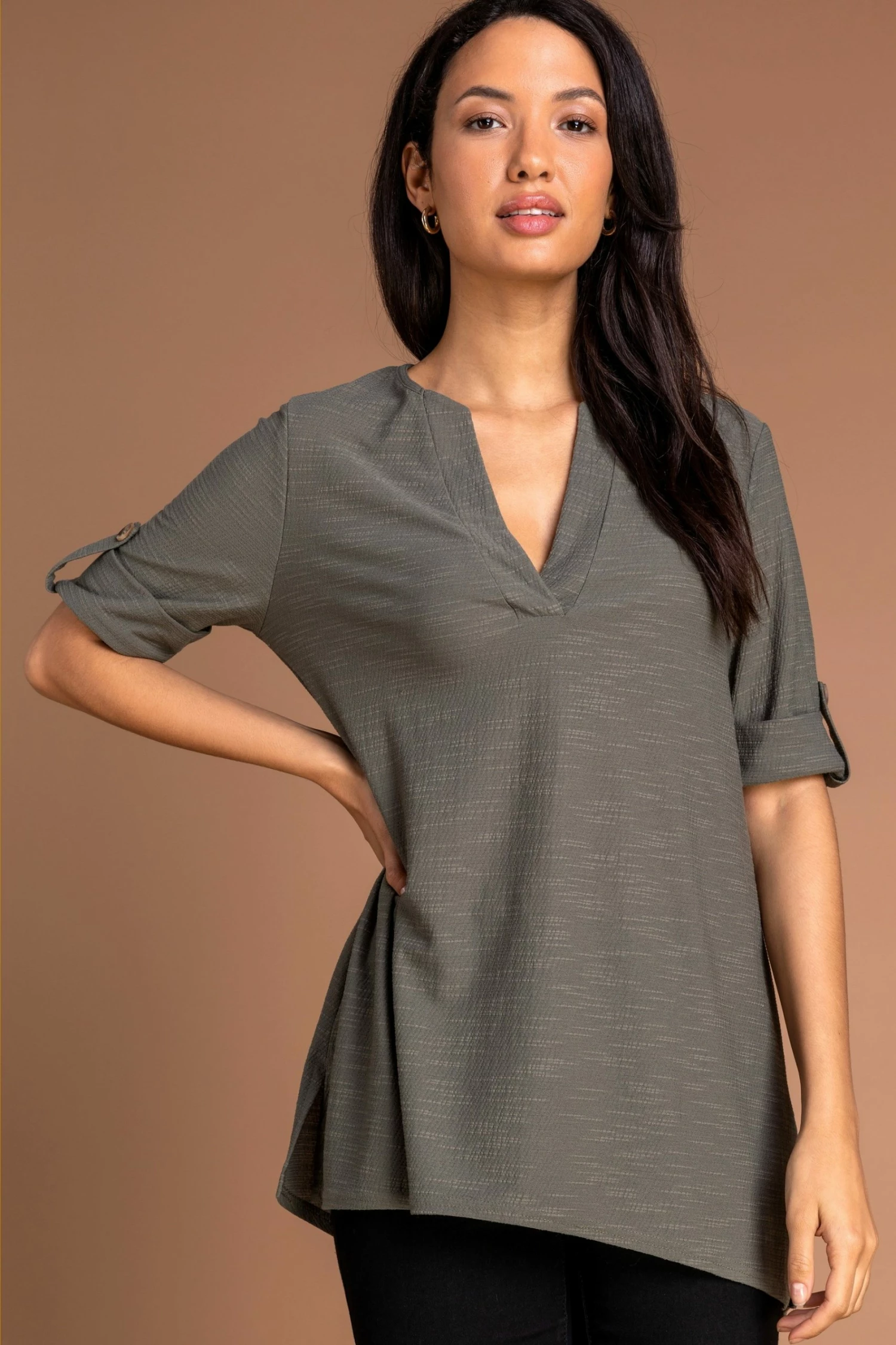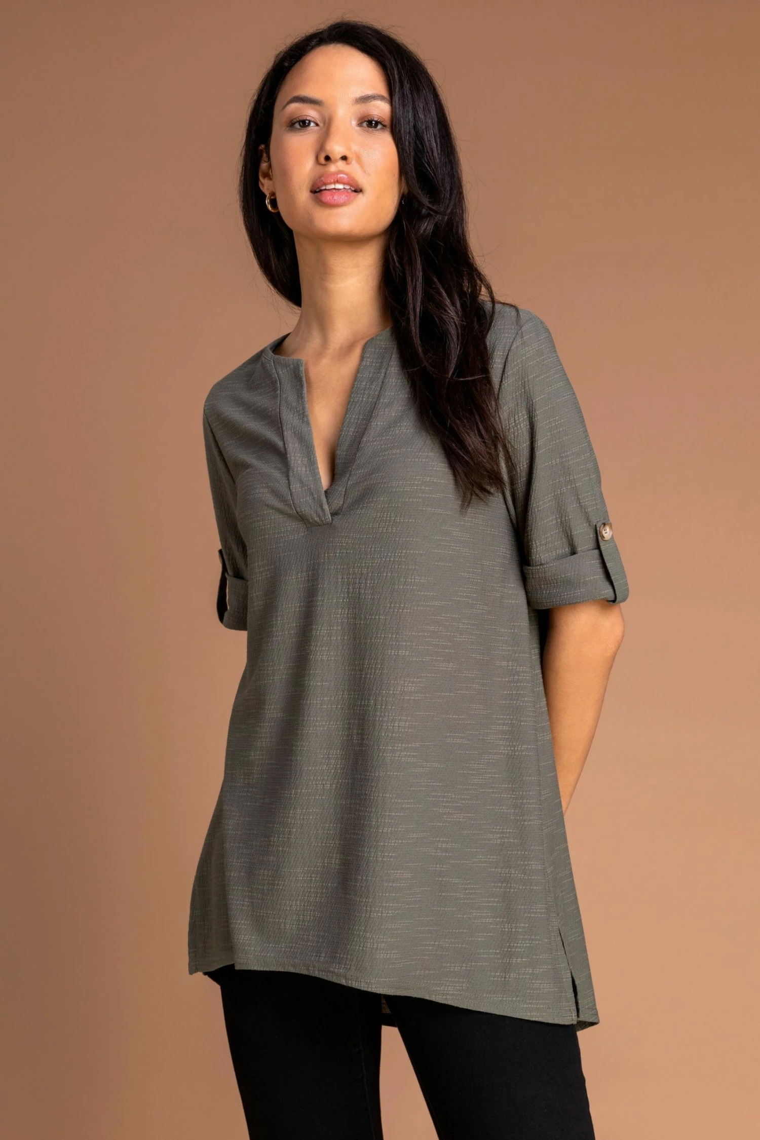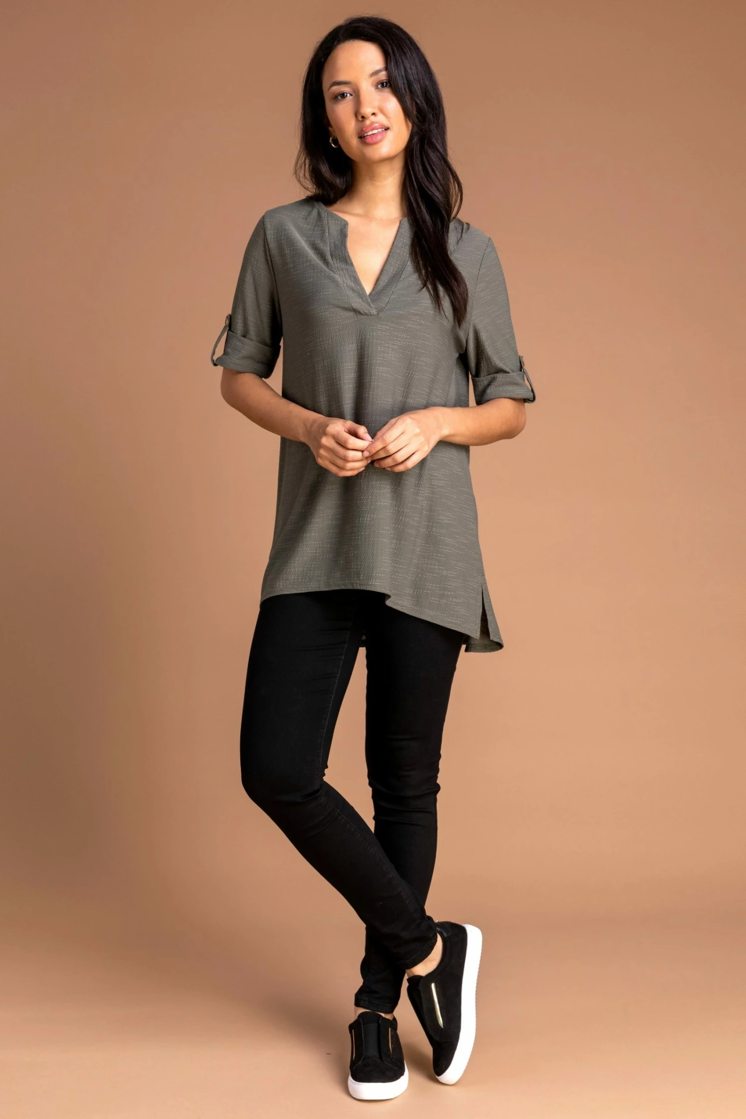 A classic style made into the perfect smart casual staple, this notch neck top is your new wardrobe essential. Cut to a relaxed fit with short rolled up sleeves, this textured overshirt has a notched v-neckline and a dipped hem to the back. Pair yours with dark denims and pumps for a casual look or add smart trousers and a blazer for a workwear chic style.