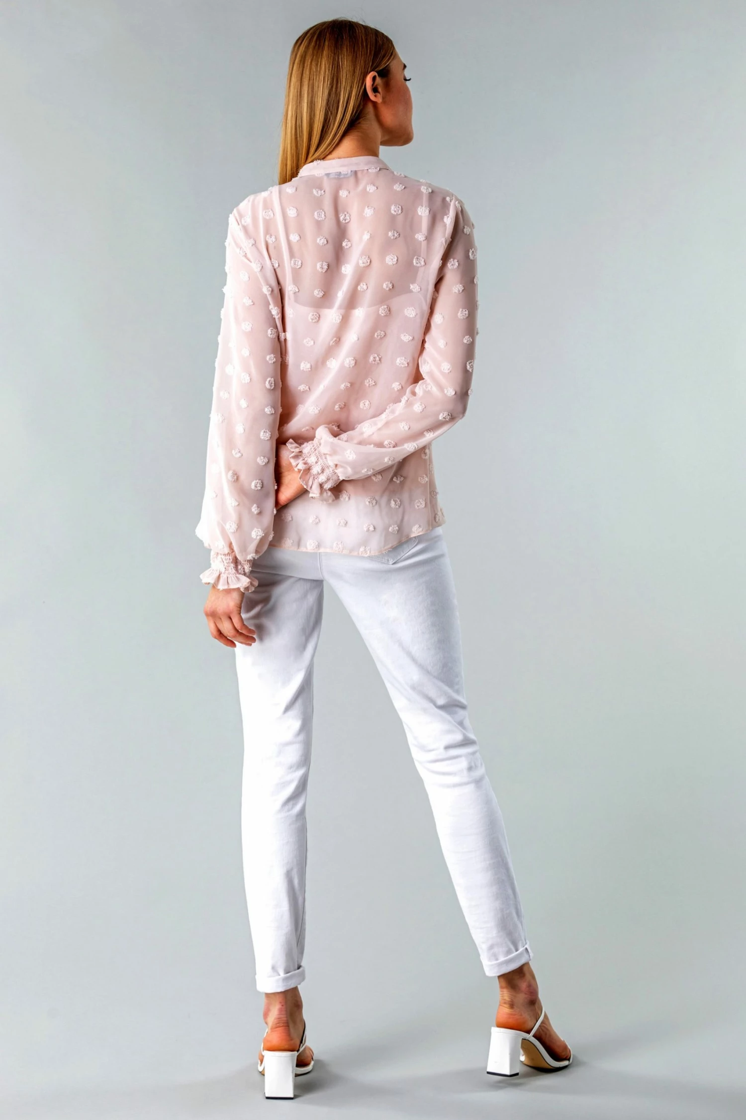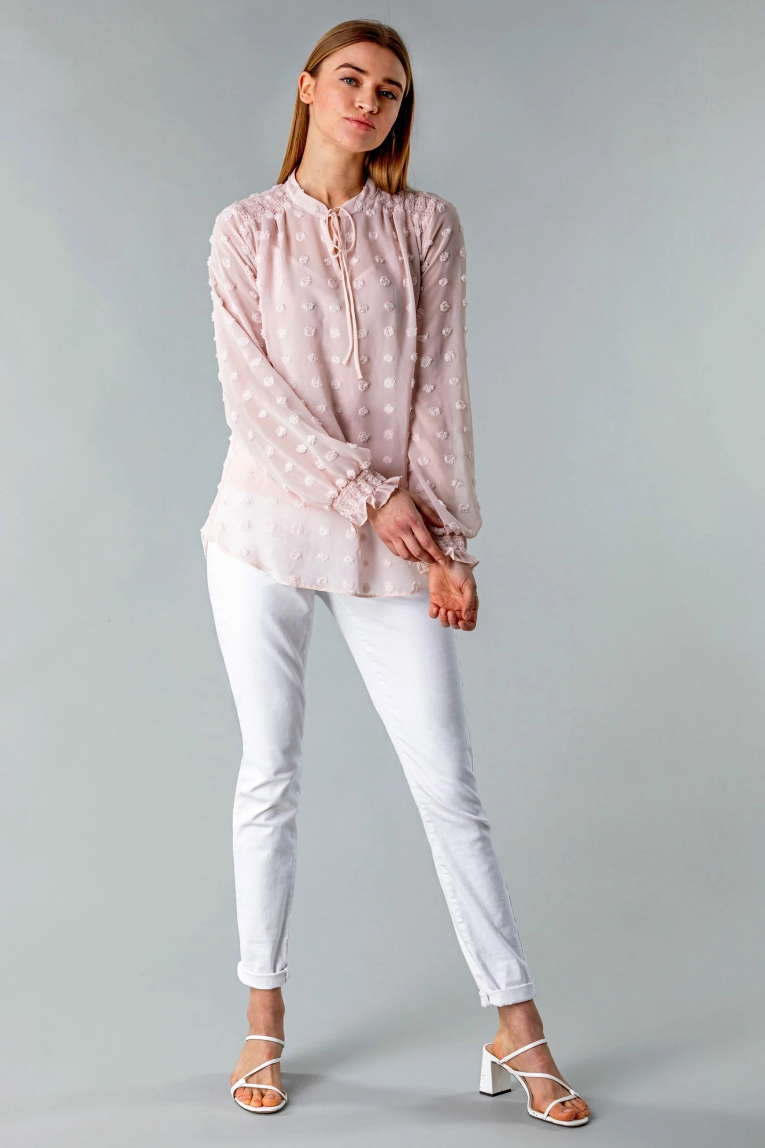 Update your everyday looks with this fresh new blouse and cami combo. This light chiffon style has a beautiful floaty silhouette and elasticated shirring at the cuffs. Finished with a trendy dobby spot detail and a vintage inspired tie detail at the neck, this top is ideal for work to weekend wear. Throw on a blazer for a chic office ensemble or dress it down with some cropped trousers for the spring.