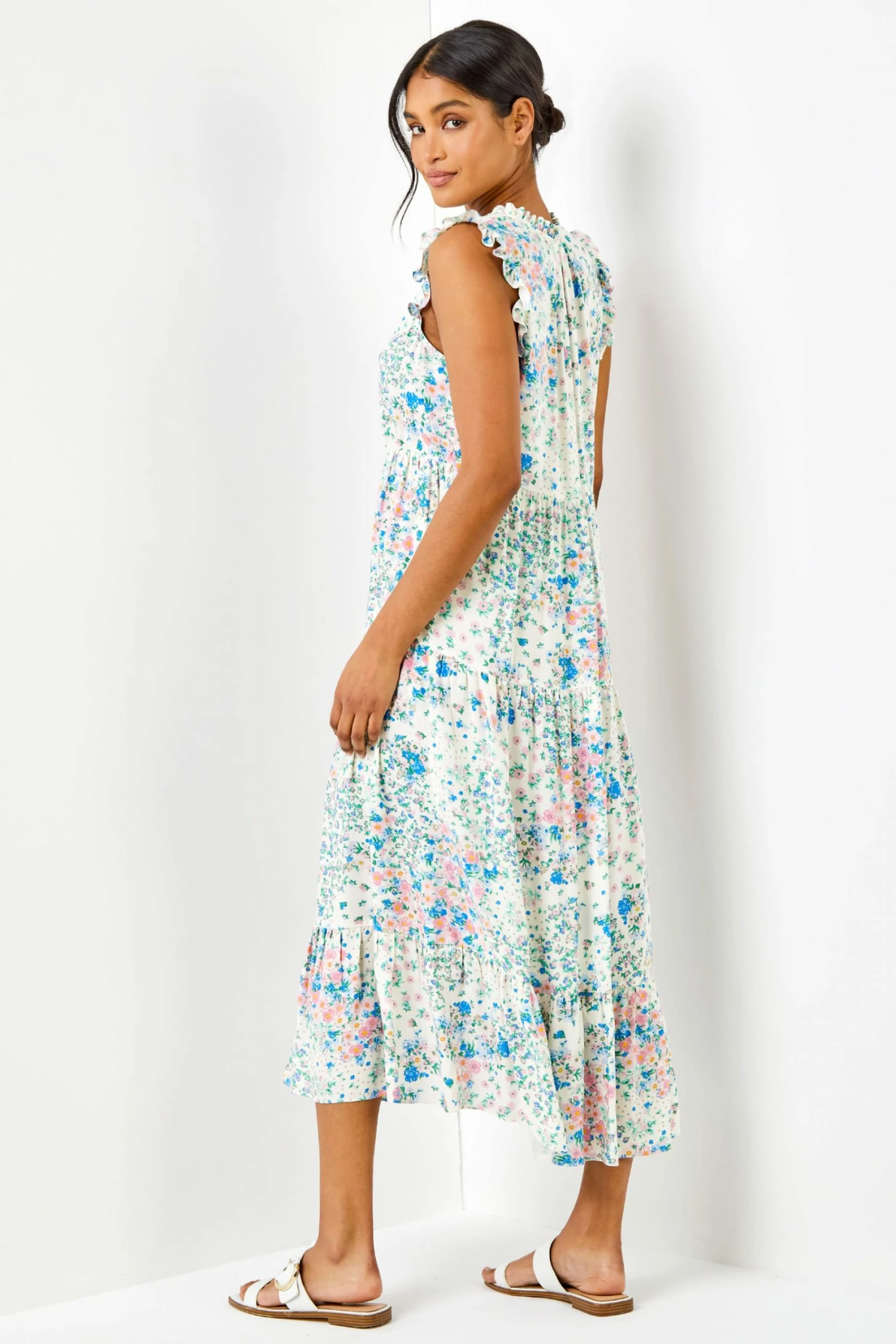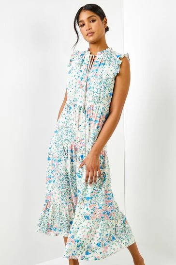 Flourish in florals with this exquisite Roman maxi dress. Made with such a seamless silhouette, with frill detailing along the neckline and arm holes, with a neck tie detail that flows into a flattering tiered skirt. This dress is the ideal piece for this upcoming season, elegant and equally stunning, itβs a dress that needs minimal styling. Pair it with some sandals and a crossbody for a made up day look or wedges and a sun hat for an effortless summer look!