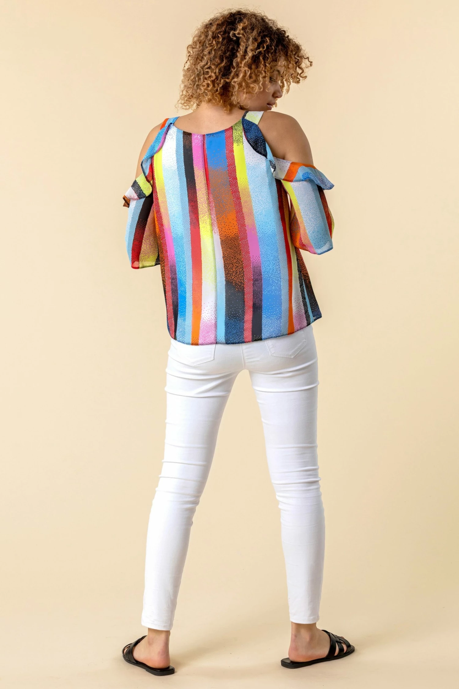 Brighten up the day with this stunning and bright rainbow stripe print top. Featuring the seasons hottest trend – the cold shoulder with beautiful frill detailing, this top is a staple piece for a chic and romantic look. A must-have for every wardrobe this season, our light cold shoulder tops look great with a pair on cropped trousers on holiday!