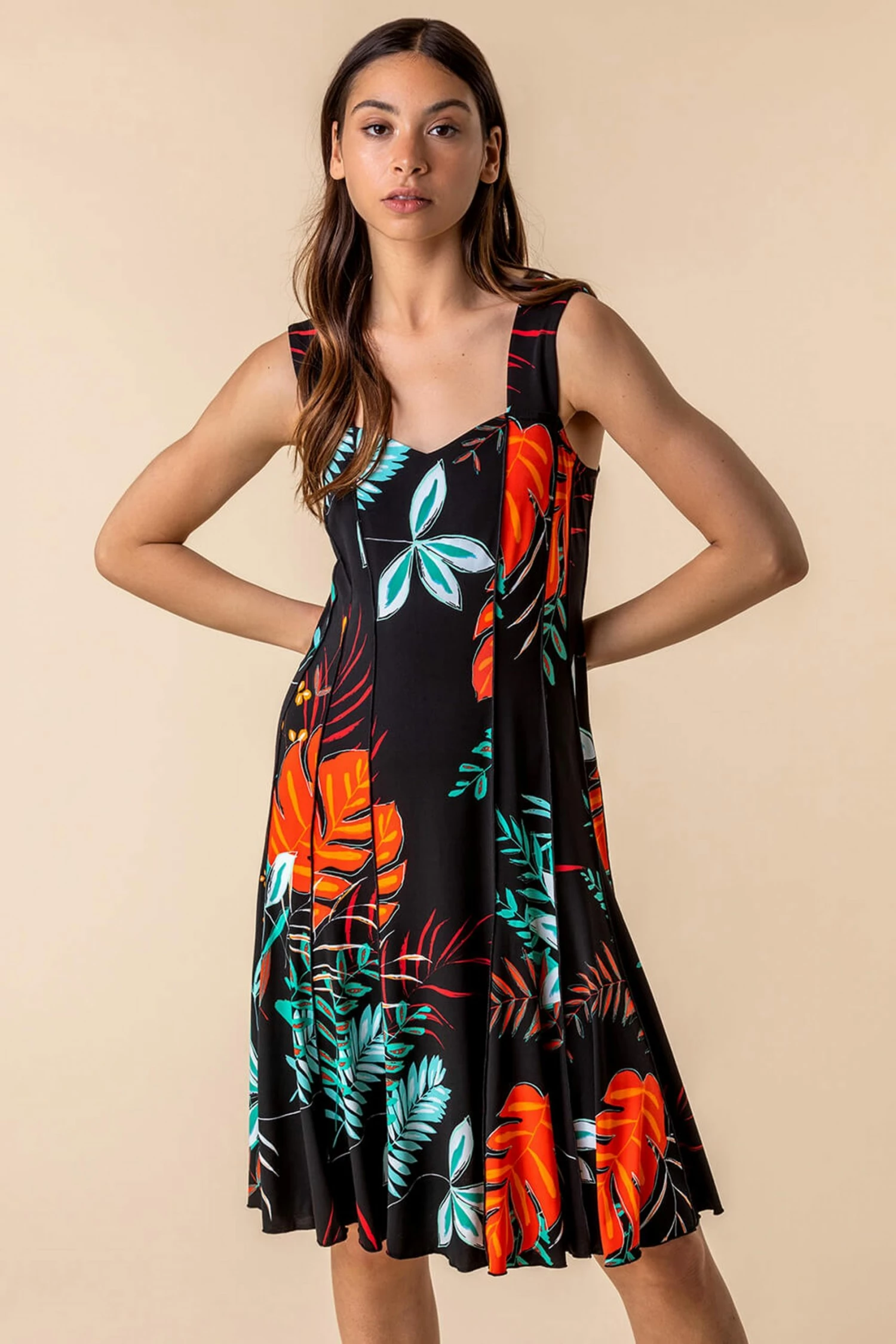 Go For Bold With This Stunning Statement Tropical-Inspired Print Panel Dress. Crafted With Silhouette Defining Panels, A Floaty Skirt And Wide Straps, This Soft Stretch Jersey Dress Has Been Cut To A Fit And Flare Shape. Our Multi-Panelled Dress Is Perfect For All Occasions This Summer So Pair It With Your Favourite Sandals And Sunnies For A Seasonal Style.