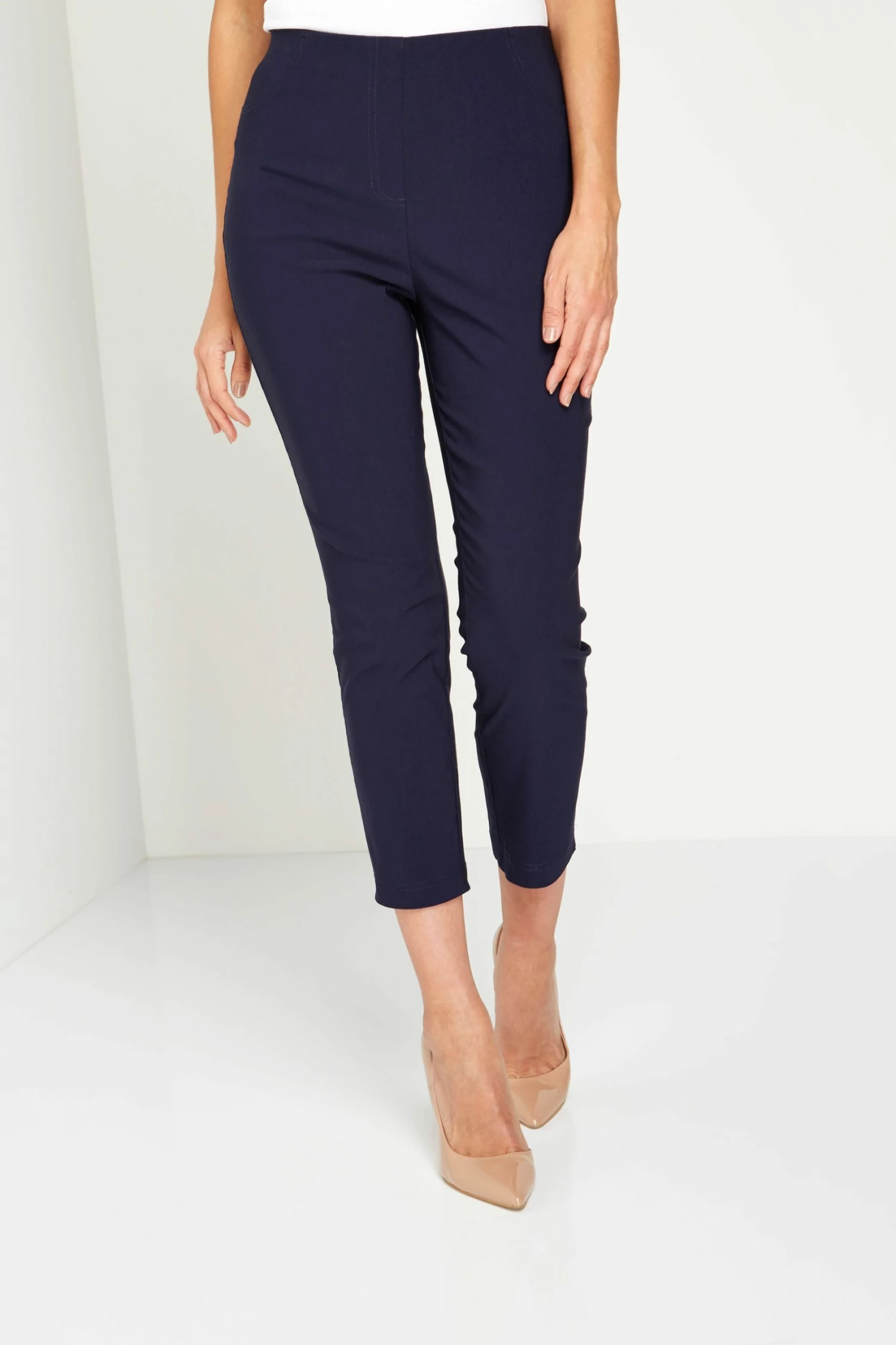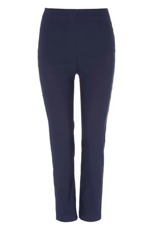 Crafted from a stretch fabric, these slim leg trousers fit smoothly to your curves. Made with a regular rise elasticated waistband and back pockets, these versatile trousers are stylish yet comfortable.
