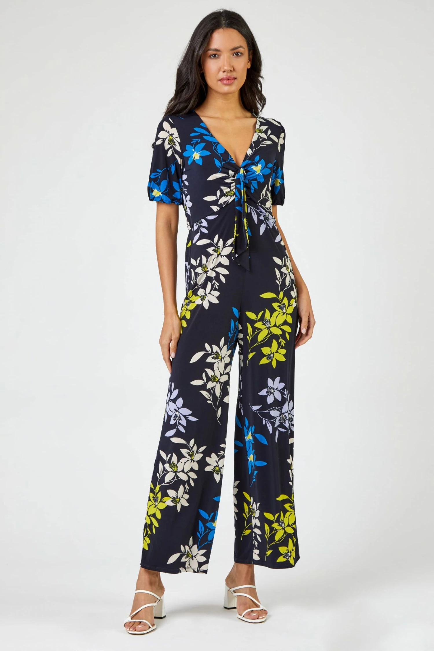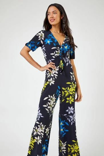 Add to your floral collection this season with a beautiful summer take on the jumpsuit, taking you from occasions to beach holidays within seconds. Cut from soft stretch jersey material, this maxi jumpsuit features a tie detail to the bust and 3/4 length sleeves, creating the ultimate flattering high waist silhouette. Wear with your summer sandals and sunglasses for an effortless holiday look or dress up with heels and clutch for a comfortable garden party style.