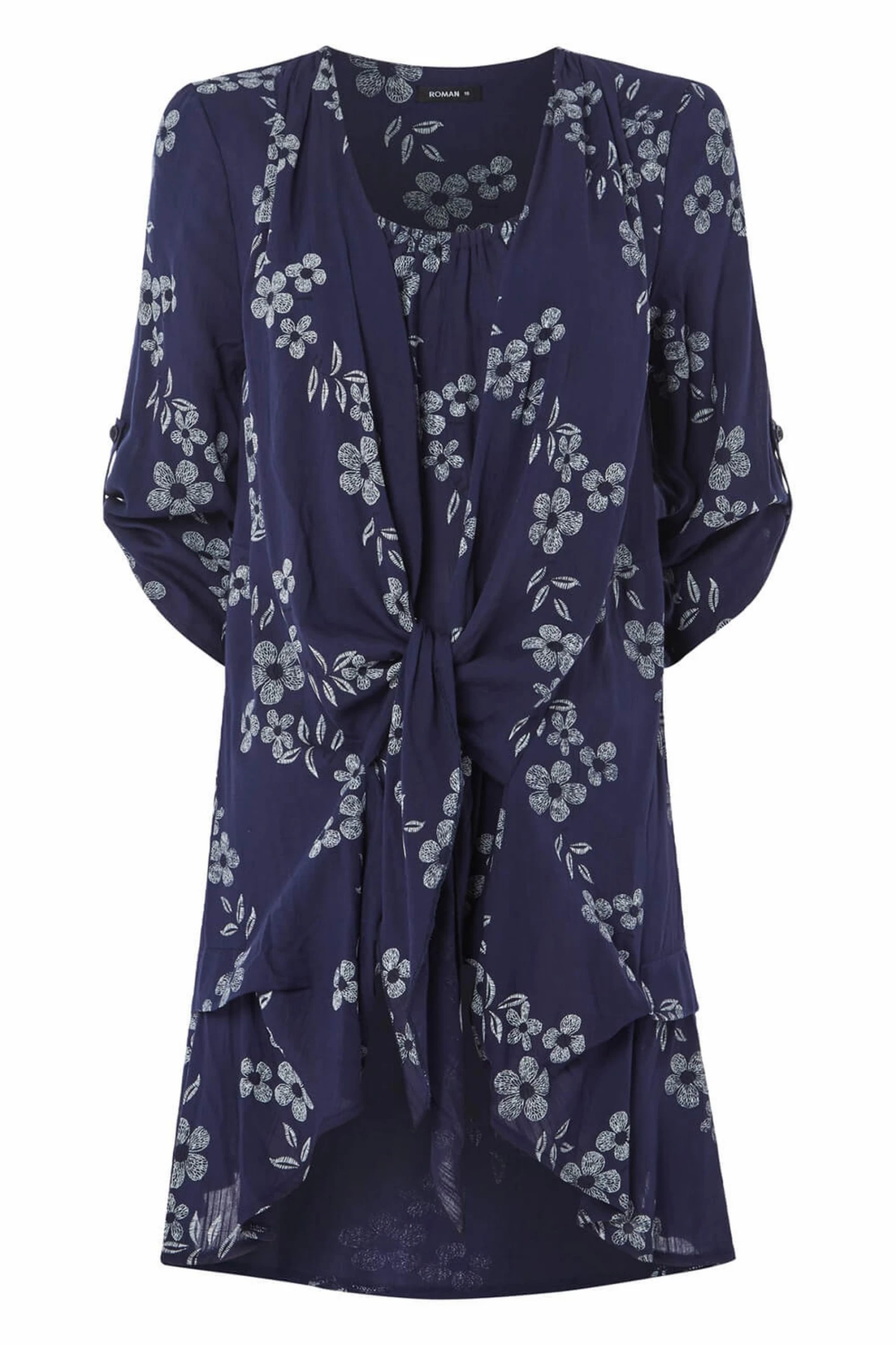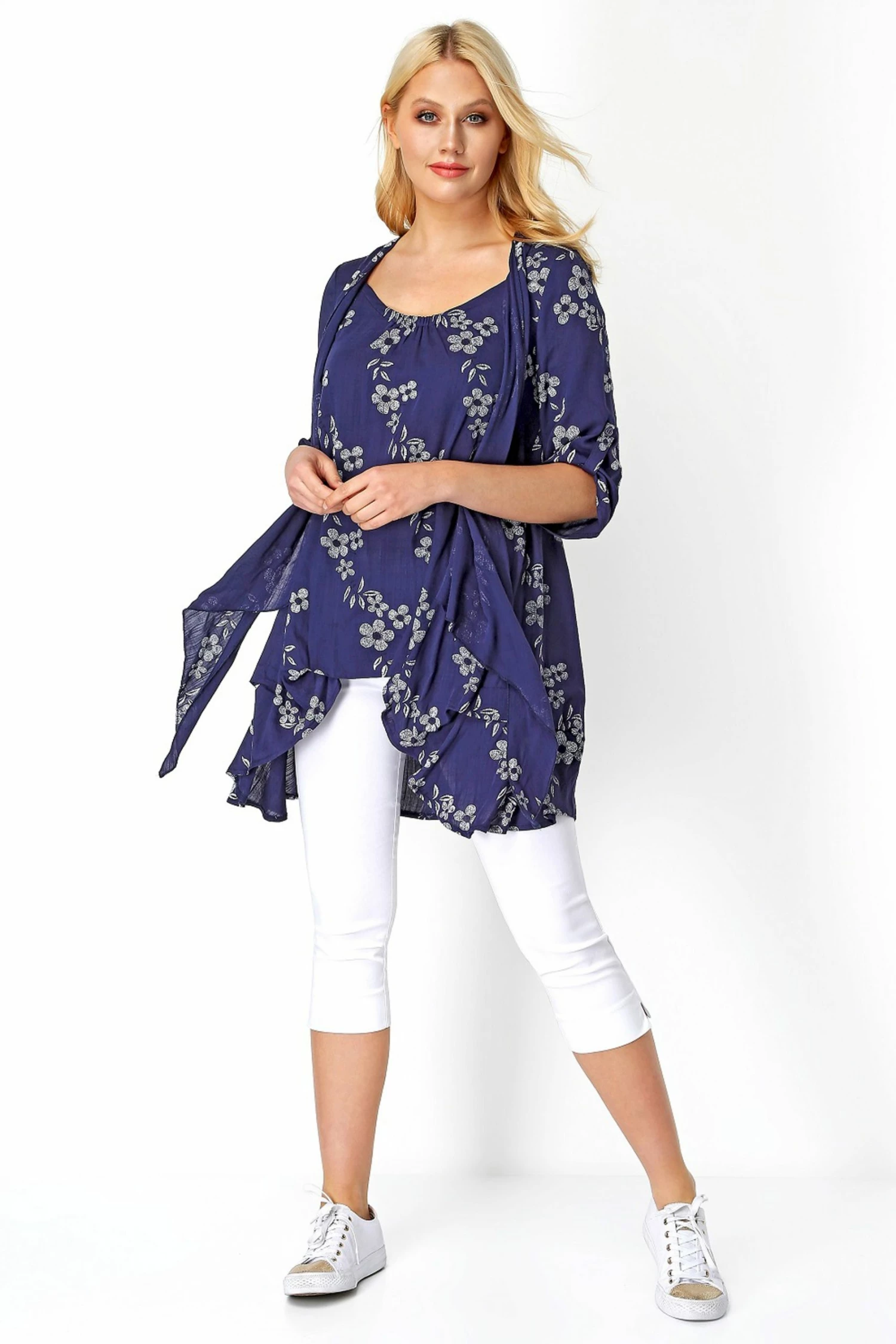 Our best-selling silhouette gets an update in this floral navy print variety. The lightweight, crinkle fabric falls beautiful in an illusion style and the ¾ sleeves offer a super flattering look. Complete the look with a pair of classic trousers and white trainers for the ultimate smart-casual combo.