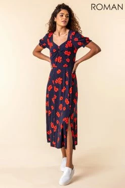 Flatter your figure in feminine prints this season with our floral midi length dress. Featuring front splits to the side of the skirt and elegant shirred sleeves & cuffs, this day dress has beautiful gathered detail to the bust creating a sweetheart neckline. Pair with everyday pumps for a casual day look or dress up with heels and statement jewellery for an occasion-ready outfit.
