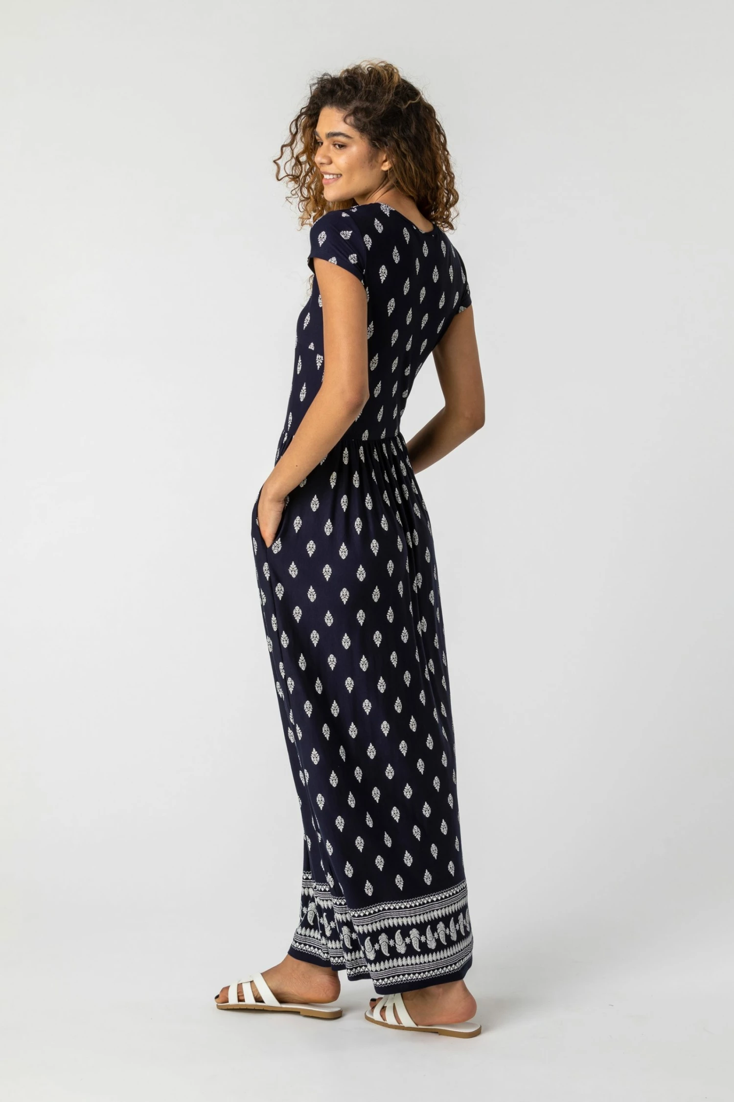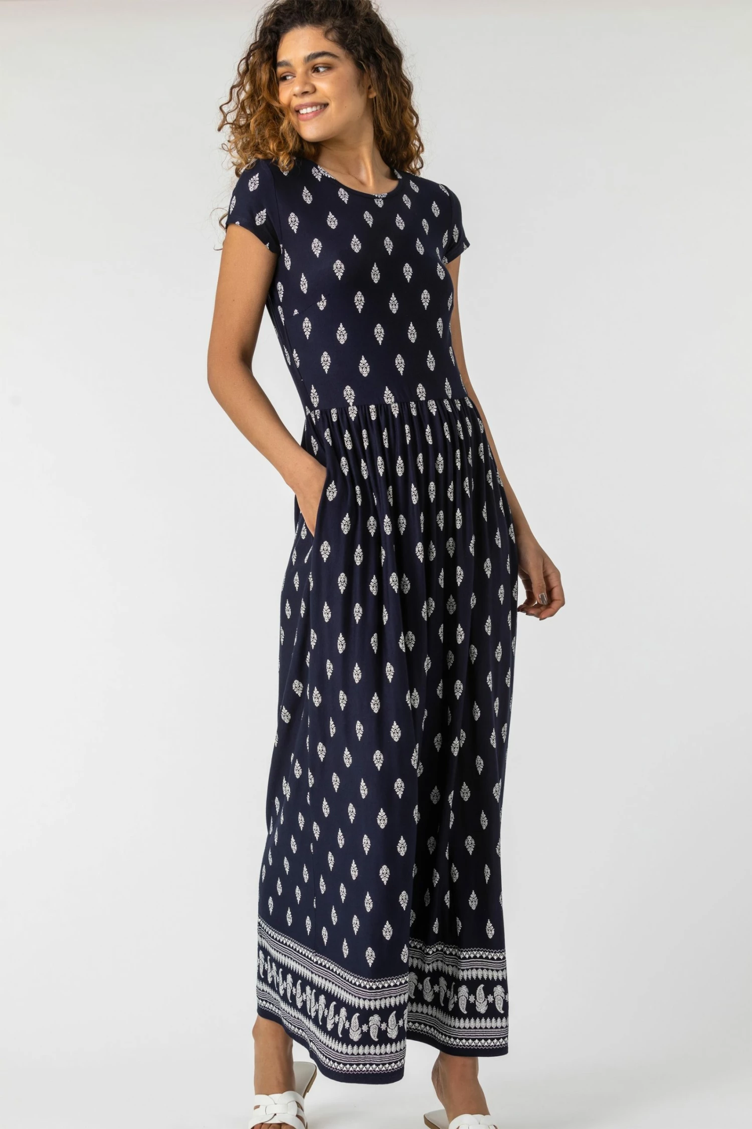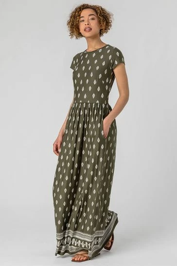 A great essential addition to your casual wardrobe, this versatile dress is a must-have for this summer. Designed in a relaxed shape that sweeps to the floor and elongates the body, this border print maxi features a gathered skirt, short sleeves and side seam pockets. Easy to pull on and wear, team yours with sandals for a casual look to take you through the day.