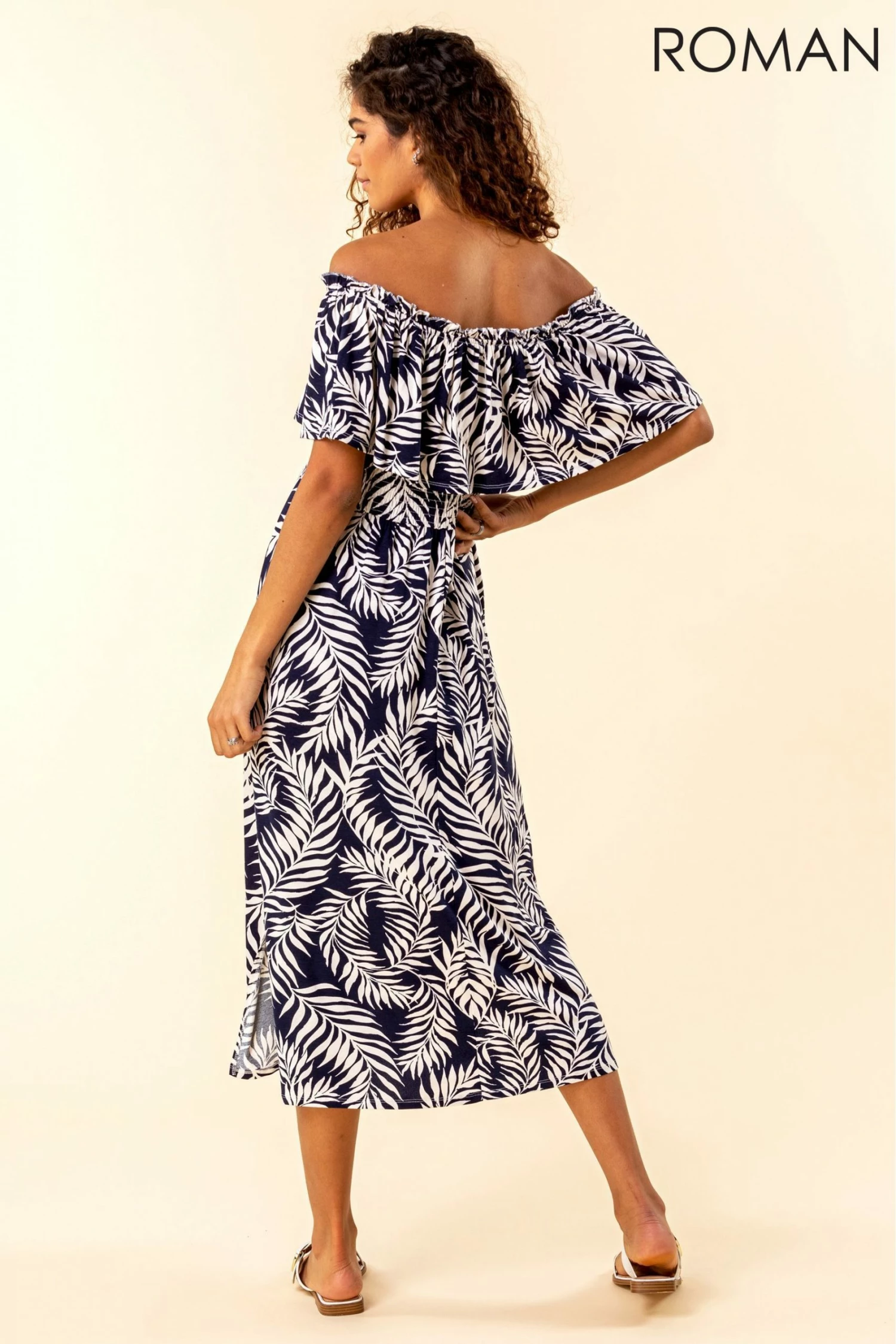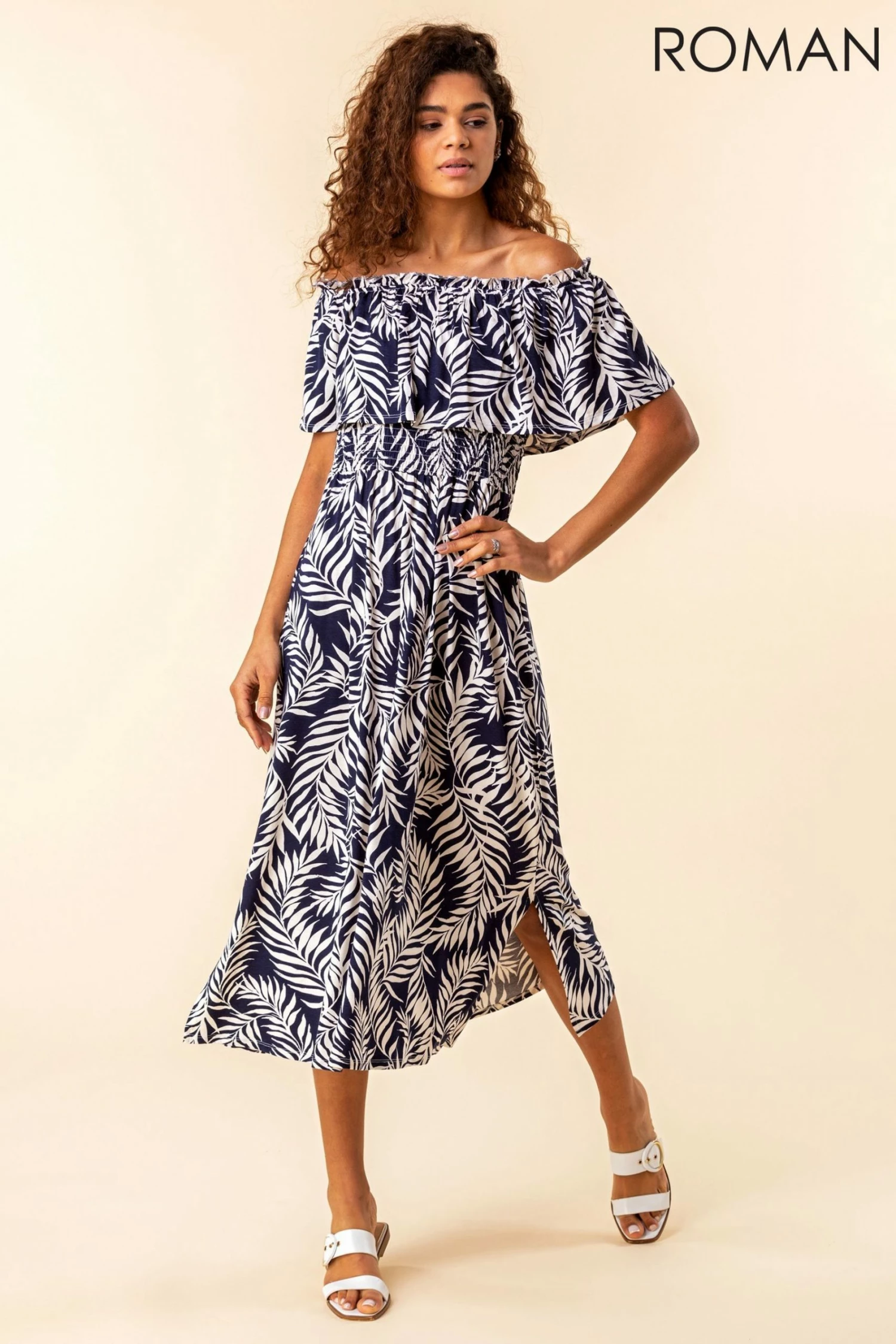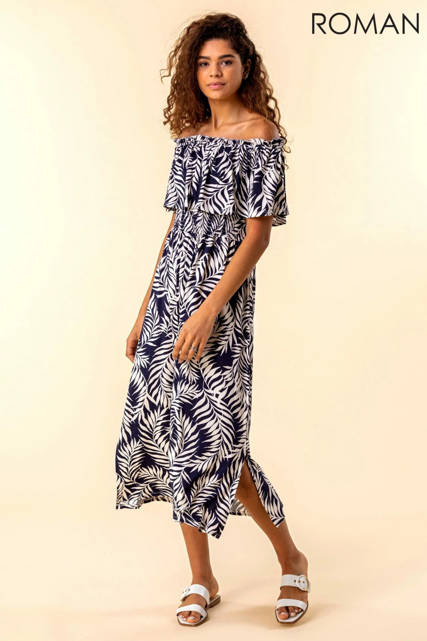 Let Roman Bring The Tropics To You This Year. Our Sophisticated Sundress Is Everything You Need For The Summer Months. The Bardot Neckline Allows Your Shoulders To Catch The Sun While Its Frill Hem Drapes Delicately Over The Arms And Chest Creating A Short Sleeve. The Bodice Is Shirred And Elasticated Creating A Demure Silhouette That Drifts Down Into A Classic Floaty Skirt. Pair With A Denim Jacket And Sandals And Be The Best Dressed At All Your Garden Parties.
