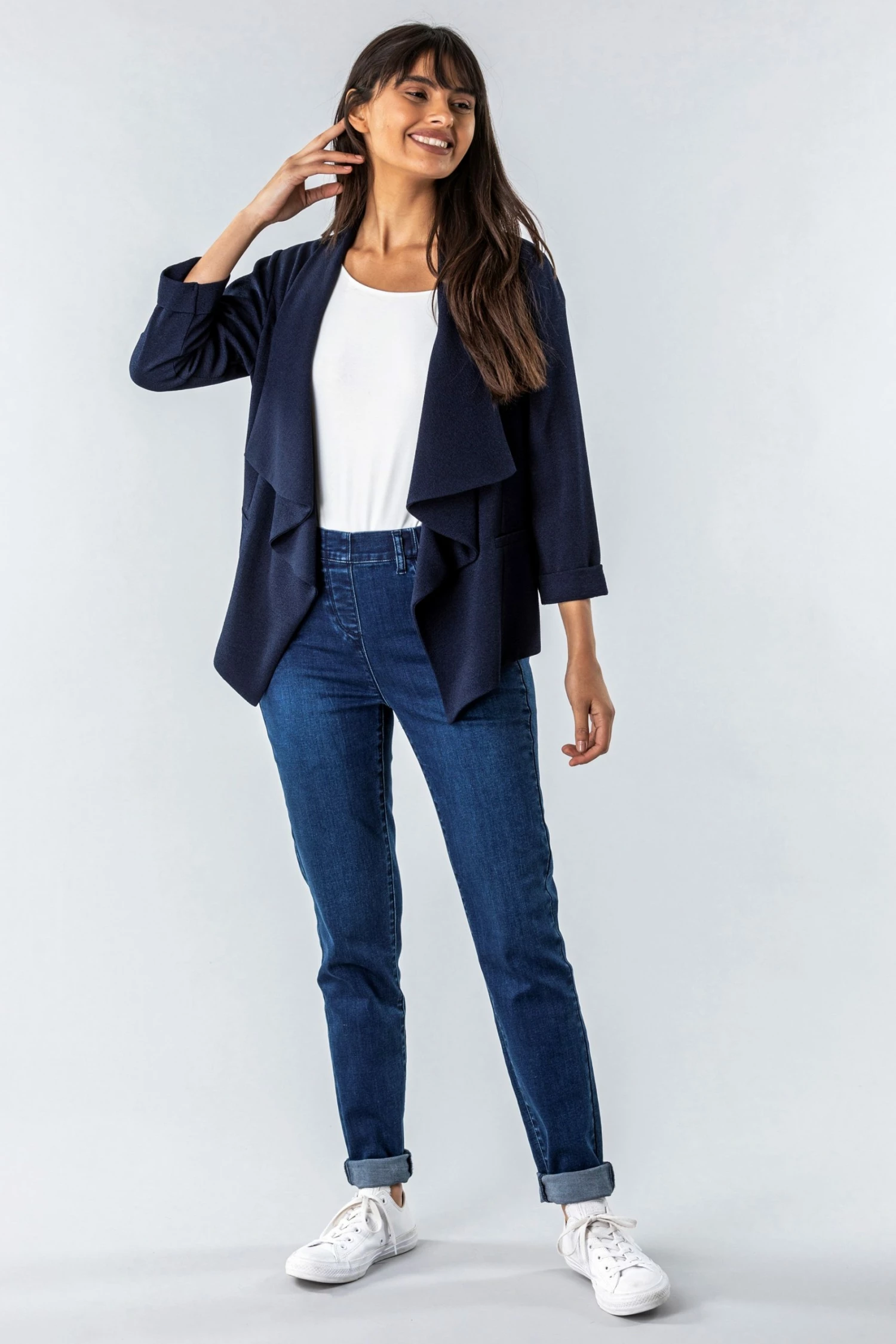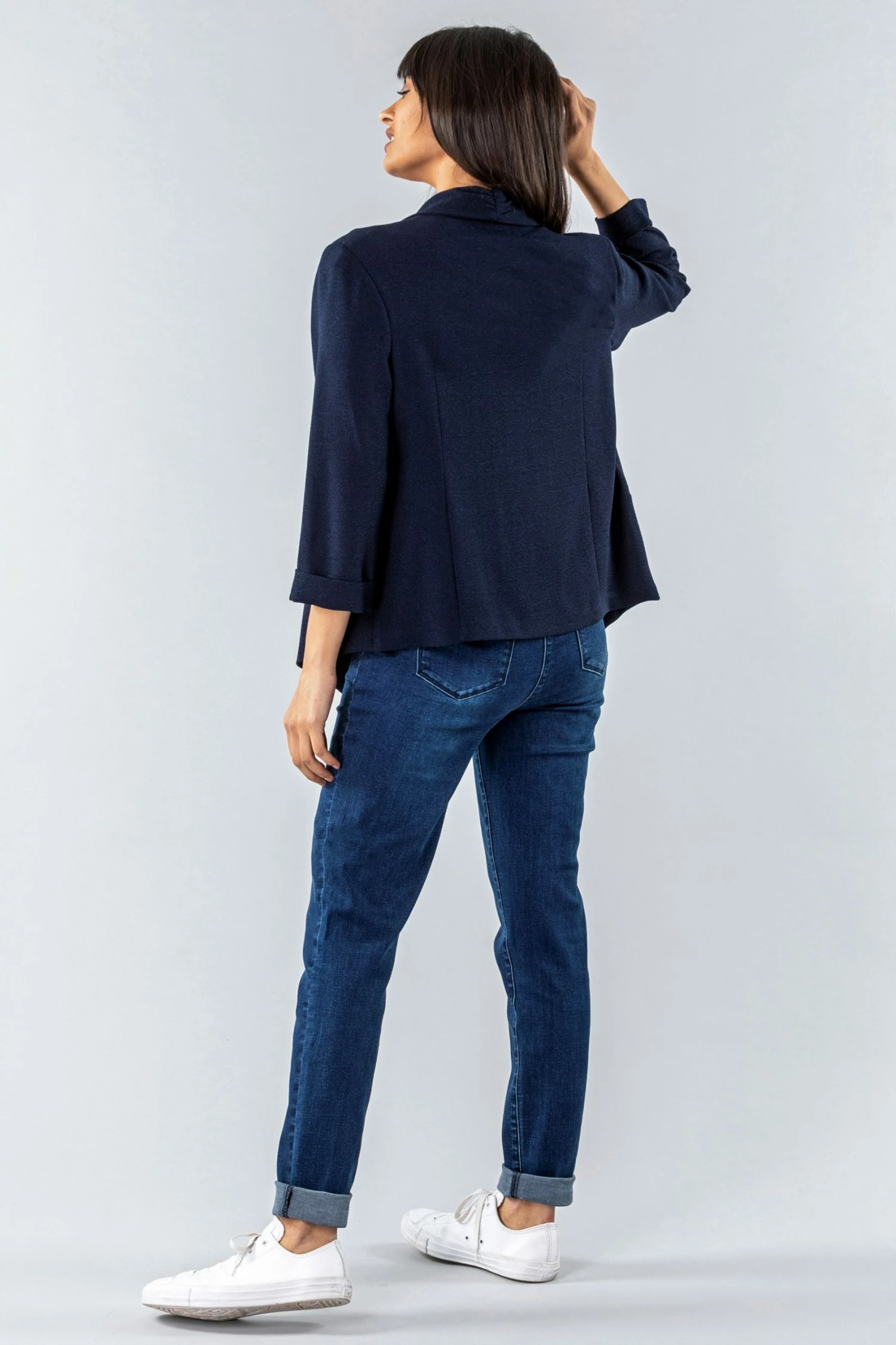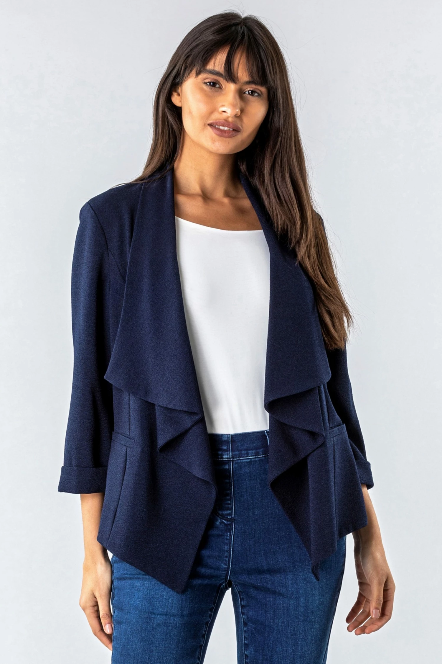 Smarten up your office attire with our waterfall navy jacket and add something special to any of your everyday wardrobe looks. This smart jacket features turned up sleeves and a chic ruched detail on the back of the collar with an open front and a beautiful waterfall effect to the front. Pair with smart trousers and heels for an elegant look or throw on over a vest top and jeans for a tasteful daytime style.