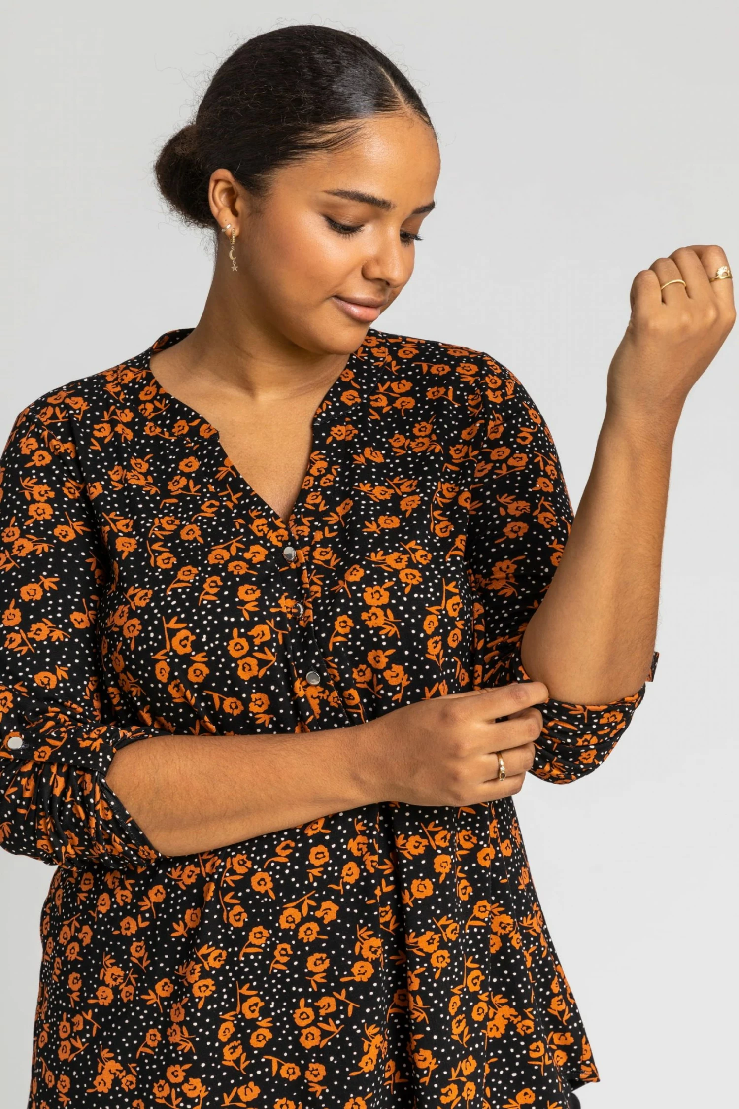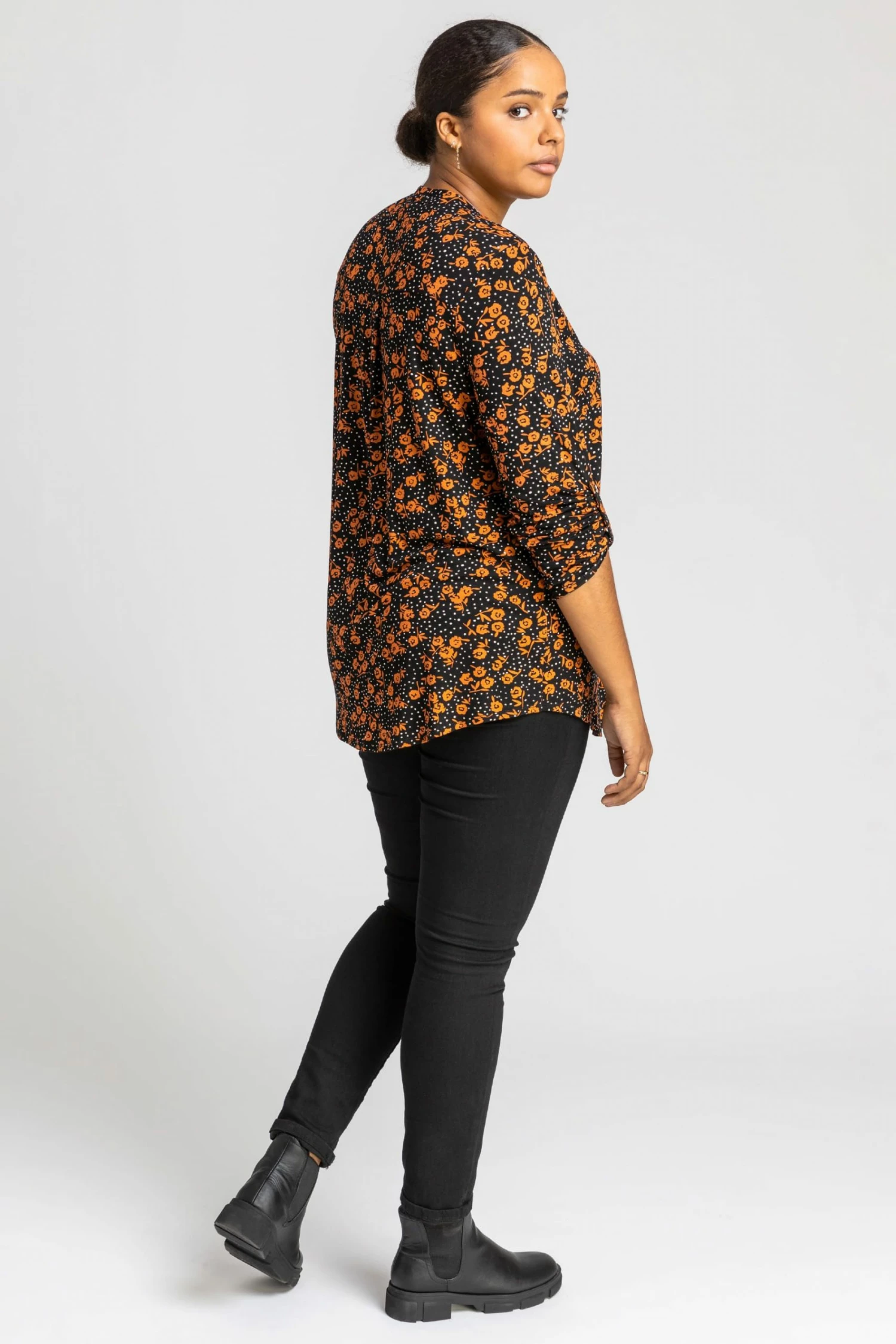 Update your floral collection with this autumnal ditsy spot addition. Easy to dress up or down, this new blouse in our curve range is perfect for any occasion throughout the year. This unique silhouette is effortlessly flattering with a stretch jersey material and half button placket the centre front. The longline shape is complemented by 3/4 length tab sleeves and a comfy v-neckline that flatters the bust. Pair this with jeggings and boots for an easy day to night style.