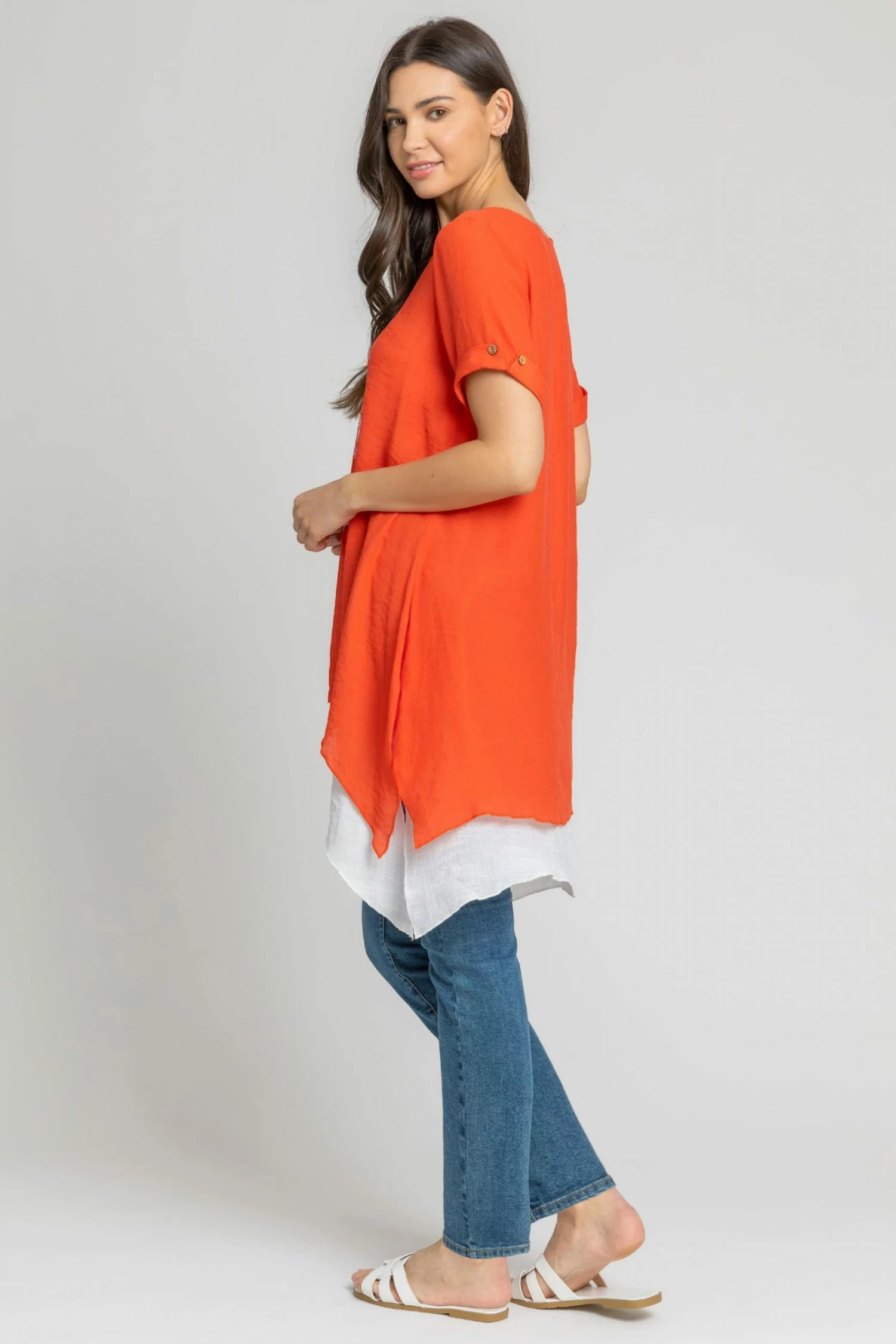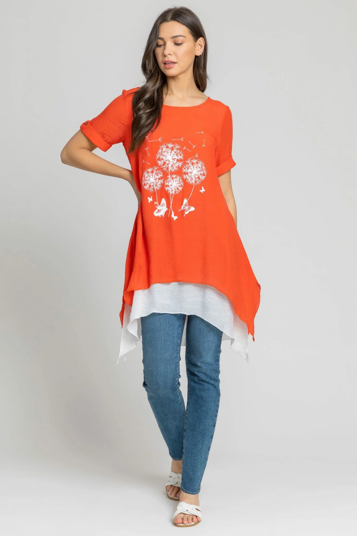 Update your Spring casualwear with this versatile wardrobe staple. Featuring a floral dandelion print and contrast asymmetric hemline, this tunic top is made from an easy breezy lightweight material. The short sleeves are finished with a delicate button detail whilst the flattering hanky hem silhouette is brilliantly flattering on all. Throw this over your favourite cropped trousers for a Summer holiday or jersey leggings for an everyday go-to style.