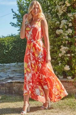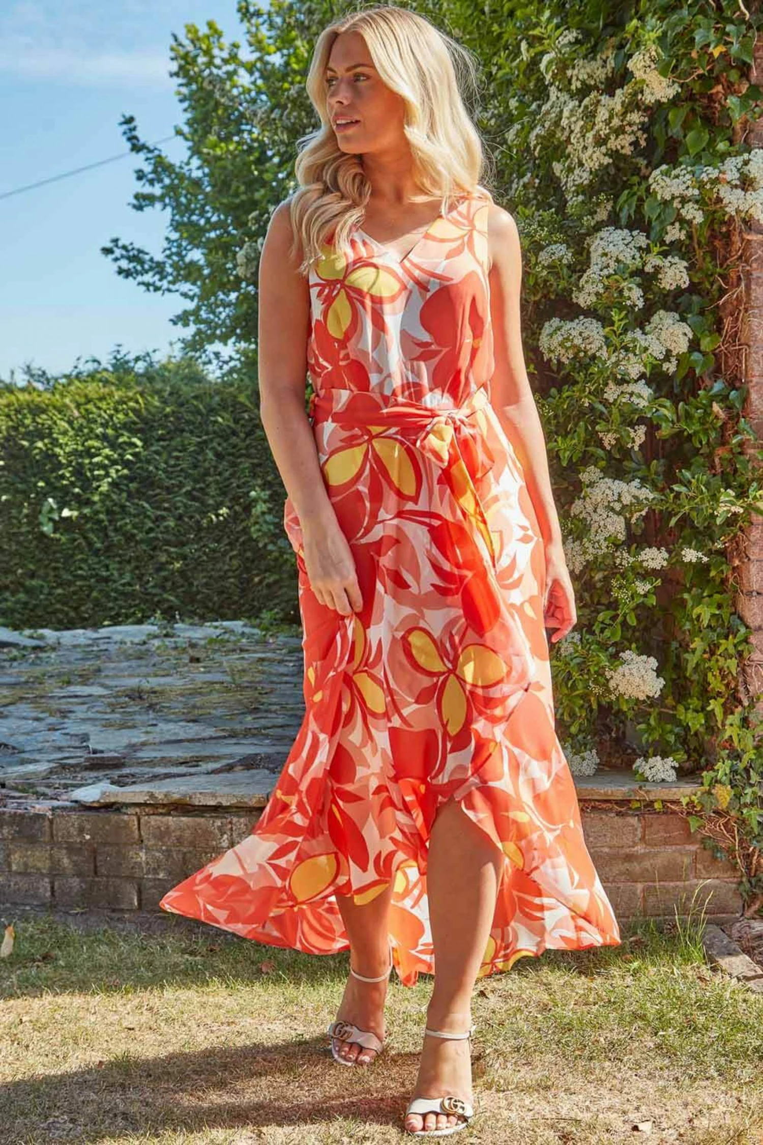 Keep things classy in this chiffon belted midi dress. Featuring a wrap over v neckline and a matching tie belt to flatter your figure, this dress is perfect for summer weddings and race days! It comes in a vibrant floral print in hues of orange that is off-set against a classic cream background. Pair with some statement earrings and simple heels for a sophisticated look!