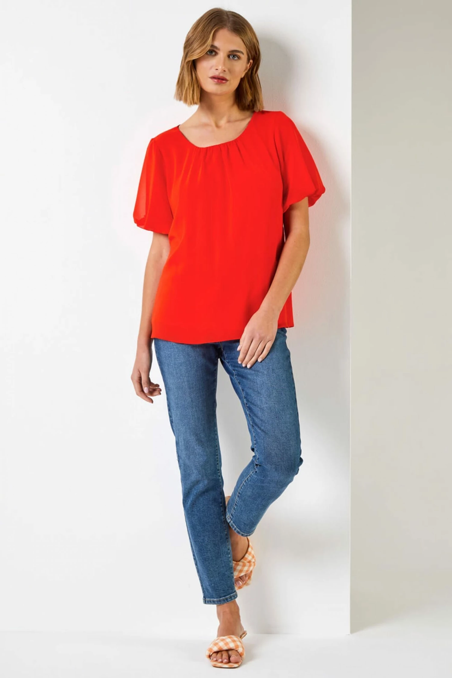 This easy-to-style wardrobe winner is essential for any ladies collection. Cut to a relaxed fit, this round neck top has an adorable puff detail to the short sleeves and is dual-layered to add a modest touch. Wear this chiffon style with a light denim jacket and jeans for an everyday style to take you from a picnic in the park and beyond.