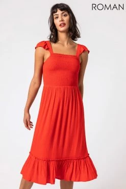 Make sure to pack this holiday essential with you this season and add that pop of colour to your wardrobe. Cut from a crinkle textured fabric, this midi-length dress has a comfortable shirred bodice with frill detail to straps and hemline. Pair yours with your favourite sandals and a denim jacket for a stylish everyday look that is just perfect for summer.