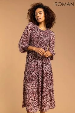 Add a pop of pink and a timeless animal print to your wardrobe with this striking tiered midi dress. Shirred to perfection all across the bust, this dress is so stretchy that it is easy to pull on over the head and flatters any figure. Pair this with boots and a jacket for a autumnal walk or dress it up with heels and a clutch for an evening dinner date!