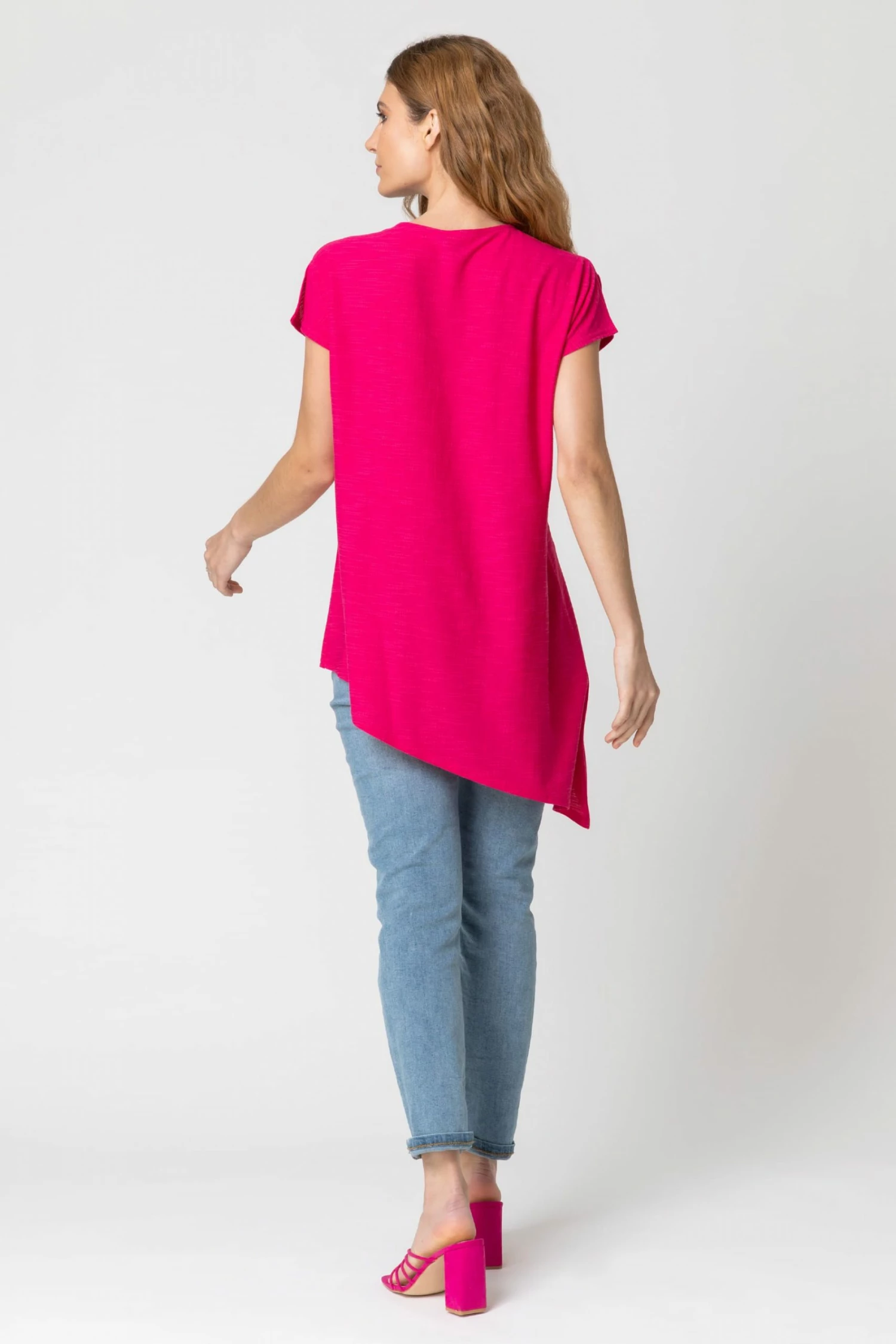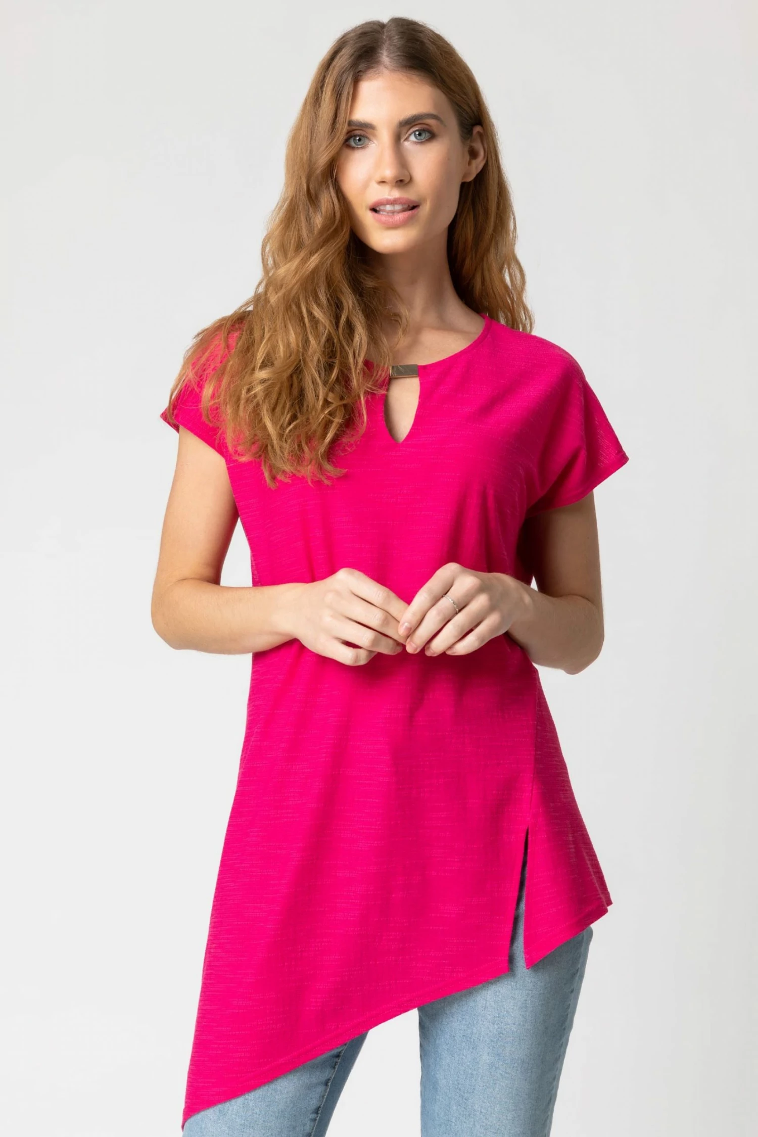 Turn heads with this ultimate stylish textured asymmetric top. The split detail short sleeve top has a stunning metal trim detail with an asymmetrical hemline that features a small split detail. This is an effortlessly stylish piece that will keep you comfortable all day long. Pair it with some straight light coloured trousers for a day time event or paired with your favourite denim jeans and sandals for a more relaxed yet put together casual look.