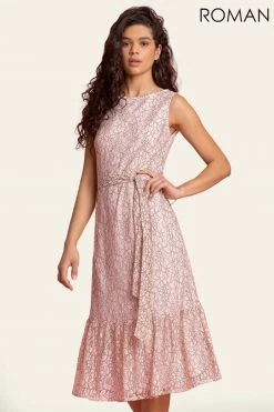 Turn some heads with our elegant occasionwear pieces in classic yet timeless silhouettes. Cut in a favourite fit and flare from a beautiful lace material, our midi-length dress has a sleeveless design with a tiered skirt detail. Belted at the waist, pair this event-ready style with a faux fur bolero, heels and matching clutch to be the belle of the ball.