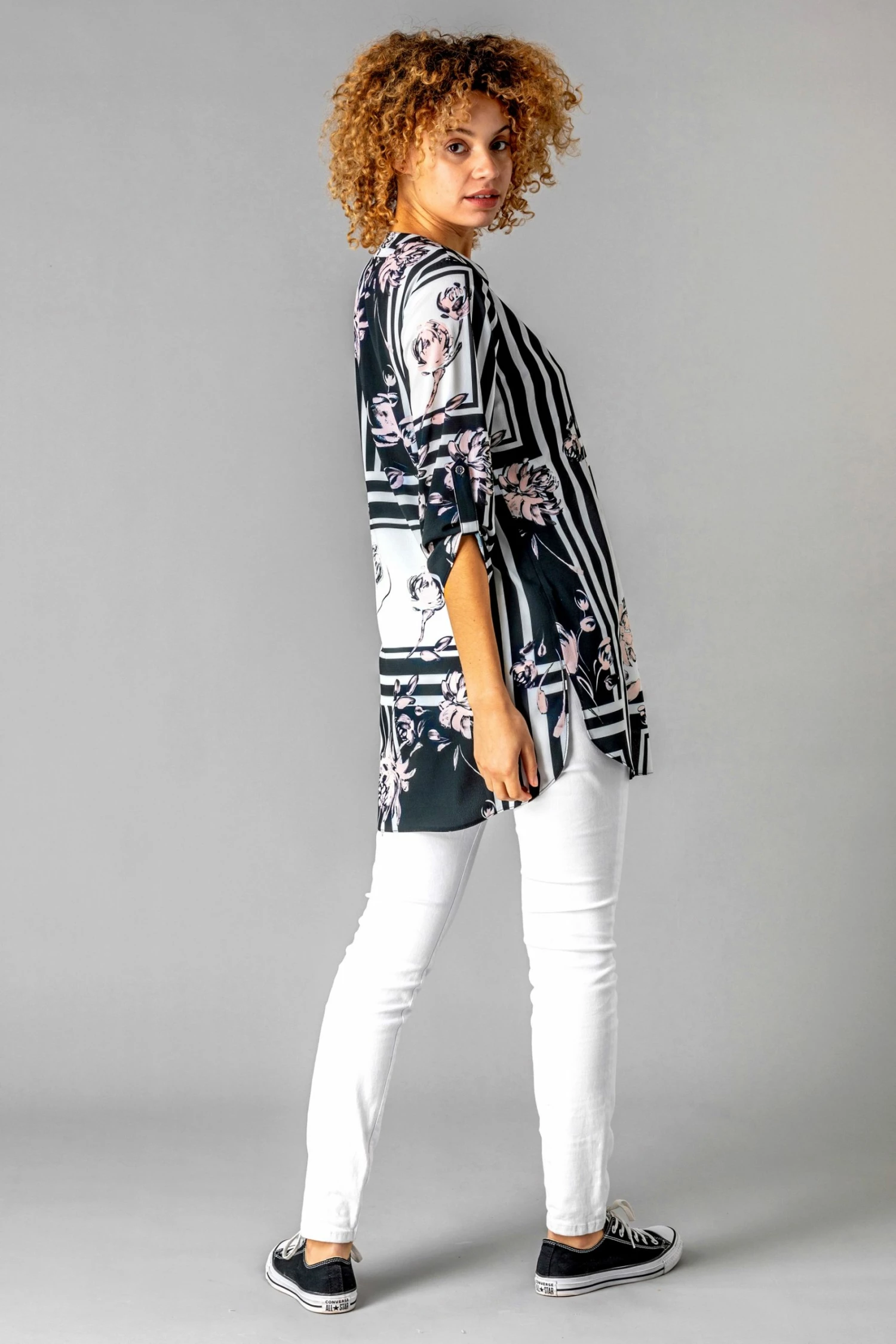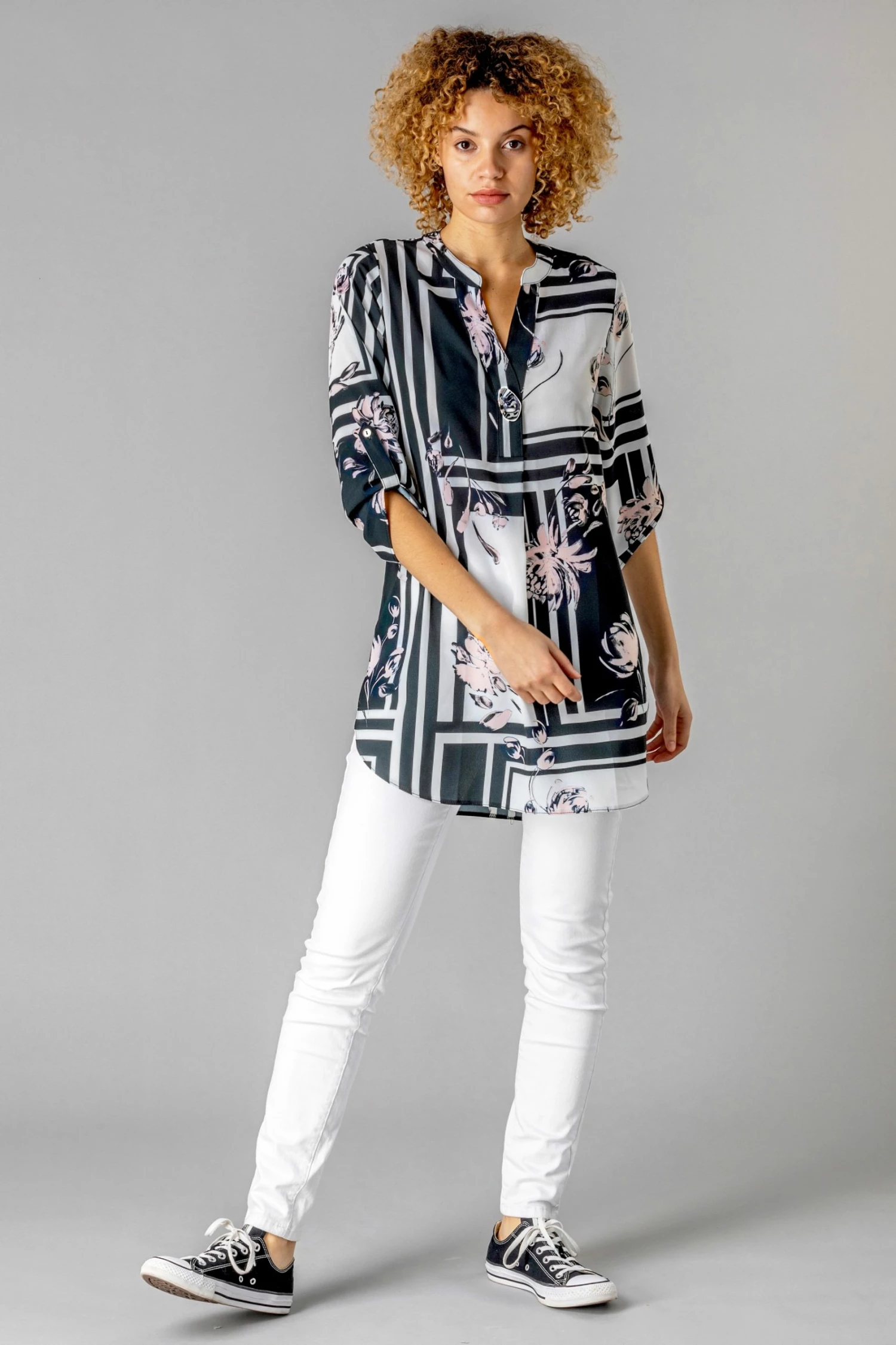 Block out those winter blues with our colourful longline woven top, add this staple piece to your everyday wardrobe collection. Featuring a stand out colour block floral print and a classic notched neckline with large contrast mock button detail to the front. This top comes with 3/4 length sleeves with buttoned tabs to keep you cool and comfortable this season. Wear casually from day to day or dress up with dark jeggings, heels and a cute clutch for a versatile desk to dinner outfit.