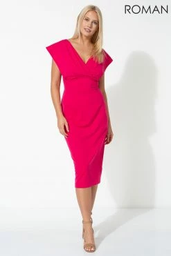 Sultry and slinky, this fitted midi dress is versatile, flattering and chic for all your new season events. Made from a comfortable stretch scuba fabric this pretty pencil dress also features short sleeve coverage, an on-trend midi length and cross over bow detailing at the neckline. Ideal for achieving the best of both worlds between a bodycon and a bardot, this stylish dress just needs high heels and a swipe of your favourite lipstick to help you shine this party season.