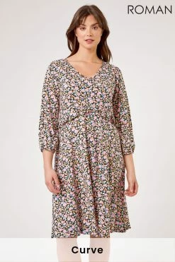 You will be wanting to add this Roman Curve dress to your wardrobe, featuring a ditsy floral print this jersey knee length dress can we worn all year round. Finished with a flattering v neckline, frill waist detail and 3/4 length elasticated cuff sleeves, this fit and flare dress is an essential for any casual collection. Team with a denim jacket and pumps for a picnic in the park.