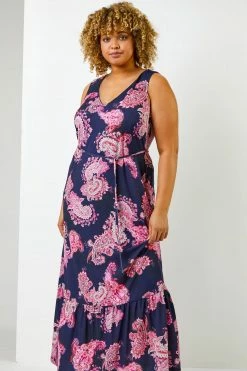 This sophisticated V-neck number is a modern twist on a timeless silhouette. Our latest tie-waist black maxi dress features a fun paisley print design and a subtle frill hem to give this look a fun edge. Sleeveless and lightweight, this summer dress can be paired with sandals or wedges for a stunning look whether home or away.