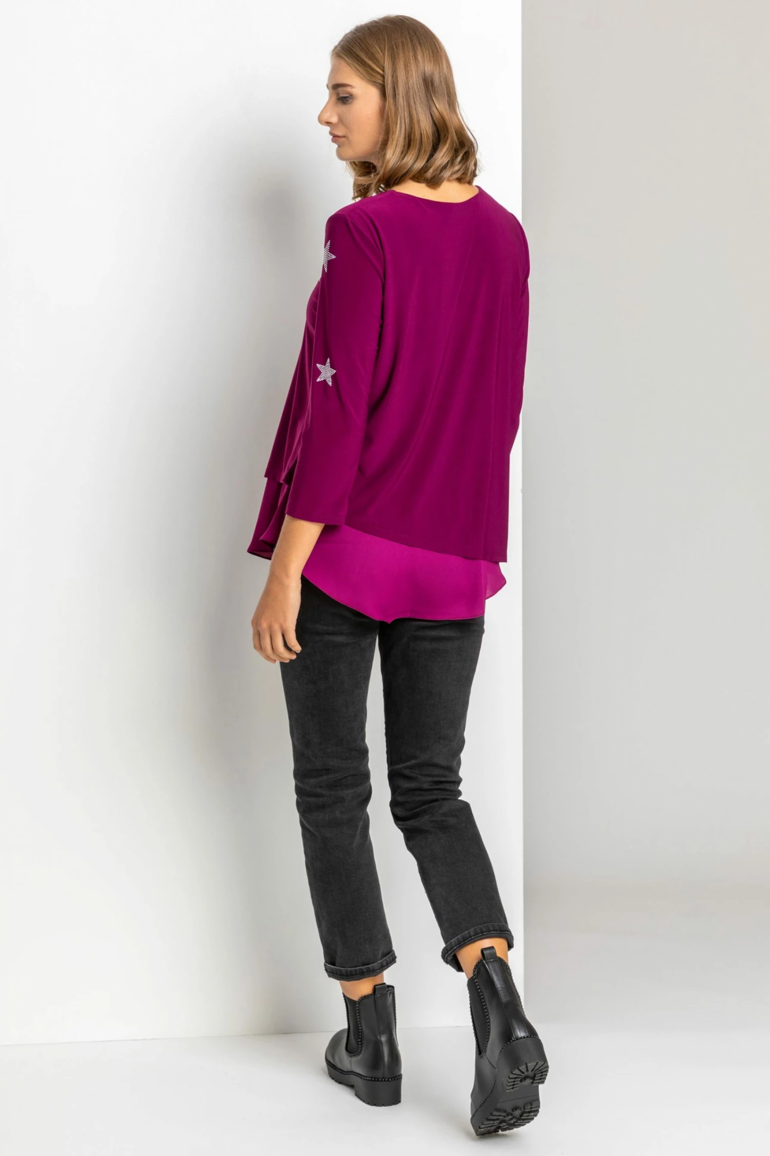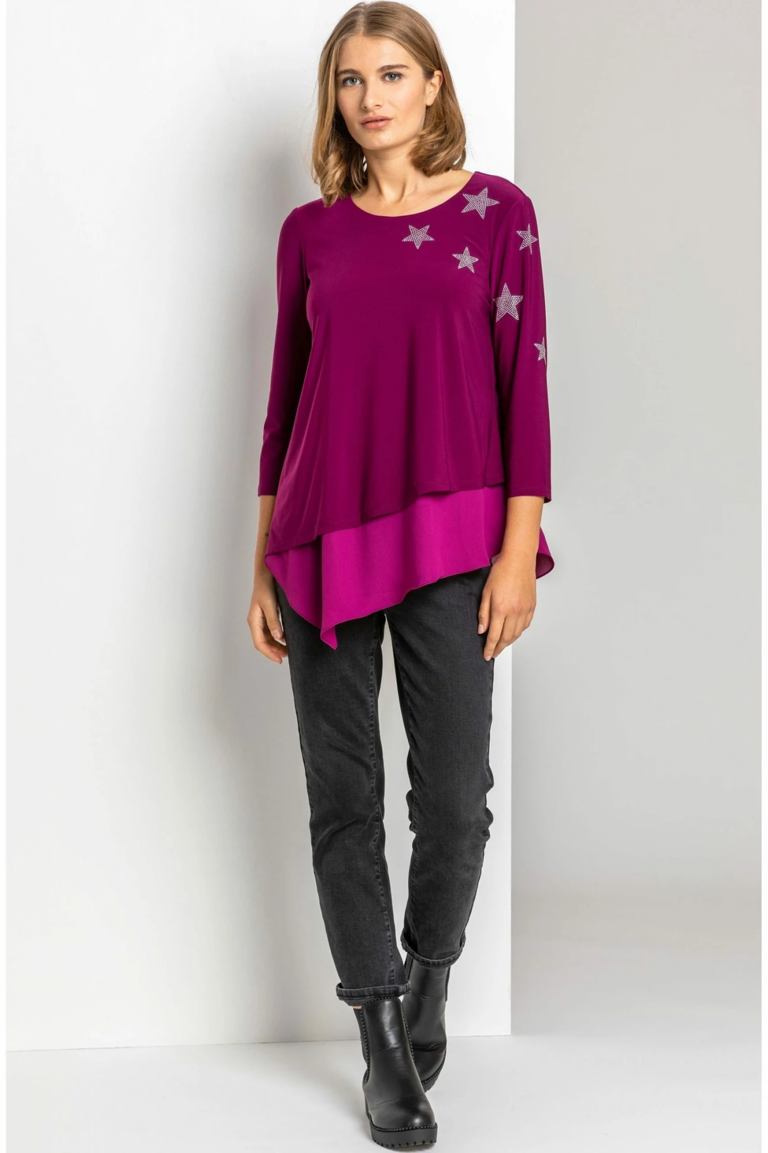 Comfort meets style in our embellished star top. This party piece is crafted in a soft jersey with 3/4 length sleeves and an asymmetric chiffon hem. Adorned with sparkly hotfix stars at the shoulder and sleeve, this double layered look top, looks great paired with denims.