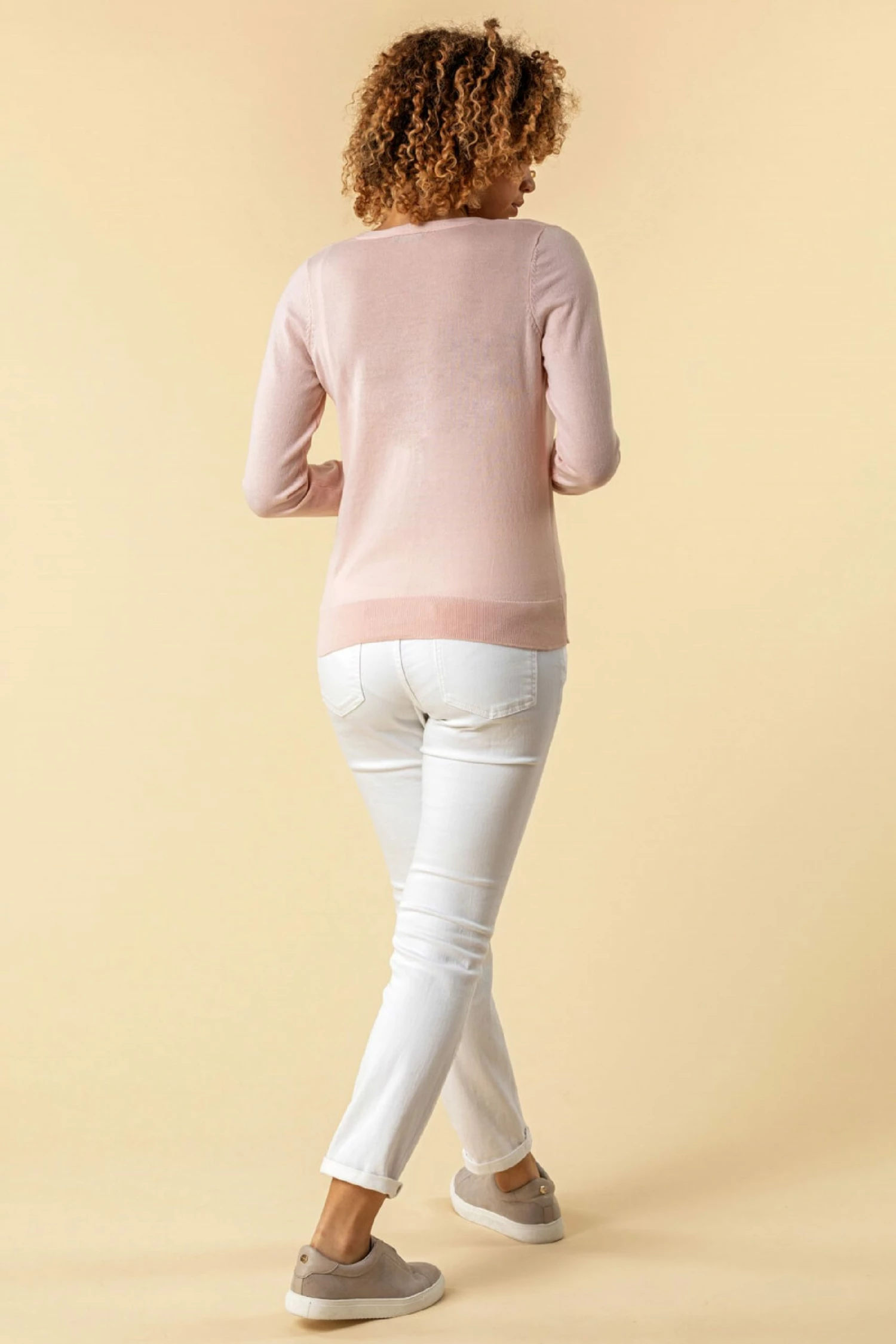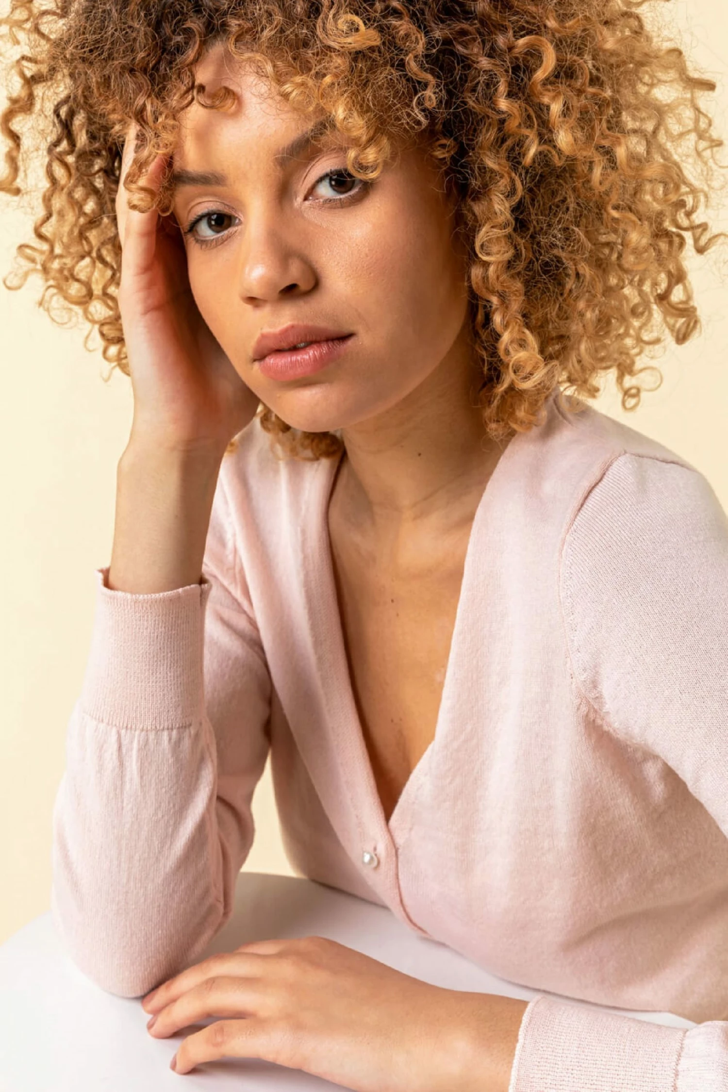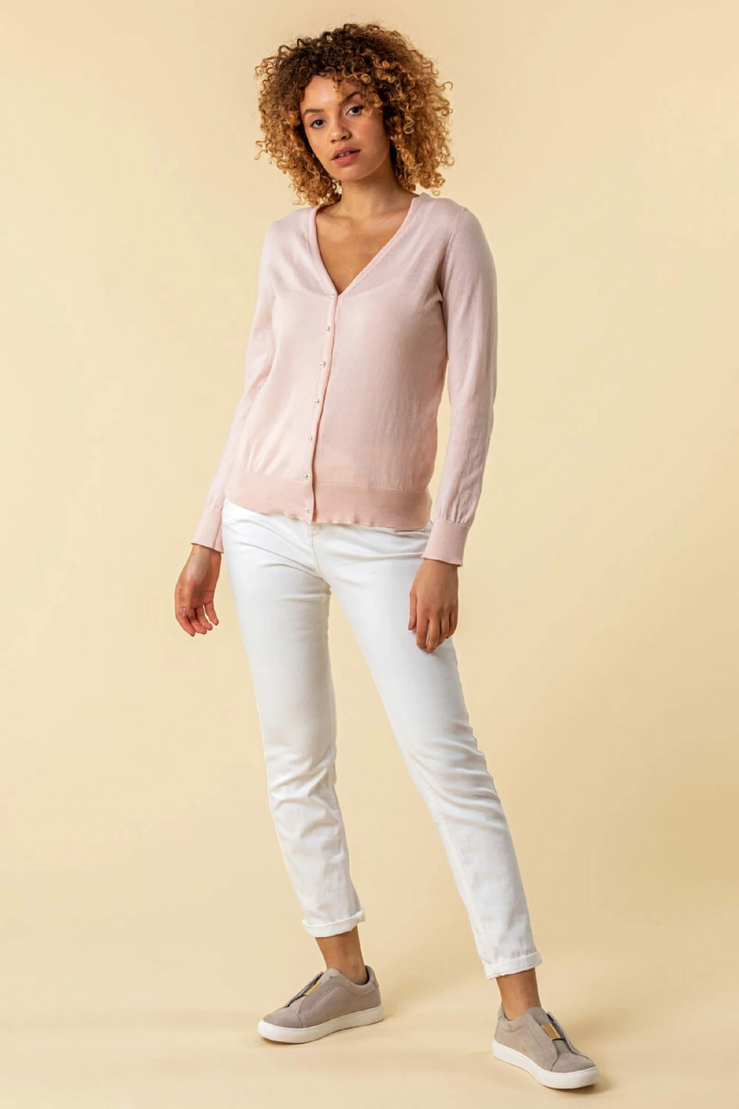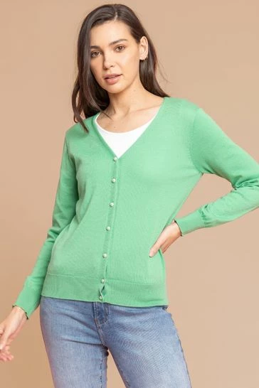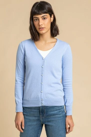 Perfect spring pastel tones are so on-trend this season so make sure to add to your seasonal collection. Made with a classic v-neckline, this long-sleeved cardi is made from a super soft touch fabric and has a beautiful pearl button detail down the front. Pair with your everyday staples or wear as an additional layer with your workwear.