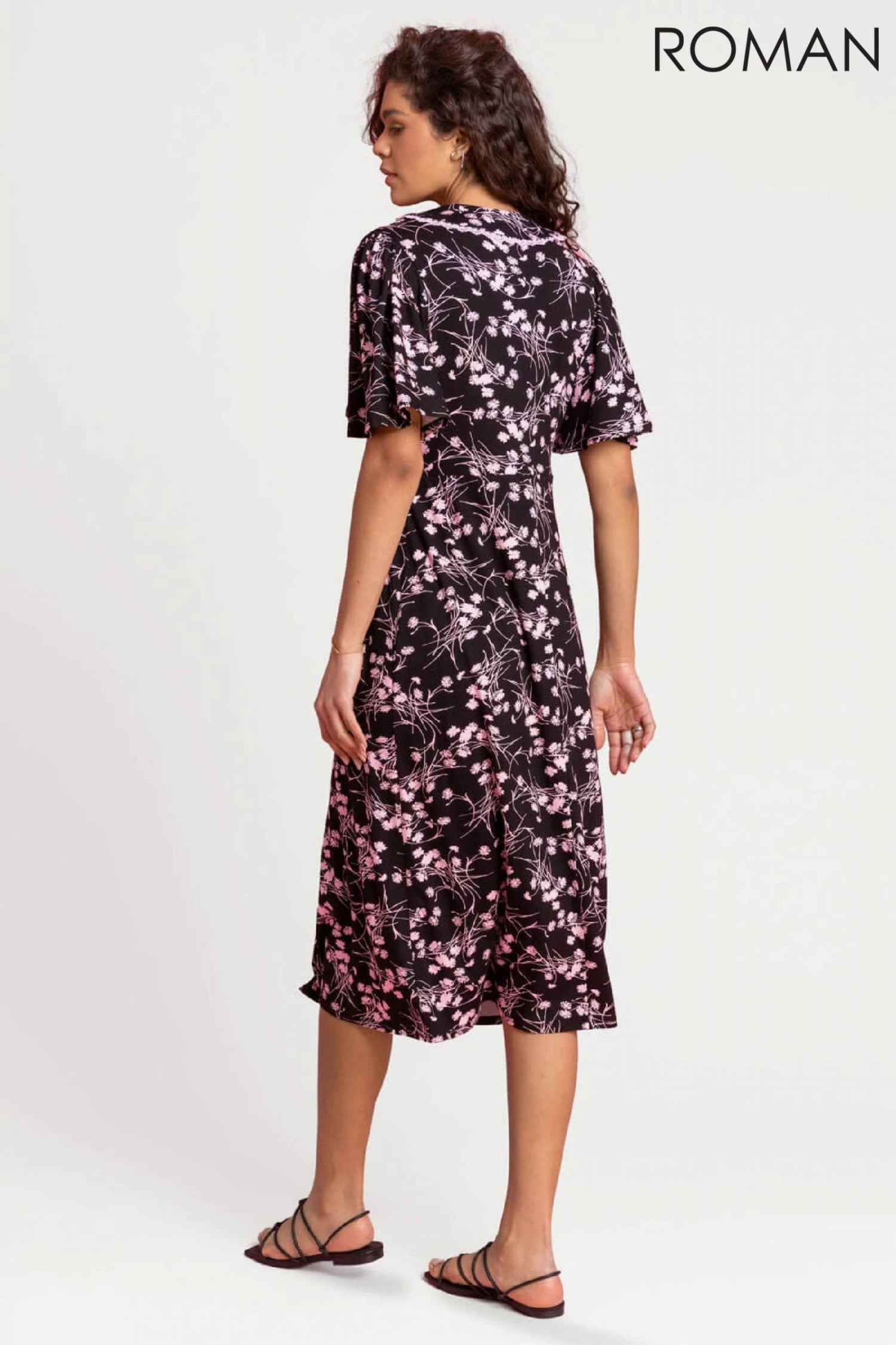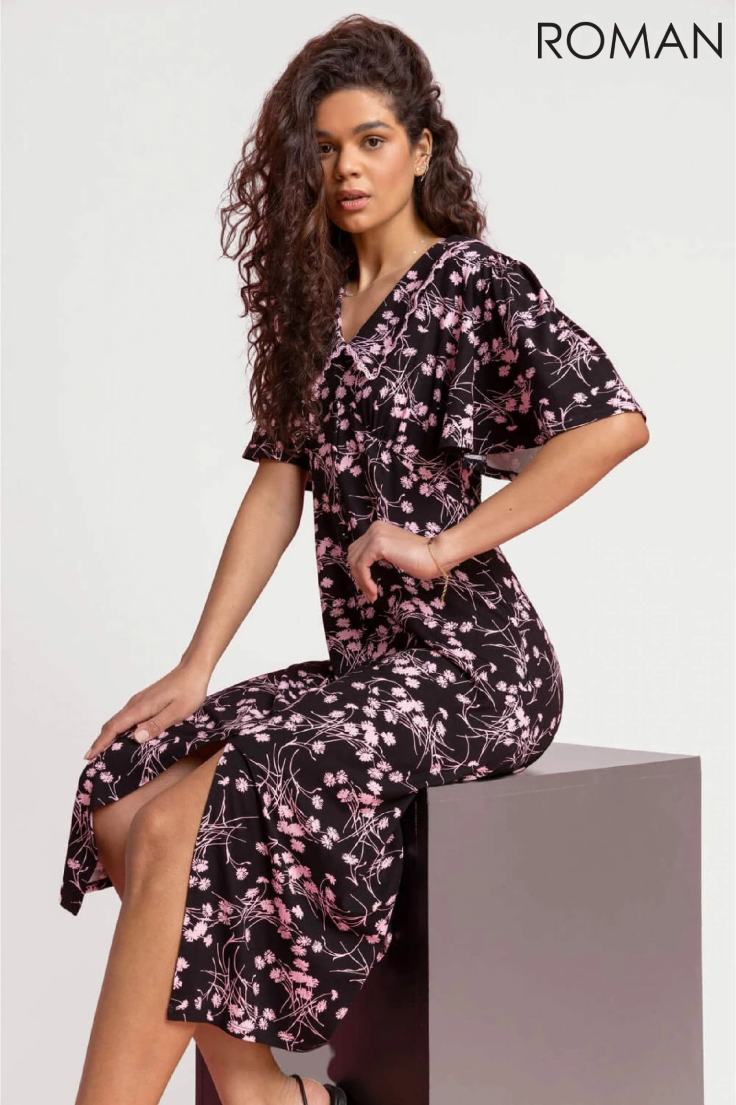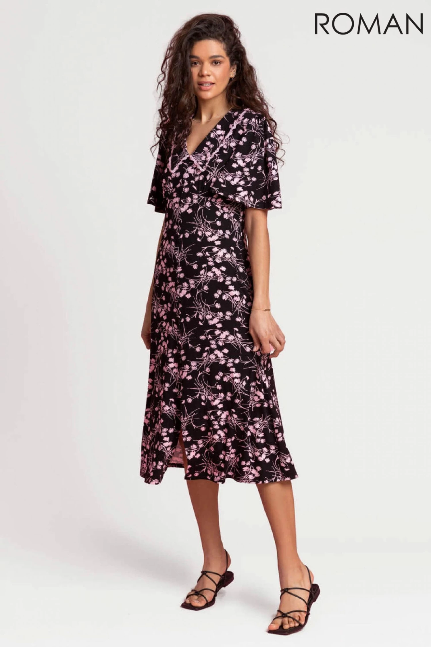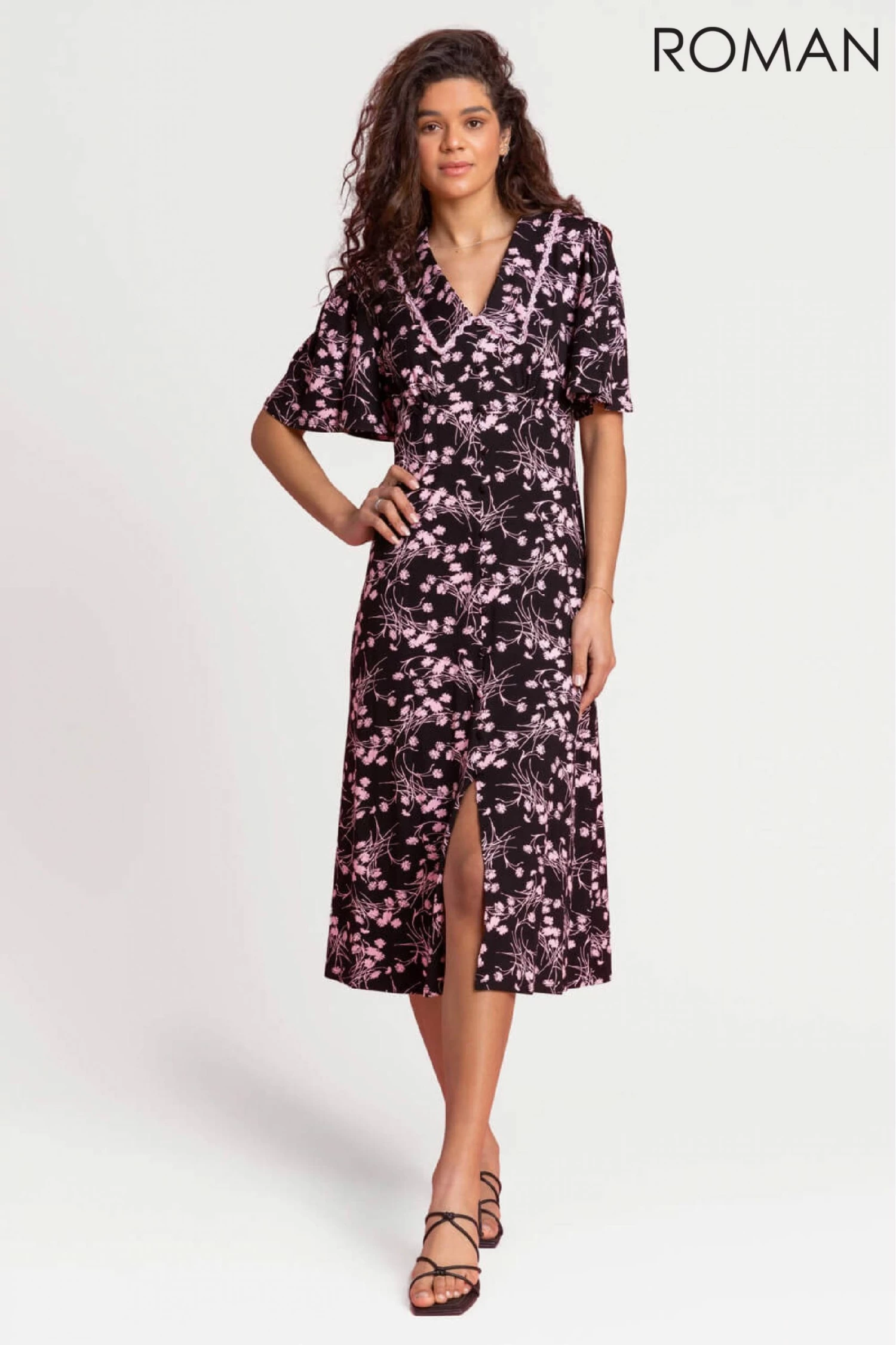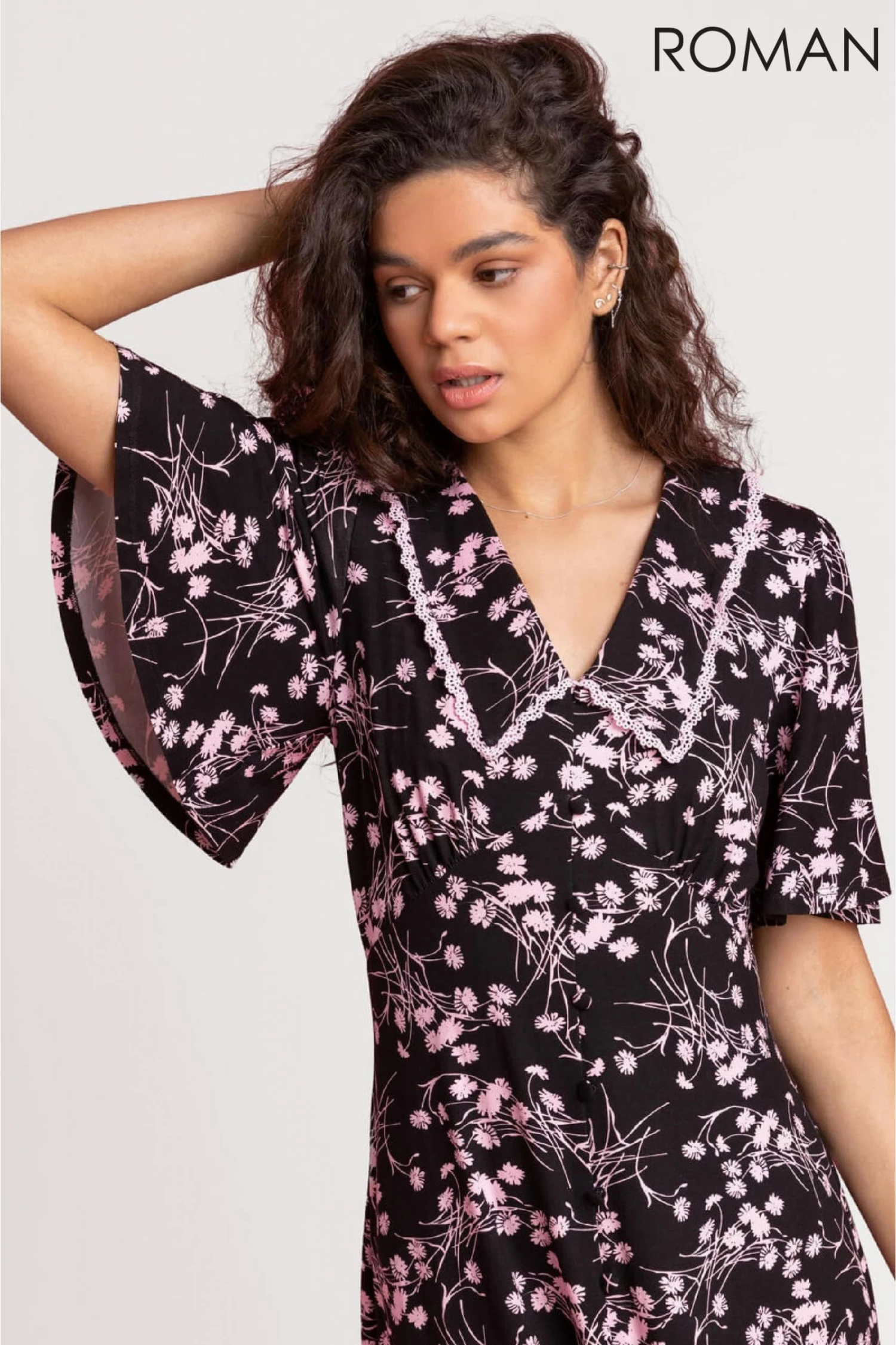 Flaunt your florals this spring-summer in timeless silhouettes and lace trims. Cut to an elegant fit and flare shape, this midi-length dress has short angel sleeves with an adorable peter pan collar. Finished with delicate lace trims and a small slit detail to the front, Pair this printed piece with pumps and a lightweight cardi for a casual look then add heels and a denim jacket for a date night alternative.