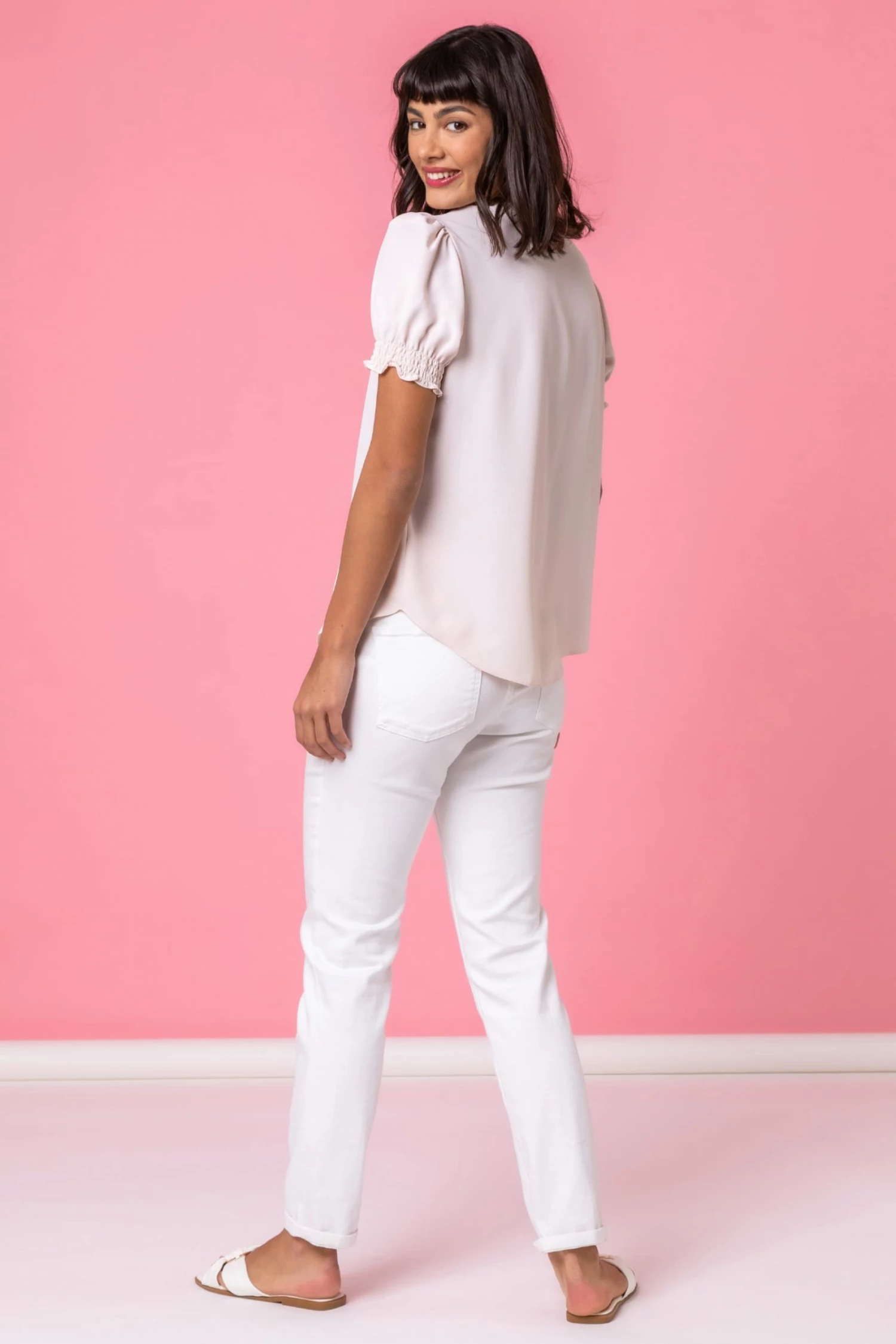Frills to thrill! Embellished with gorgeous ruffle detailing at the front and around the neckline, this feminine top can be dressed up for any occasion. This v-neck has an elasticated shirred short sleeve and is the perfect addition to your suitcase for your travels. Finish the look with white denim and sandals or switch to colourful cropped trousers for the perfect summer holiday ensemble.