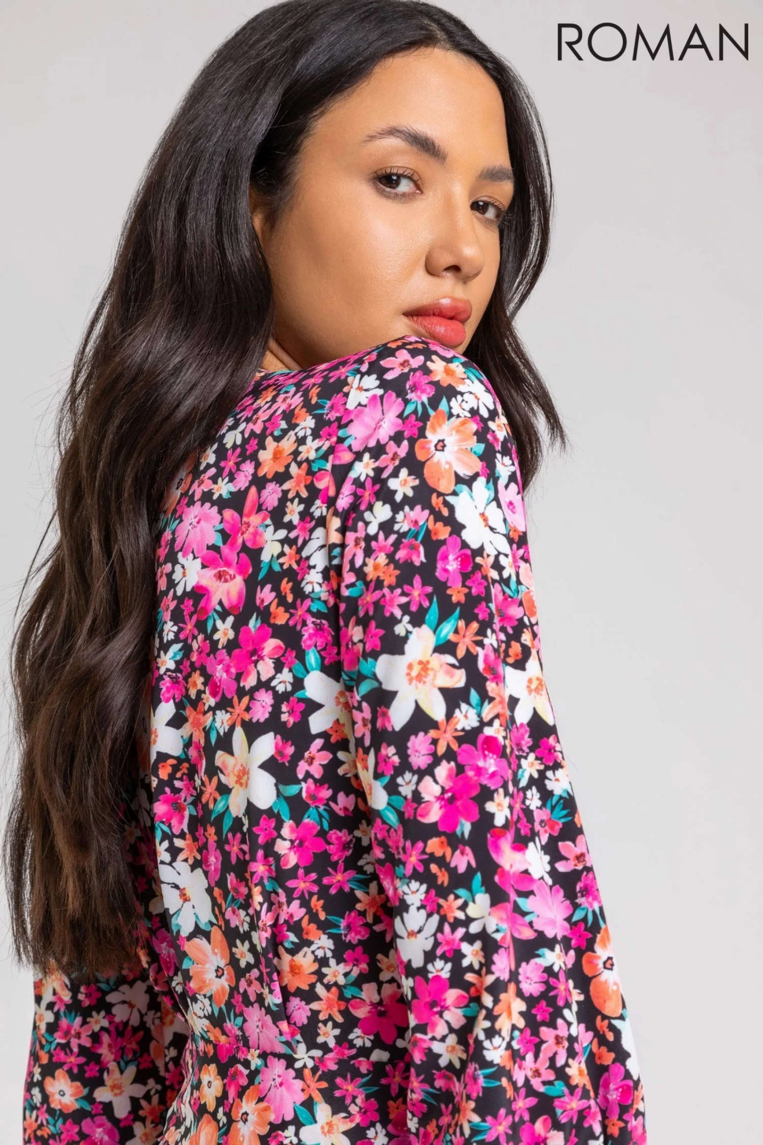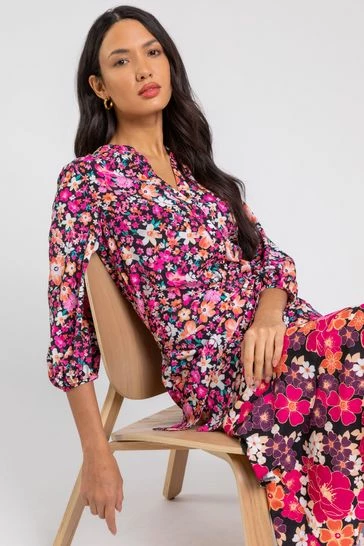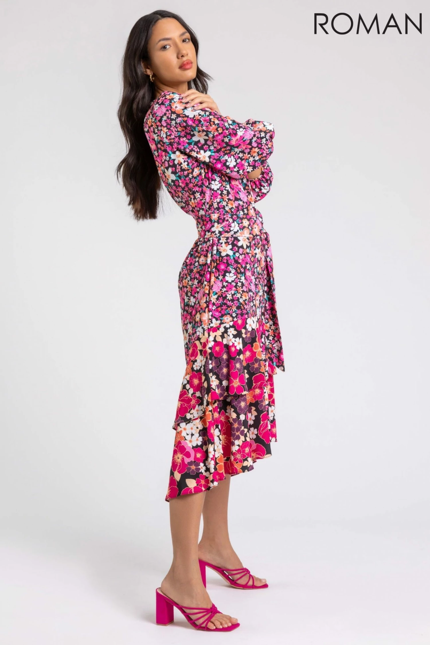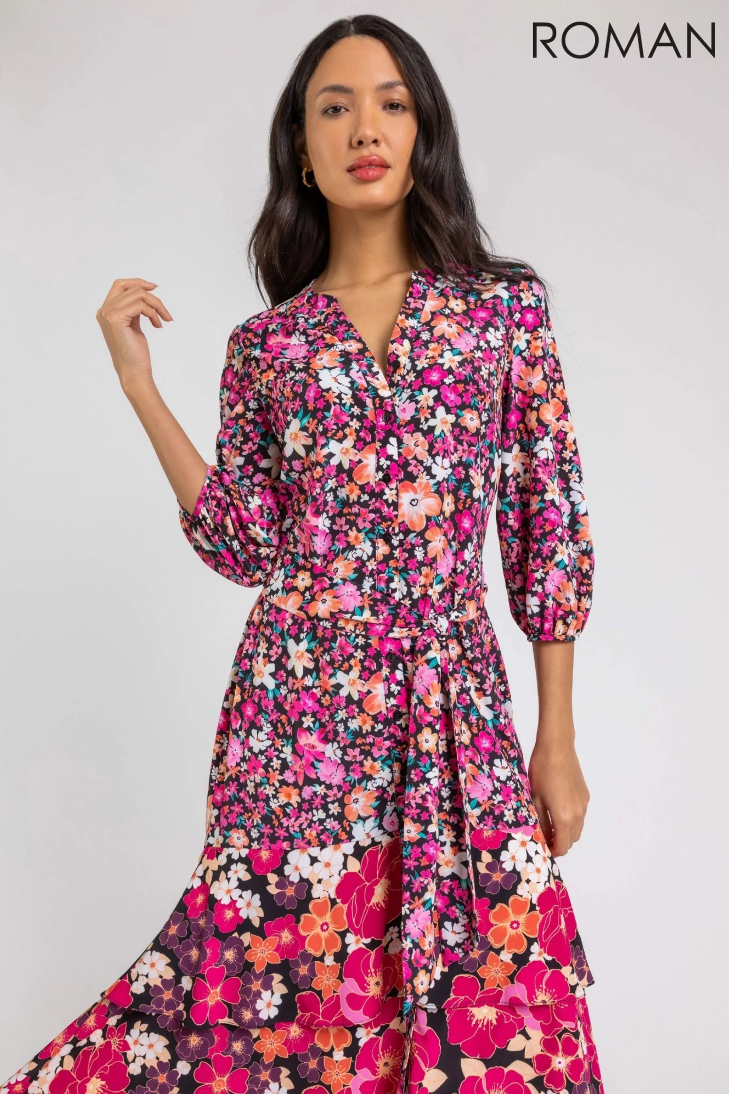 Live out a bold boho dream in this buttoned floral number. Featuring a timeless notch neckline this shirt dress has full-length buttons and 3/4 sleeves elasticated at the cuffs. Finished with a contrasting floral print to the on-trend frill hem and belted to the waist with a matching tie. Pair with pink heels and a fascinator for a statement summer occasion look.