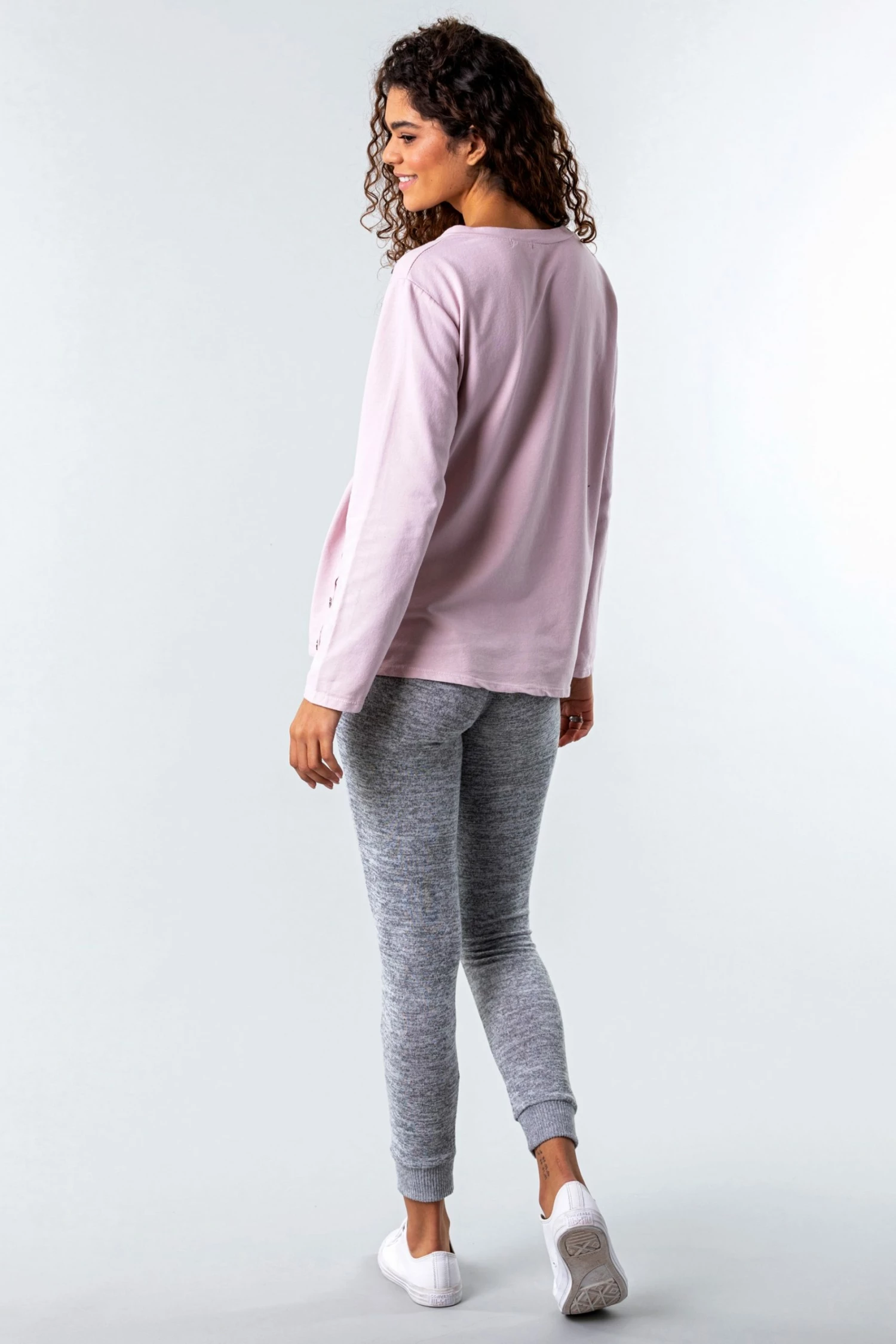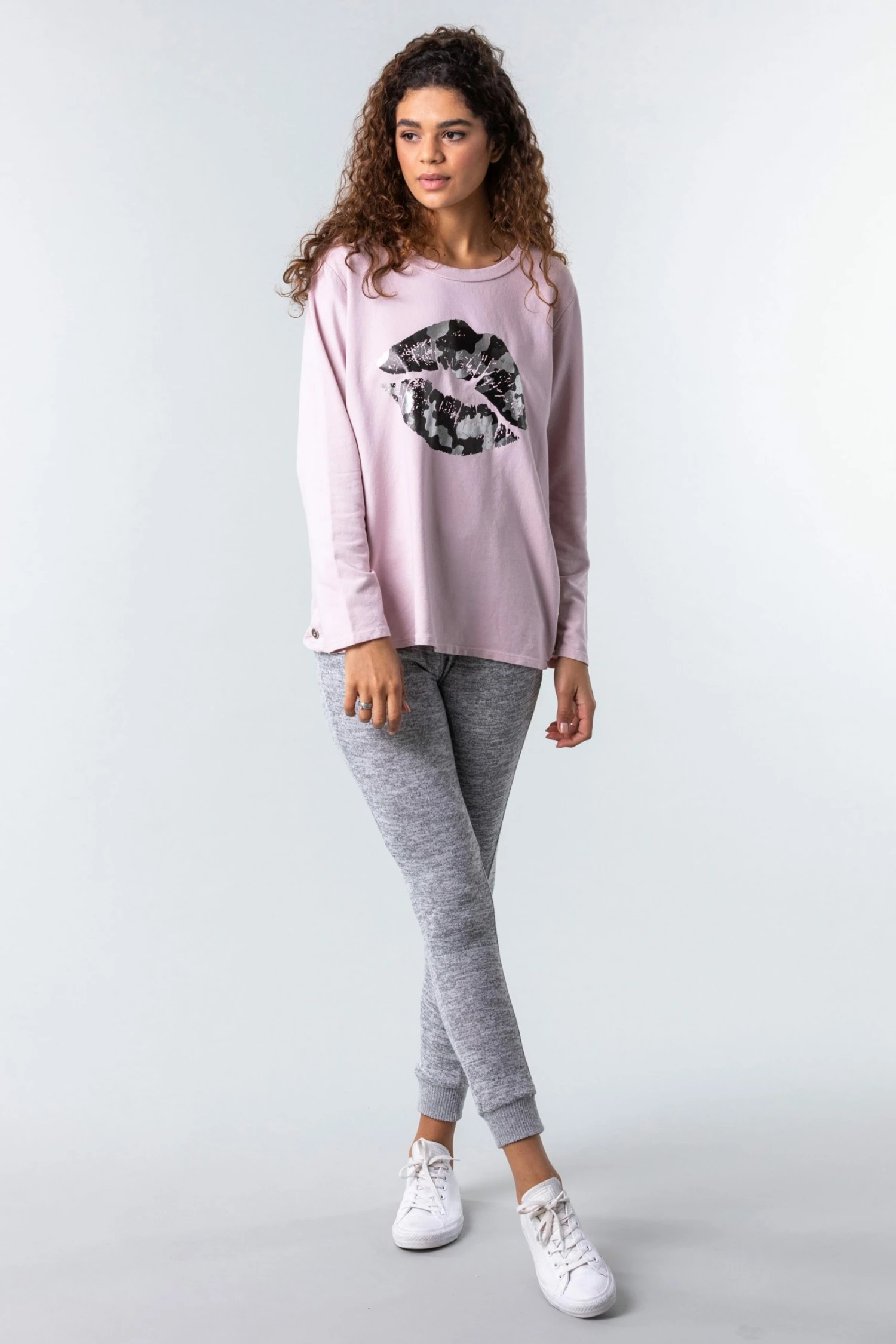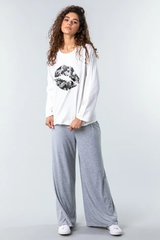 Slouchy in shape but fashionable in style, this new loungewear piece is so versatile. This chic new one size top features full length sleeves and a bold foil print lip motif on the front. With added button detailing at the side and an easily turned up sleeve, this cosy sweatshirt can be worn with ease on those off duty days. Pair with your comfy leggings and fave flats for a stay at home outfit that will look effortlessly cool when running daily errands!