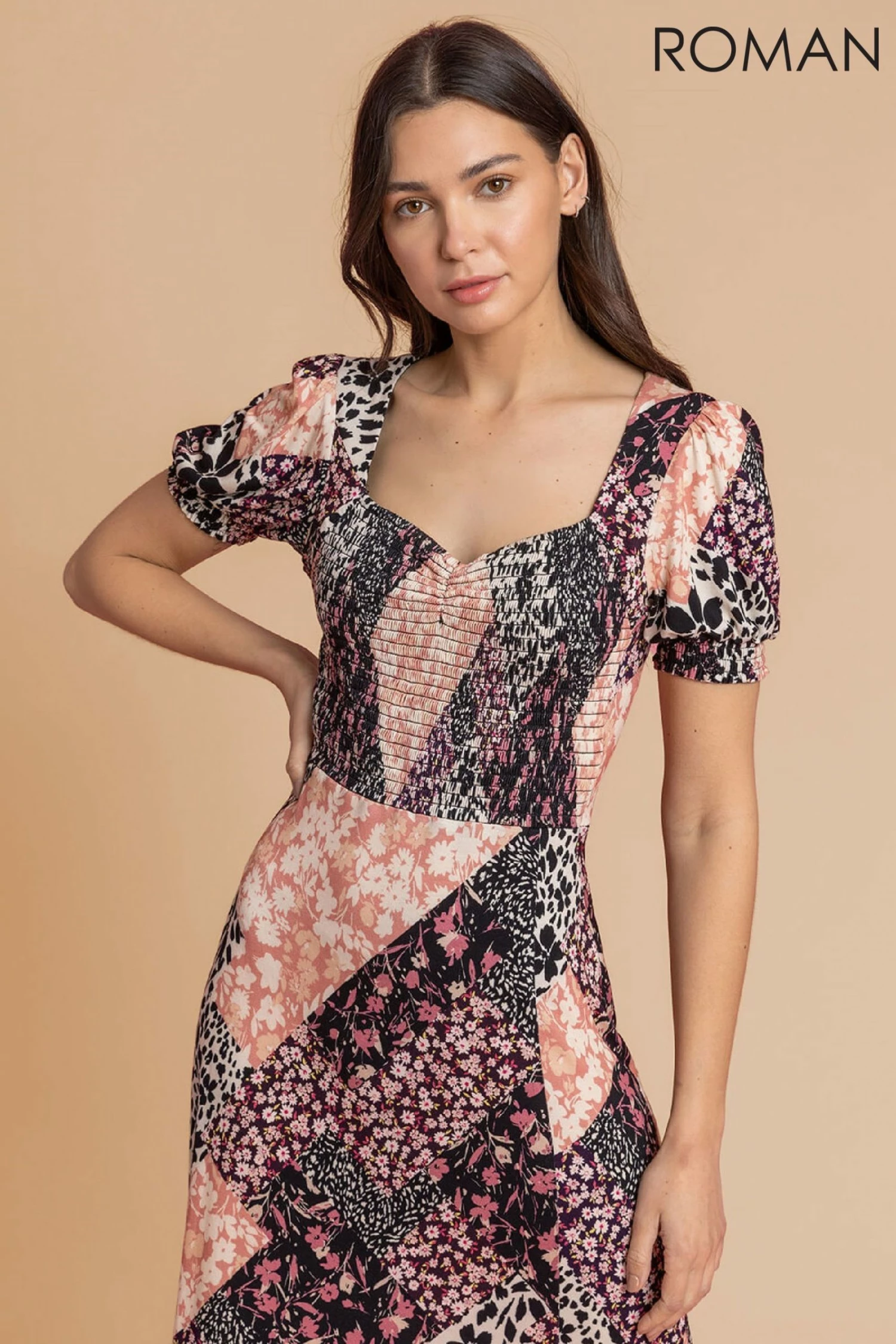 Be a boho babe this spring summer with our stylish new patchwork print and flattering sweetheart neck tea dress. Finishing at a floaty midi length that is just perfect for picnics in the park, our ditsy floral dress has comfy shirring across the bust that is easy to pull on and go. Add this short sleeve number to your summer staples with a pair of sandals and a shoulder bag!