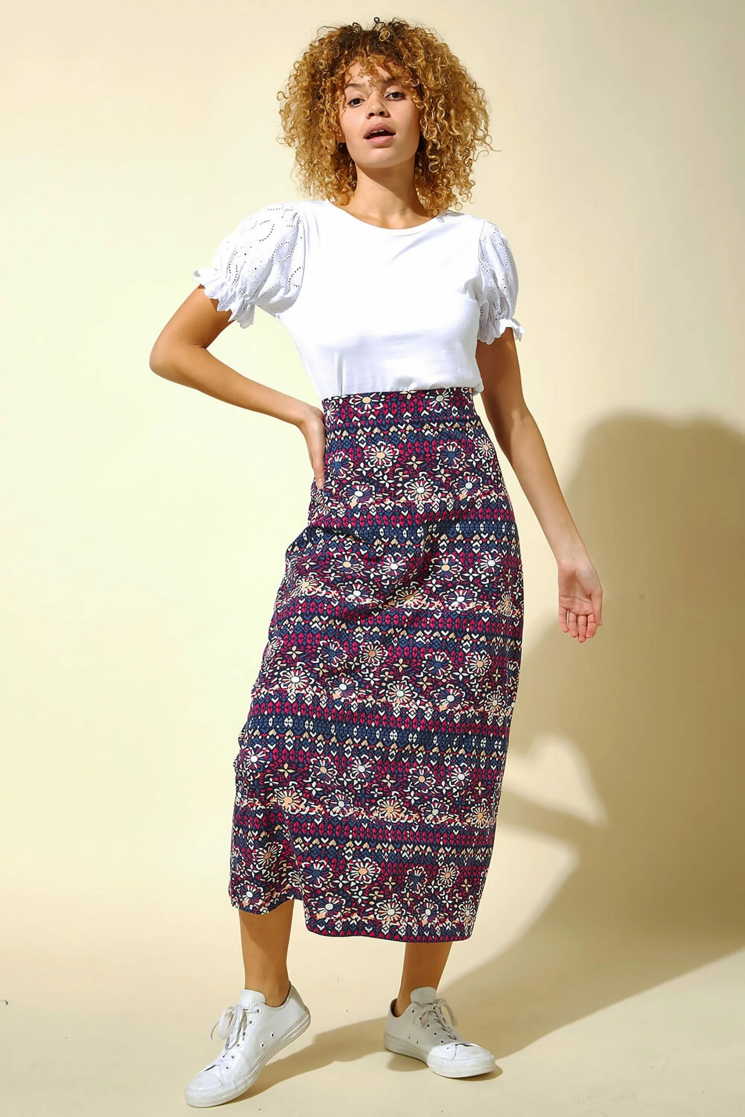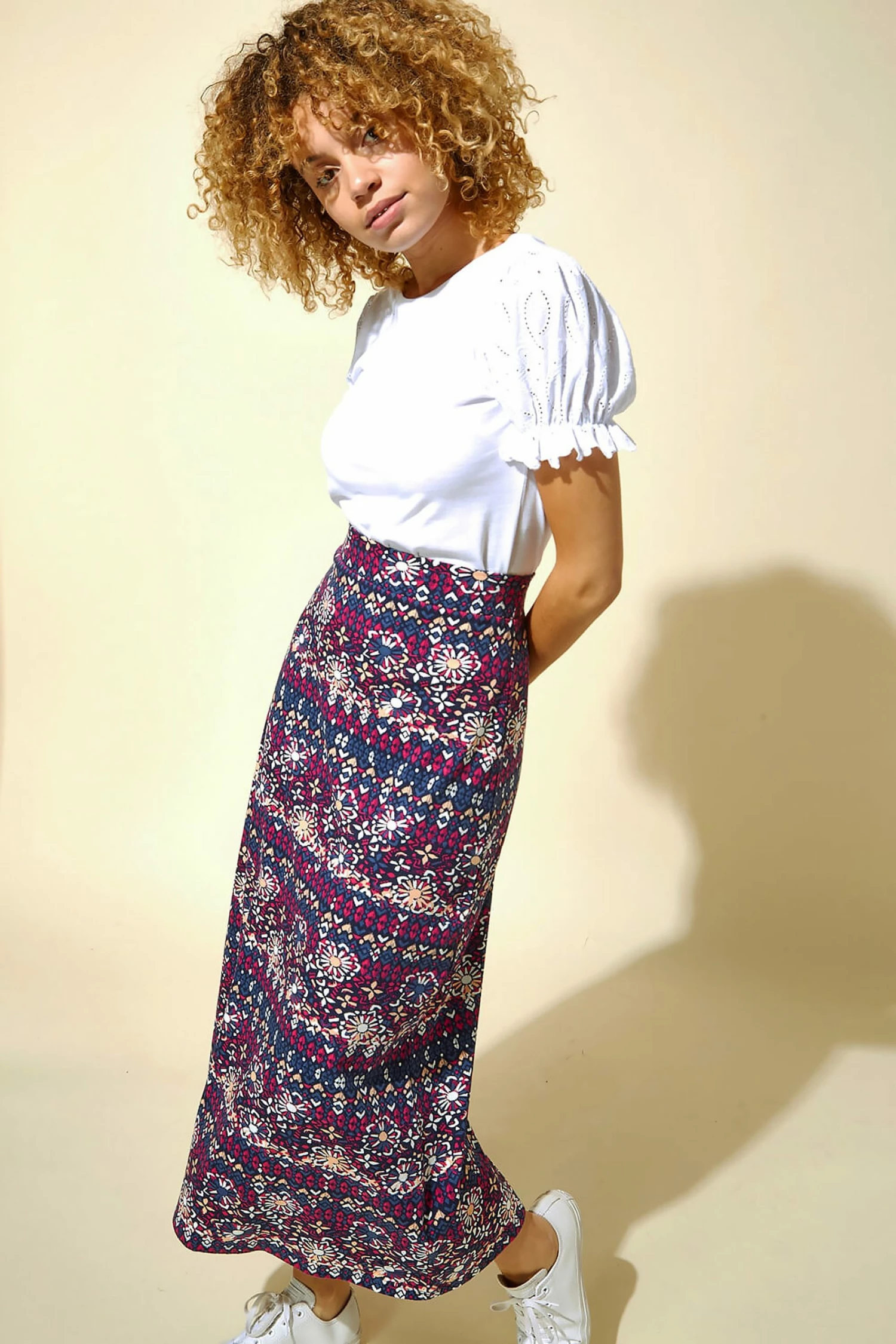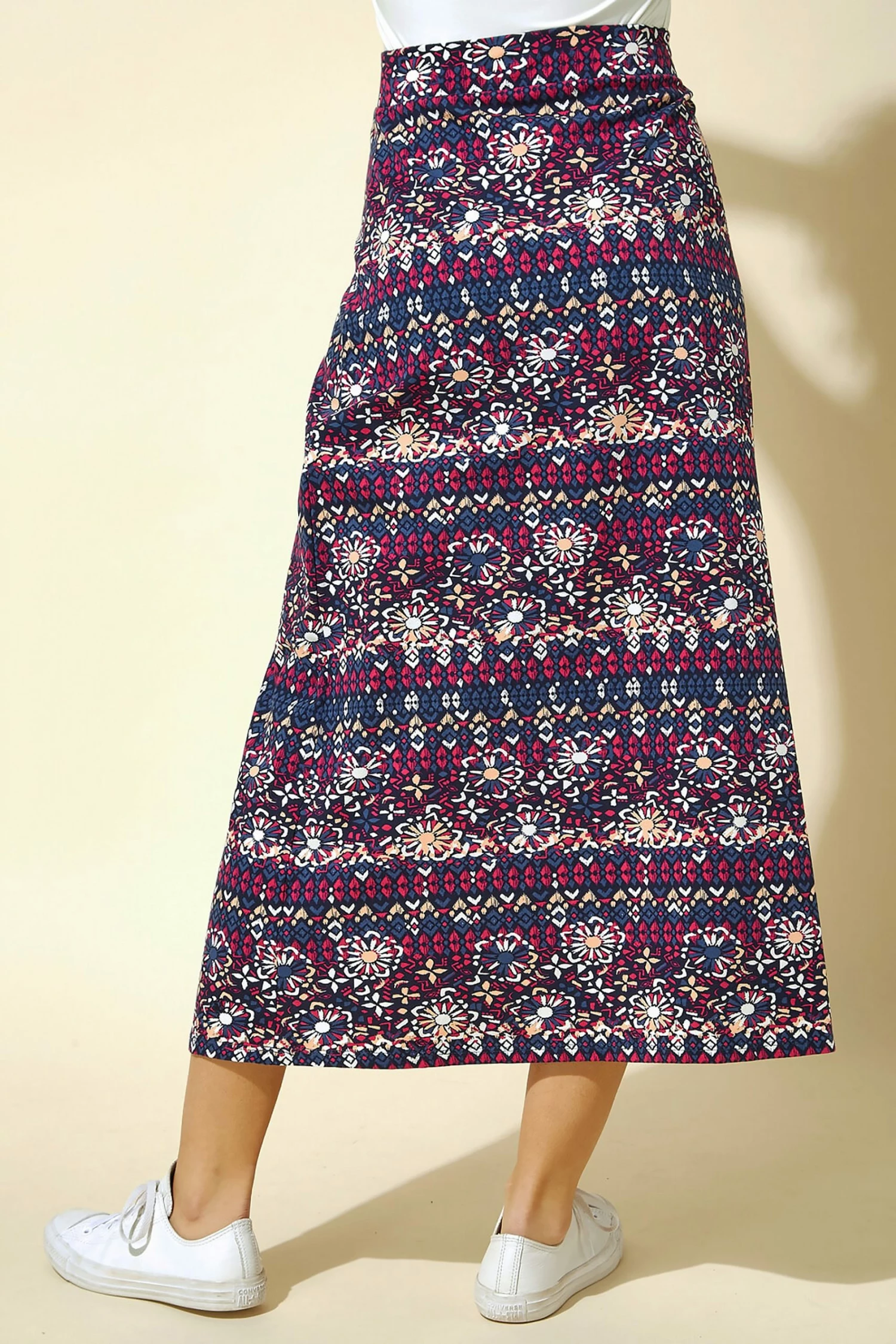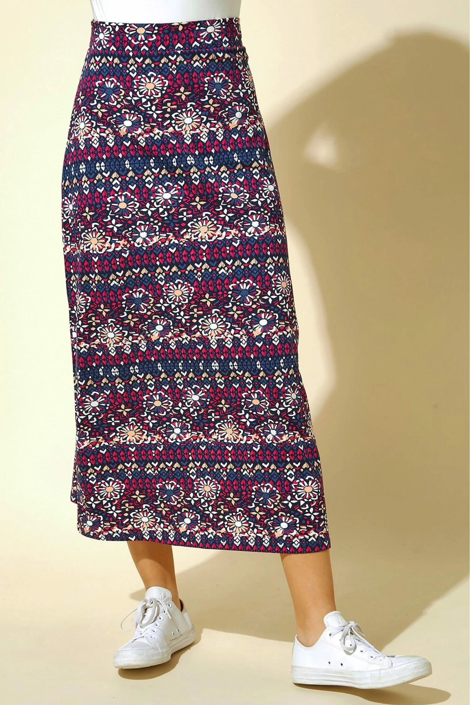 Change up the prints in your wardrobe this season with an Aztec tile-inspired midi skirt. Our jersey skirt features an elasticated waistband for comfortable wear and pull-on style, finished with an all-over pattern. Wear out with your casual everyday tee’s or dress it up with a vest top and wedges for a date night ready outfit.