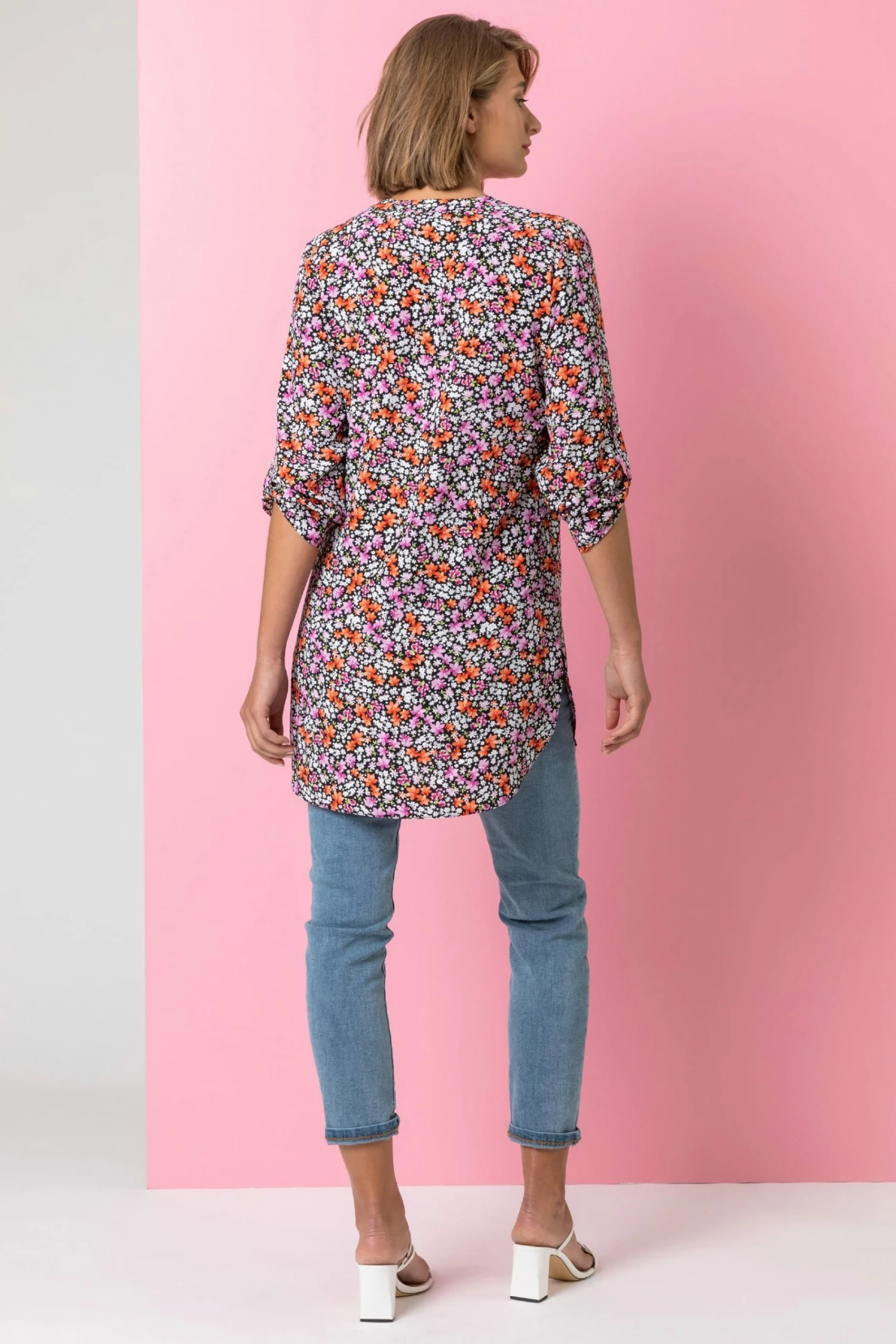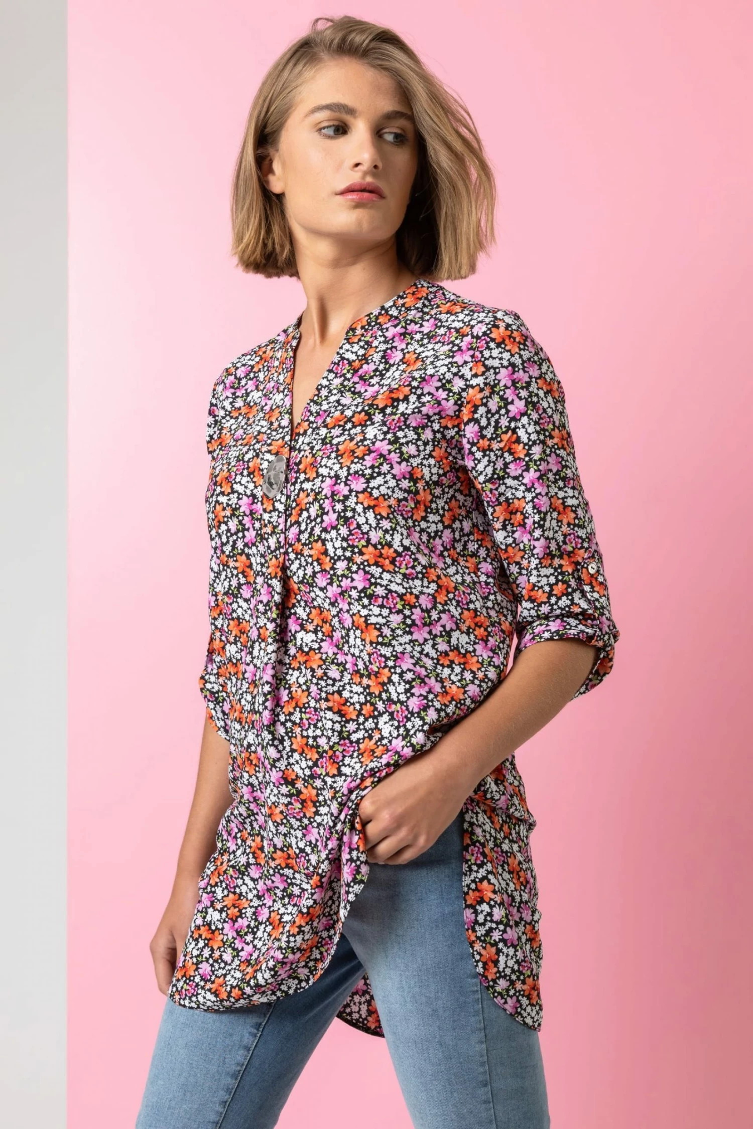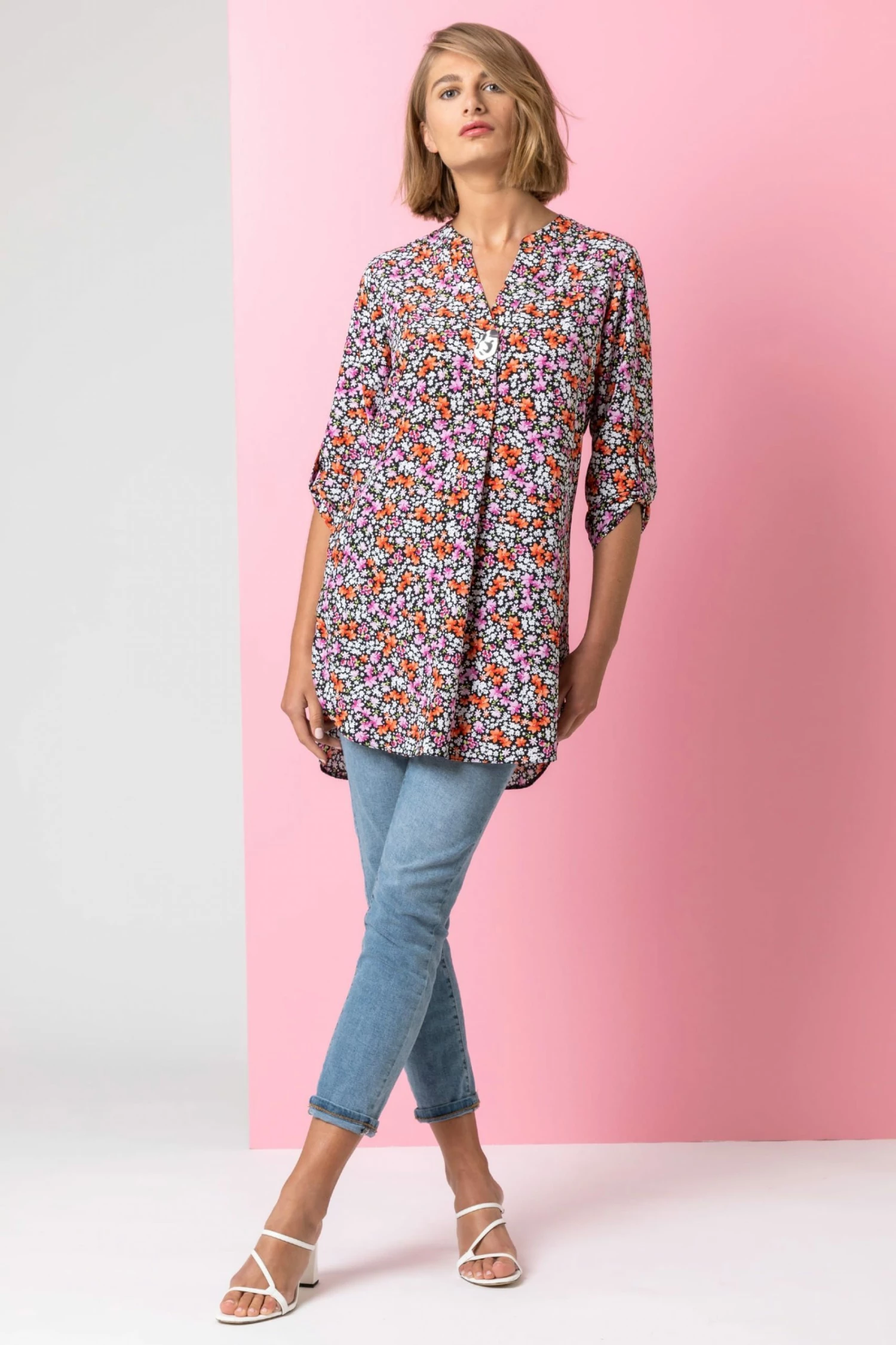 A sure-fire way to inject some print into your looks, this longline tunic top is sure to turn heads with its bold floral print. Featuring 3/4 length sleeves, a flattering notch v-neck and one shiny button, this top is halfway between smart and casual. Dress it up or down to suit your occasion. This timeless printed top can be paired with cropped trousers to really make a statement or toned down with a blazer and trousers for work.