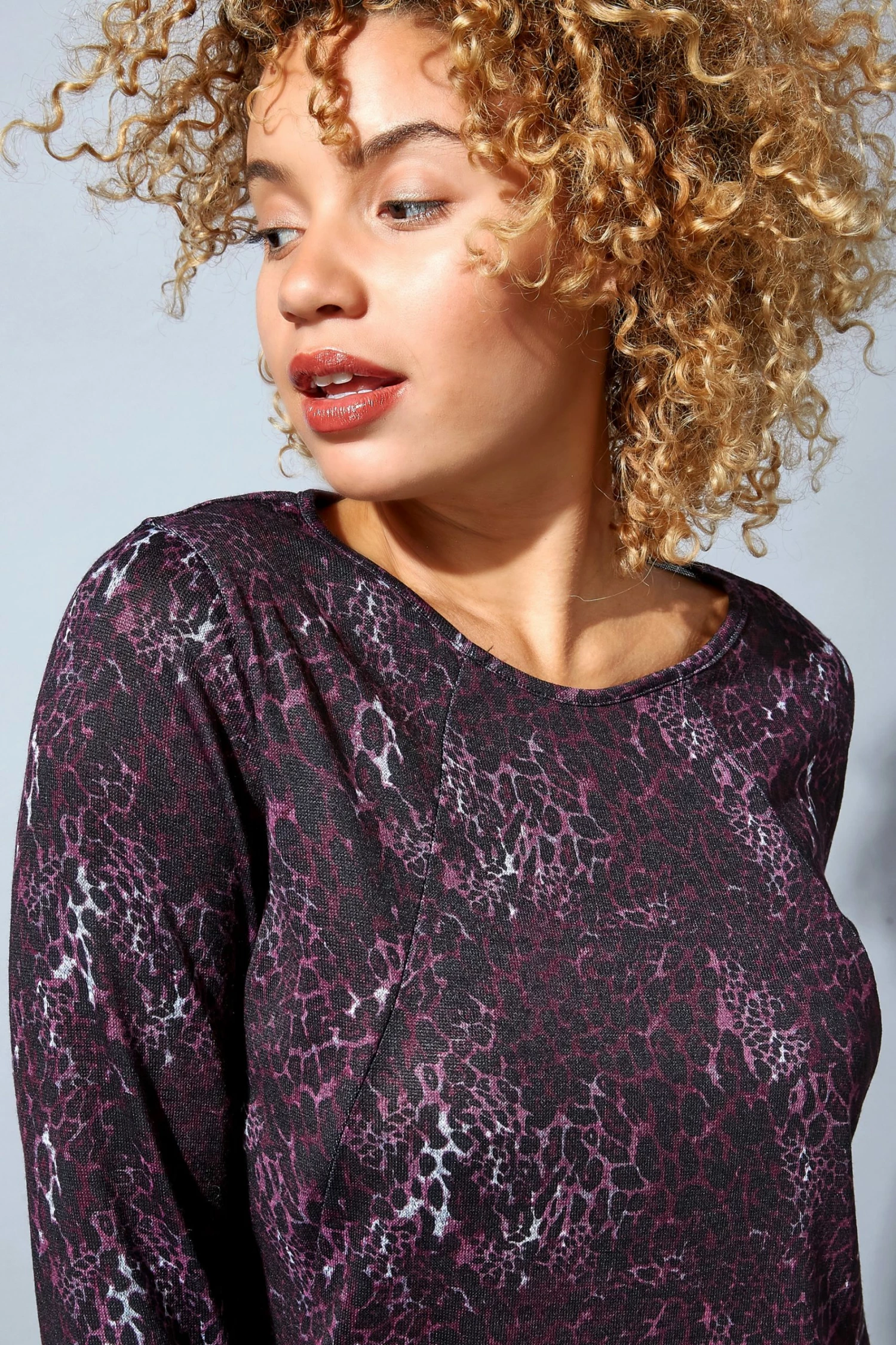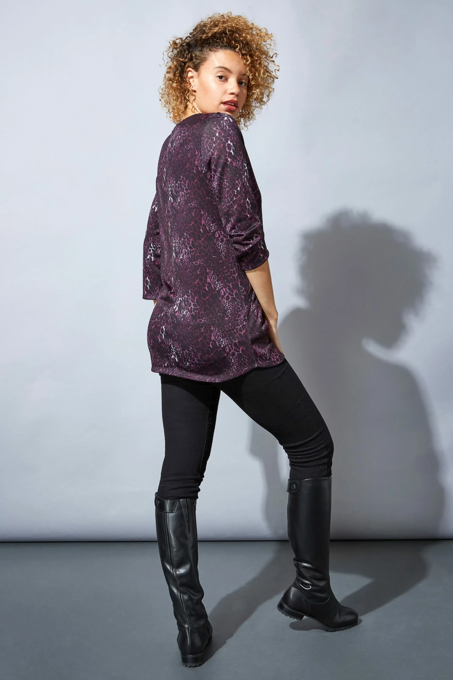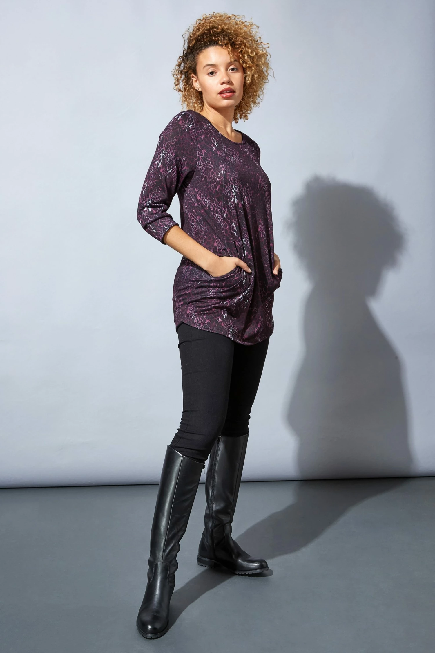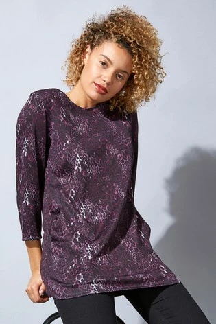 Stay on trend with this fabulous animal print jersey top. Finished with three quarter length sleeves, side pockets and a round neck, this comfortable piece will be the perfect addition to your wardrobe. Complement yours with dark trousers and light trainers for a perfect spring/summer look.