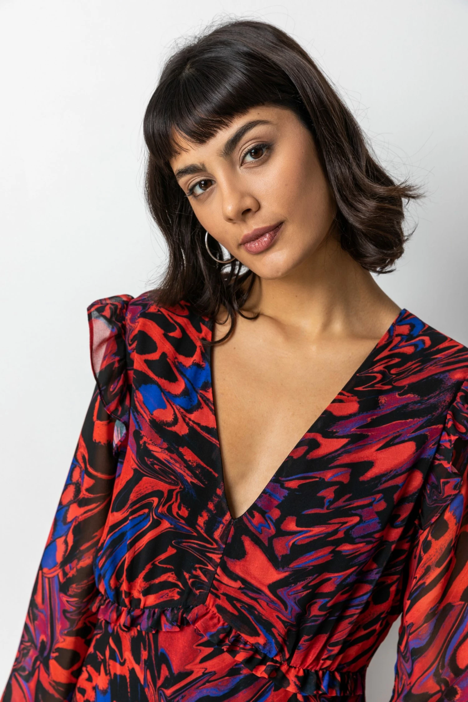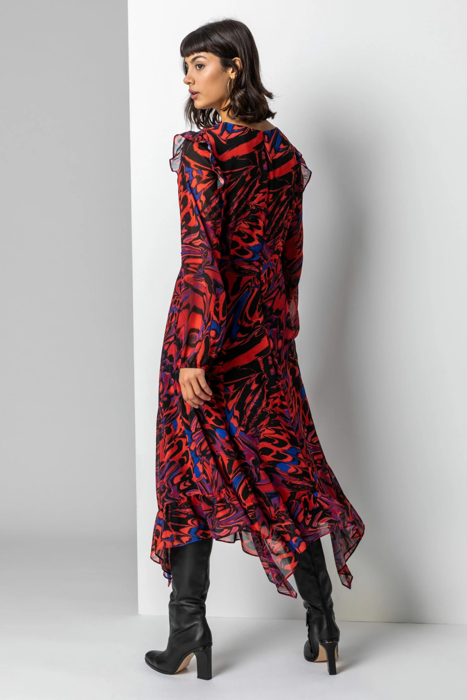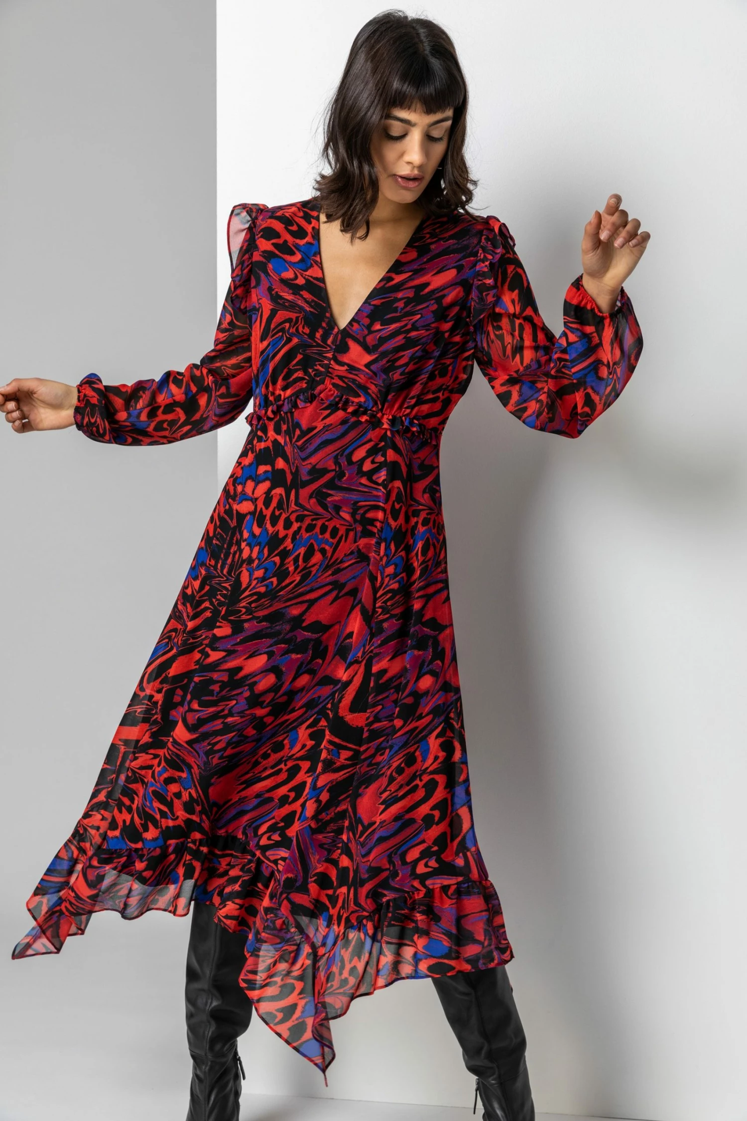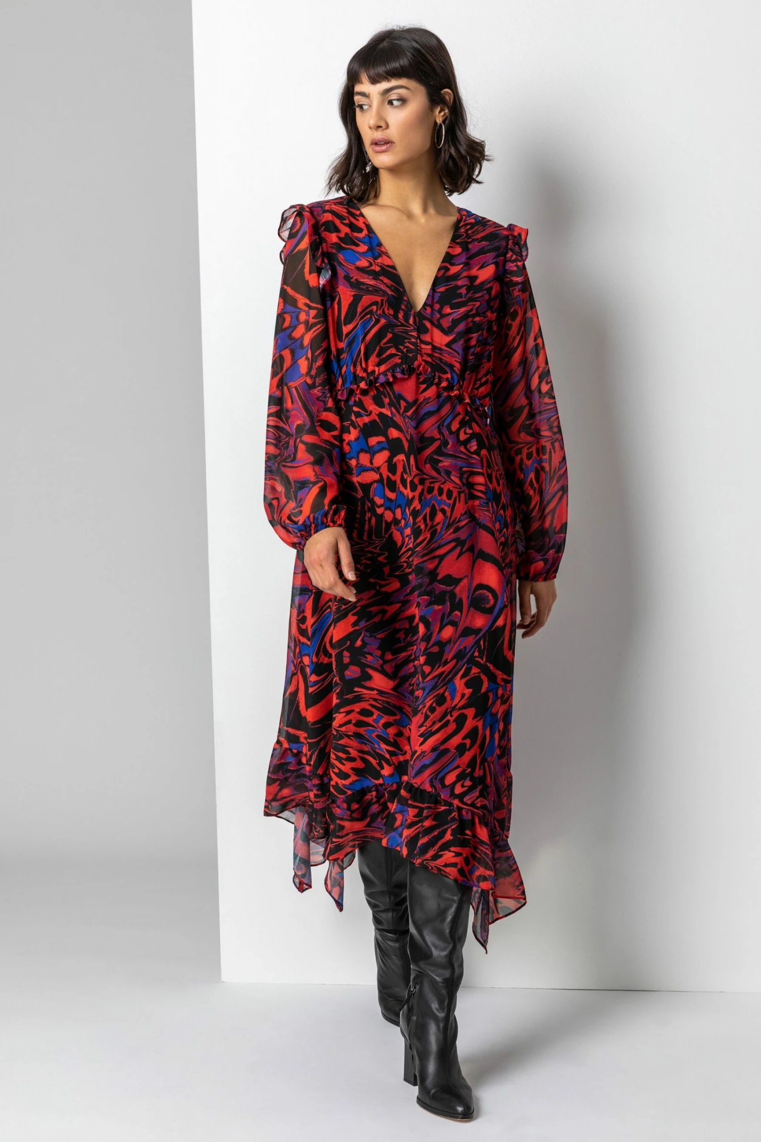 Layered to perfection in a silky chiffon material, this abstract butterfly midi dress is a colourful addition to our autumn winter collection. A plunging v-neckline makes this style so flattering on the bust whilst the trendy hanky hemline creates a feminine flow. A touch of frill detail at the shoulder and empire waist is so subtle and stylish. Perfect for any special occasions coming up, this style can easily take you from a dinner date with friends to a glamorous winter wedding.