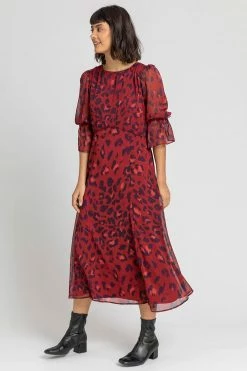 Look like utter perfection in our silky chiffon dress, adorned in beautiful leopard print. Cut to a modest midi length, this round-neck style has delicate 3/4 sleeves with a tie and frill detail to finish. Fastened to the back with a button keyhole fastening, you can wear this piece with ease. Add heels and clutch for a daytime occasion look or add a faux fur bolero for a luxurious evening attire outfit.