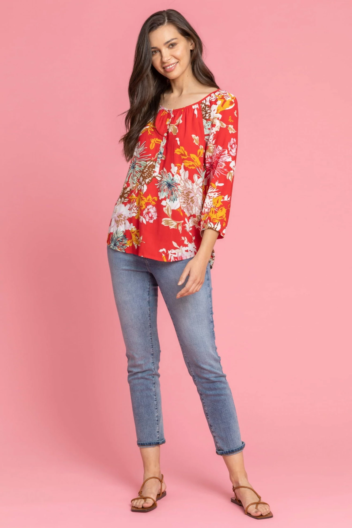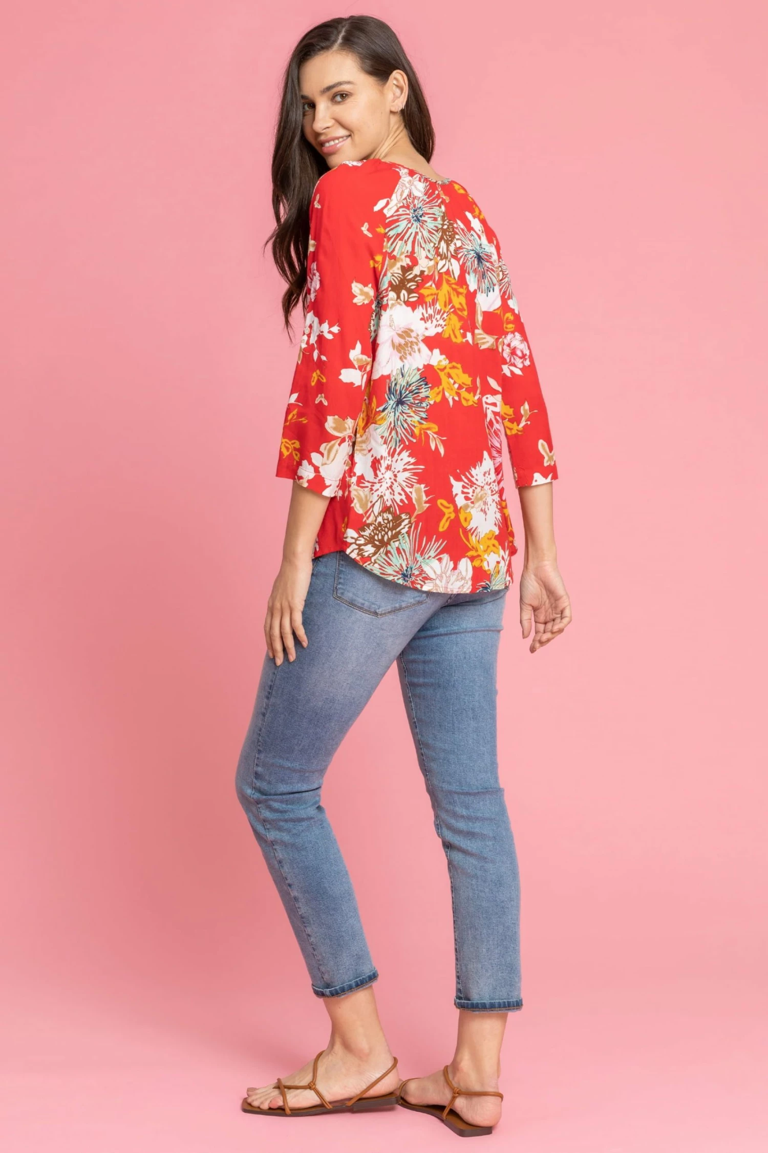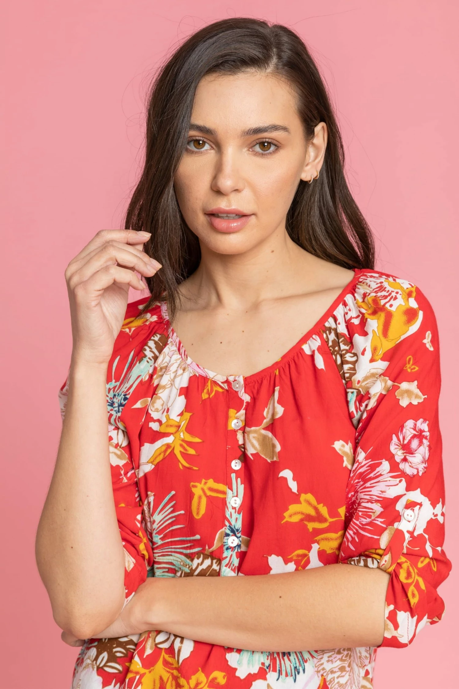 Feeling bold and brave? Flaunt your florals with this Hawaii inspired floral print top, perfect for the new upcoming season. Featuring a loose round neckline and 3/4 tab sleeve, this top is finished with button detailing and lightweight material. Perfect for your day to day wear, match with blue or white denim jeans and pumps for a casual summer look.