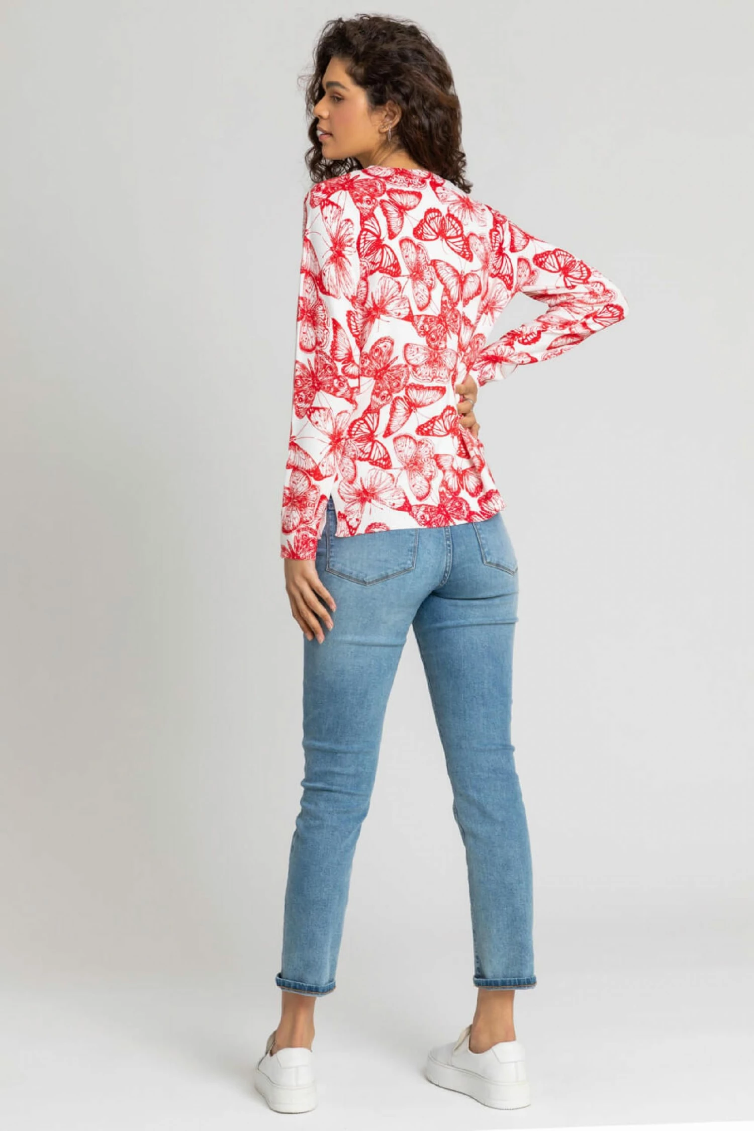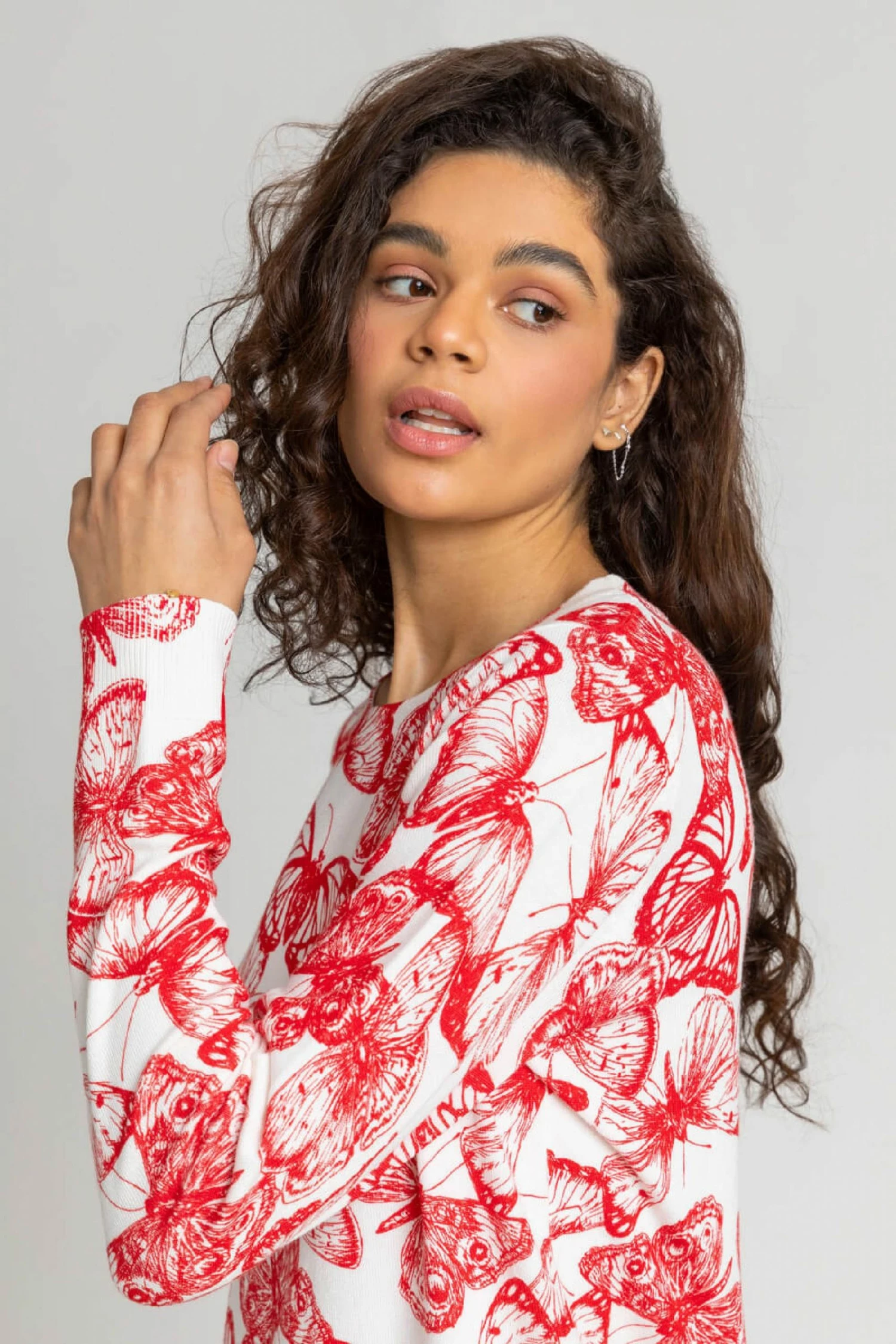 Enhance your essential wardrobe collection this spring summer with our beautiful butterfly print jumper, perfect for daywear. Featuring a round neckline this ivory coloured long sleeve pullover has a vibrant contrasting butterfly design to add some feminine charm to your casual style. Wear out casually or dress up for the evening with denim jeggings and slip-ons for a cute everyday look.