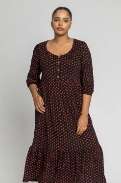This sweetheart neckline is so on-trend this season! This relaxed fit midi dress with horn button detailing and frill tiered hem is adorned with a ditsy red floral print. This 3/4 length sleeves are perfect for the autumn season, and the gathered waist is ultra flattering. Simple yet stylish, pair yours with boots to wear now, or with trainers in the warmer months to come!